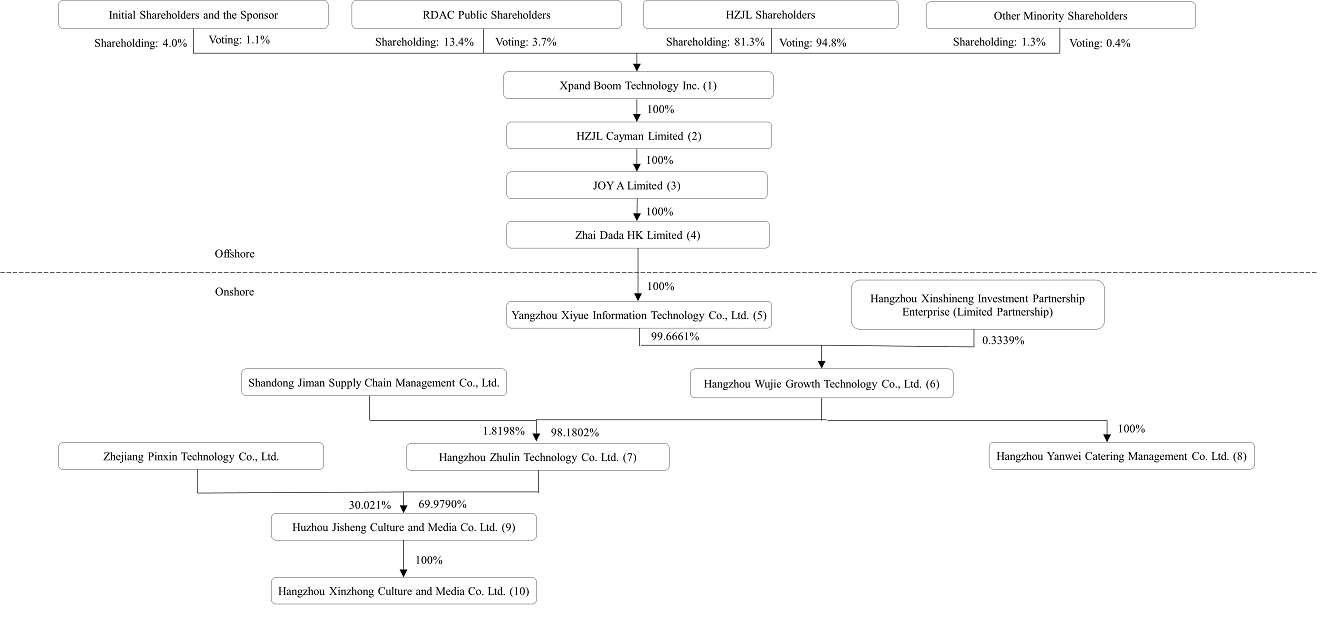 Assuming conversion of all RDAC securities held by RDAC’s initial shareholders (the “Initial Shareholders”), under (i) a no redemption scenario, (ii) a 25% redemption, (iii) a 50% redemptions, (iv) a 75% redemption, and (v) a maximum redemption scenario, immediately upon consummation of the Business Combination, as of the Closing, the Initial Shareholders will own 1,717,312 PubCo Ordinary Shares, representing approximately 3.84%, 3.96%, 4.09%, 4.24% and 4.36% of the then total issued and outstanding PubCo Ordinary Shares, respectively. The shareholders of HZJL (the “HZJL Shareholders”) will beneficially own 35,000,000 PubCo Ordinary Shares, representing approximately 78.03%, 80.62%, 83.38%, 86.34% and 88.90% of the then total issued and outstanding PubCo Ordinary Shares, respectively. You should read “Summary of the Proxy Statement/Prospectus — The Business Combination and the Merger Agreement” and “Unaudited Pro Forma Condensed Combined Financial Statements” for further information.