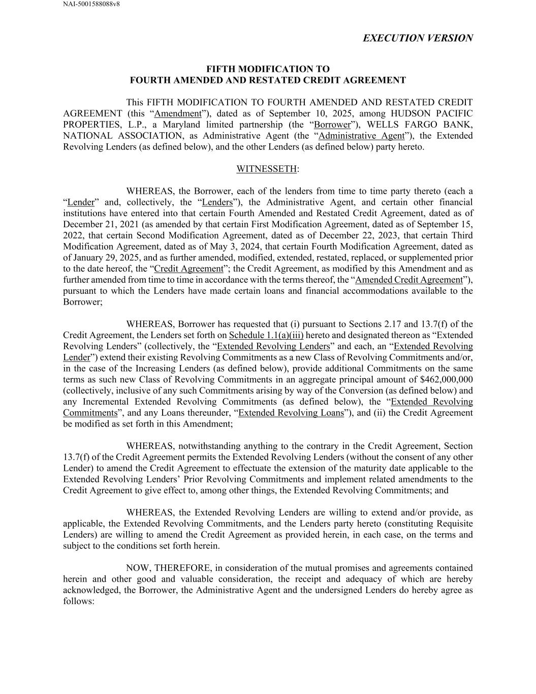 NAI-5001588088v8 EXECUTION VERSION FIFTH MODIFICATION TO FOURTH AMENDED AND RESTATED CREDIT AGREEMENT This FIFTH MODIFICATION TO FOURTH AMENDED AND RESTATED CREDIT AGREEMENT (this “Amendment”), dated as of September 10, 2025, among HUDSON PACIFIC PROPERTIES, L.P., a Maryland limited partnership (the “Borrower”), WELLS FARGO BANK, NATIONAL ASSOCIATION, as Administrative Agent (the “Administrative Agent”), the Extended Revolving Lenders (as defined below), and the other Lenders (as defined below) party hereto. WITNESSETH: WHEREAS, the Borrower, each of the lenders from time to time party thereto (each a “Lender” and, collectively, the “Lenders”), the Administrative Agent, and certain other financial institutions have entered into that certain Fourth Amended and Restated Credit Agreement, dated as of December 21, 2021 (as amended by that certain First Modification Agreement, dated as of September 15, 2022, that certain Second Modification Agreement, dated as of December 22, 2023, that certain Third Modification Agreement, dated as of May 3, 2024, that certain Fourth Modification Agreement, dated as of January 29, 2025, and as further amended, modified, extended, restated, replaced, or supplemented prior to the date hereof, the “Credit Agreement”; the Credit Agreement, as modified by this Amendment and as further amended from time to time in accordance with the terms thereof, the “Amended Credit Agreement”), pursuant to which the Lenders have made certain loans and financial accommodations available to the Borrower; WHEREAS, Borrower has requested that (i) pursuant to Sections 2.17 and 13.7(f) of the Credit Agreement, the Lenders set forth on Schedule 1.1(a)(iii) hereto and designated thereon as “Extended Revolving Lenders” (collectively, the “Extended Revolving Lenders” and each, an “Extended Revolving Lender”) extend their existing Revolving Commitments as a new Class of Revolving Commitments and/or, in the case of the Increasing Lenders (as defined below), provide additional Commitments on the same terms as such new Class of Revolving Commitments in an aggregate principal amount of $462,000,000 (collectively, inclusive of any such Commitments arising by way of the Conversion (as defined below) and any Incremental Extended Revolving Commitments (as defined below), the “Extended Revolving Commitments”, and any Loans thereunder, “Extended Revolving Loans”), and (ii) the Credit Agreement be modified as set forth in this Amendment; WHEREAS, notwithstanding anything to the contrary in the Credit Agreement, Section 13.7(f) of the Credit Agreement permits the Extended Revolving Lenders (without the consent of any other Lender) to amend the Credit Agreement to effectuate the extension of the maturity date applicable to the Extended Revolving Lenders’ Prior Revolving Commitments and implement related amendments to the Credit Agreement to give effect to, among other things, the Extended Revolving Commitments; and WHEREAS, the Extended Revolving Lenders are willing to extend and/or provide, as applicable, the Extended Revolving Commitments, and the Lenders party hereto (constituting Requisite Lenders) are willing to amend the Credit Agreement as provided herein, in each case, on the terms and subject to the conditions set forth herein. NOW, THEREFORE, in consideration of the mutual promises and agreements contained herein and other good and valuable consideration, the receipt and adequacy of which are hereby acknowledged, the Borrower, the Administrative Agent and the undersigned Lenders do hereby agree as follows: