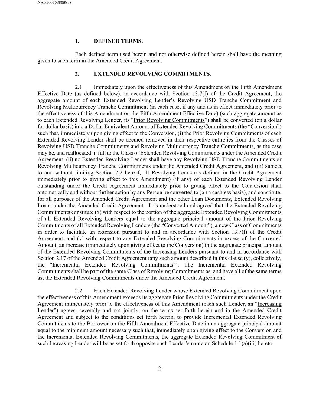 NAI-5001588088v8 -2- 1. DEFINED TERMS. Each defined term used herein and not otherwise defined herein shall have the meaning given to such term in the Amended Credit Agreement. 2. EXTENDED REVOLVING COMMITMENTS. 2.1 Immediately upon the effectiveness of this Amendment on the Fifth Amendment Effective Date (as defined below), in accordance with Section 13.7(f) of the Credit Agreement, the aggregate amount of each Extended Revolving Lender’s Revolving USD Tranche Commitment and Revolving Multicurrency Tranche Commitment (in each case, if any and as in effect immediately prior to the effectiveness of this Amendment on the Fifth Amendment Effective Date) (such aggregate amount as to each Extended Revolving Lender, its “Prior Revolving Commitments”) shall be converted (on a dollar for dollar basis) into a Dollar Equivalent Amount of Extended Revolving Commitments (the “Conversion”) such that, immediately upon giving effect to the Conversion, (i) the Prior Revolving Commitments of each Extended Revolving Lender shall be deemed removed in their respective entireties from the Classes of Revolving USD Tranche Commitments and Revolving Multicurrency Tranche Commitments, as the case may be, and reallocated in full to the Class of Extended Revolving Commitments under the Amended Credit Agreement, (ii) no Extended Revolving Lender shall have any Revolving USD Tranche Commitments or Revolving Multicurrency Tranche Commitments under the Amended Credit Agreement, and (iii) subject to and without limiting Section 7.2 hereof, all Revolving Loans (as defined in the Credit Agreement immediately prior to giving effect to this Amendment) (if any) of each Extended Revolving Lender outstanding under the Credit Agreement immediately prior to giving effect to the Conversion shall automatically and without further action by any Person be converted to (on a cashless basis), and constitute, for all purposes of the Amended Credit Agreement and the other Loan Documents, Extended Revolving Loans under the Amended Credit Agreement. It is understood and agreed that the Extended Revolving Commitments constitute (x) with respect to the portion of the aggregate Extended Revolving Commitments of all Extended Revolving Lenders equal to the aggregate principal amount of the Prior Revolving Commitments of all Extended Revolving Lenders (the “Converted Amount”), a new Class of Commitments in order to facilitate an extension pursuant to and in accordance with Section 13.7(f) of the Credit Agreement, and (y) with respect to any Extended Revolving Commitments in excess of the Converted Amount, an increase (immediately upon giving effect to the Conversion) in the aggregate principal amount of the Extended Revolving Commitments of the Increasing Lenders pursuant to and in accordance with Section 2.17 of the Amended Credit Agreement (any such amount described in this clause (y), collectively, the “Incremental Extended Revolving Commitments”). The Incremental Extended Revolving Commitments shall be part of the same Class of Revolving Commitments as, and have all of the same terms as, the Extended Revolving Commitments under the Amended Credit Agreement. 2.2 Each Extended Revolving Lender whose Extended Revolving Commitment upon the effectiveness of this Amendment exceeds its aggregate Prior Revolving Commitments under the Credit Agreement immediately prior to the effectiveness of this Amendment (each such Lender, an “Increasing Lender”) agrees, severally and not jointly, on the terms set forth herein and in the Amended Credit Agreement and subject to the conditions set forth herein, to provide Incremental Extended Revolving Commitments to the Borrower on the Fifth Amendment Effective Date in an aggregate principal amount equal to the minimum amount necessary such that, immediately upon giving effect to the Conversion and the Incremental Extended Revolving Commitments, the aggregate Extended Revolving Commitment of such Increasing Lender will be as set forth opposite such Lender’s name on Schedule 1.1(a)(iii) hereto.