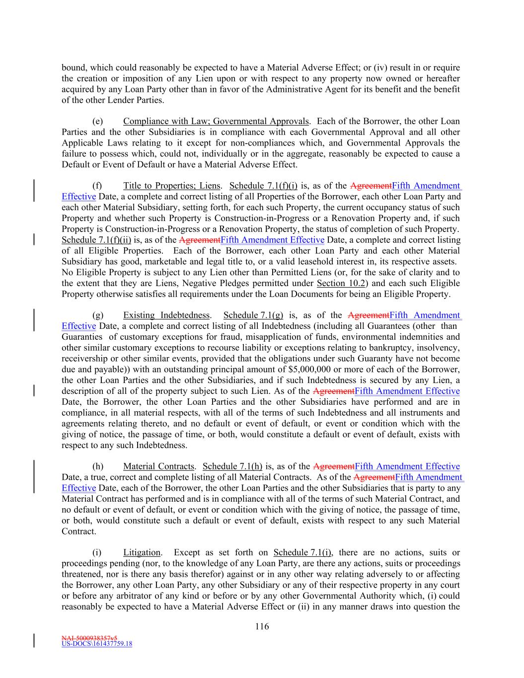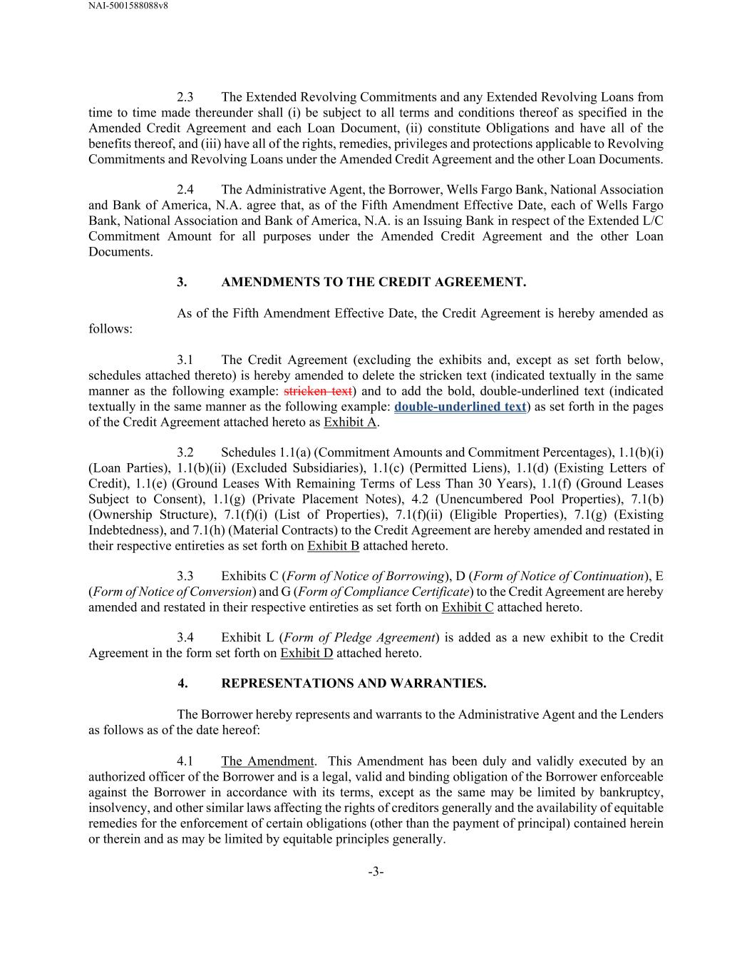 NAI-5001588088v8 -3- 2.3 The Extended Revolving Commitments and any Extended Revolving Loans from time to time made thereunder shall (i) be subject to all terms and conditions thereof as specified in the Amended Credit Agreement and each Loan Document, (ii) constitute Obligations and have all of the benefits thereof, and (iii) have all of the rights, remedies, privileges and protections applicable to Revolving Commitments and Revolving Loans under the Amended Credit Agreement and the other Loan Documents. 2.4 The Administrative Agent, the Borrower, Wells Fargo Bank, National Association and Bank of America, N.A. agree that, as of the Fifth Amendment Effective Date, each of Wells Fargo Bank, National Association and Bank of America, N.A. is an Issuing Bank in respect of the Extended L/C Commitment Amount for all purposes under the Amended Credit Agreement and the other Loan Documents. 3. AMENDMENTS TO THE CREDIT AGREEMENT. As of the Fifth Amendment Effective Date, the Credit Agreement is hereby amended as follows: 3.1 The Credit Agreement (excluding the exhibits and, except as set forth below, schedules attached thereto) is hereby amended to delete the stricken text (indicated textually in the same manner as the following example: stricken text) and to add the bold, double-underlined text (indicated textually in the same manner as the following example: double-underlined text) as set forth in the pages of the Credit Agreement attached hereto as Exhibit A. 3.2 Schedules 1.1(a) (Commitment Amounts and Commitment Percentages), 1.1(b)(i) (Loan Parties), 1.1(b)(ii) (Excluded Subsidiaries), 1.1(c) (Permitted Liens), 1.1(d) (Existing Letters of Credit), 1.1(e) (Ground Leases With Remaining Terms of Less Than 30 Years), 1.1(f) (Ground Leases Subject to Consent), 1.1(g) (Private Placement Notes), 4.2 (Unencumbered Pool Properties), 7.1(b) (Ownership Structure), 7.1(f)(i) (List of Properties), 7.1(f)(ii) (Eligible Properties), 7.1(g) (Existing Indebtedness), and 7.1(h) (Material Contracts) to the Credit Agreement are hereby amended and restated in their respective entireties as set forth on Exhibit B attached hereto. 3.3 Exhibits C (Form of Notice of Borrowing), D (Form of Notice of Continuation), E (Form of Notice of Conversion) and G (Form of Compliance Certificate) to the Credit Agreement are hereby amended and restated in their respective entireties as set forth on Exhibit C attached hereto. 3.4 Exhibit L (Form of Pledge Agreement) is added as a new exhibit to the Credit Agreement in the form set forth on Exhibit D attached hereto. 4. REPRESENTATIONS AND WARRANTIES. The Borrower hereby represents and warrants to the Administrative Agent and the Lenders as follows as of the date hereof: 4.1 The Amendment. This Amendment has been duly and validly executed by an authorized officer of the Borrower and is a legal, valid and binding obligation of the Borrower enforceable against the Borrower in accordance with its terms, except as the same may be limited by bankruptcy, insolvency, and other similar laws affecting the rights of creditors generally and the availability of equitable remedies for the enforcement of certain obligations (other than the payment of principal) contained herein or therein and as may be limited by equitable principles generally.