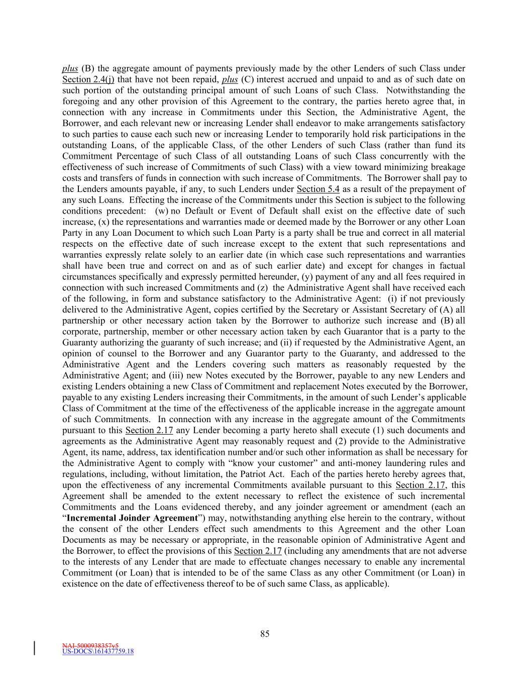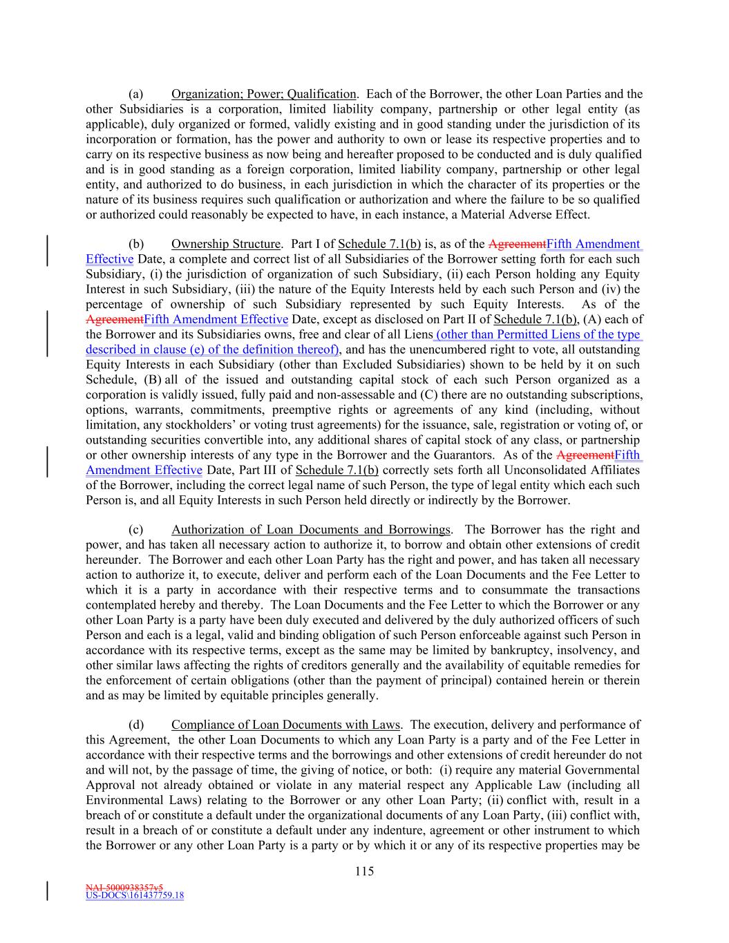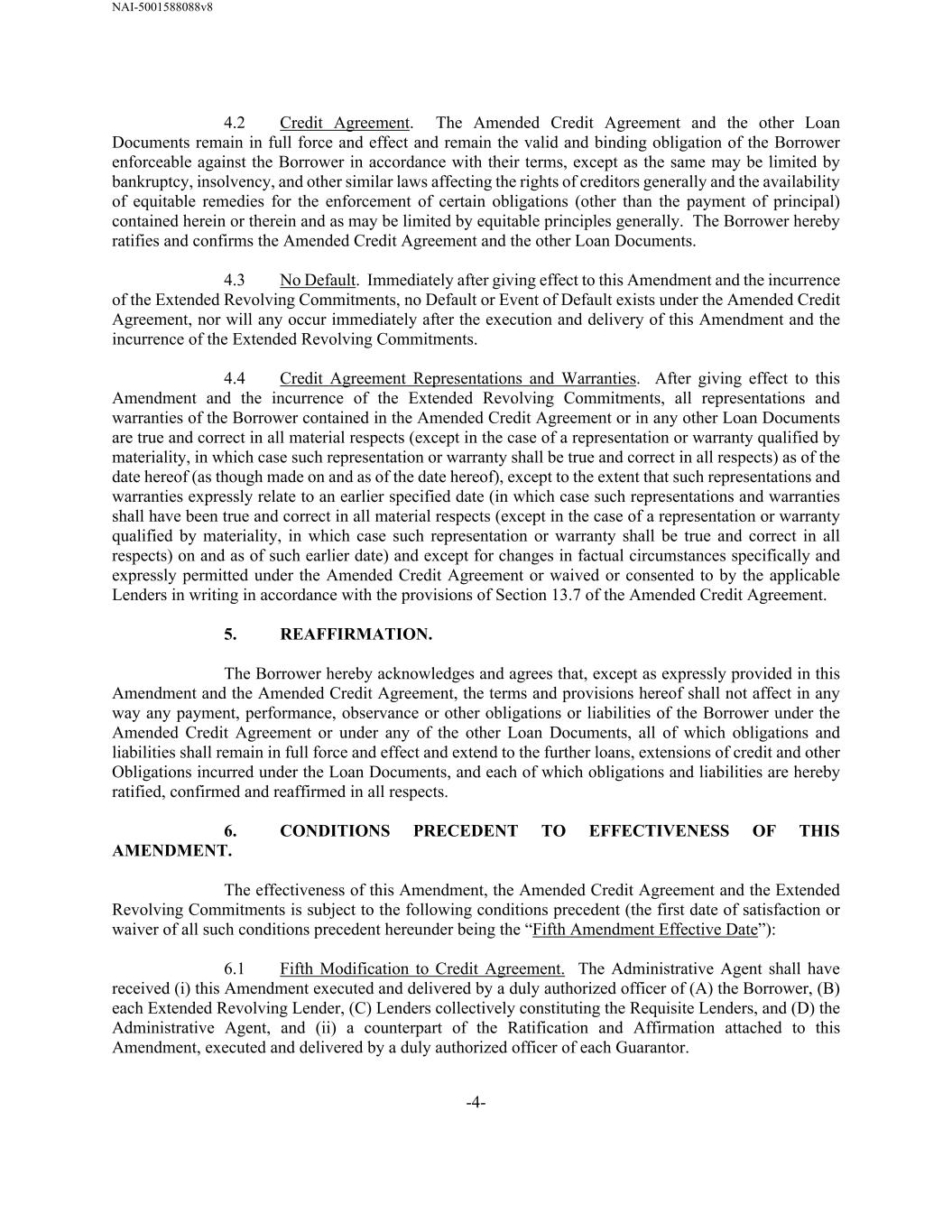 NAI-5001588088v8 -4- 4.2 Credit Agreement. The Amended Credit Agreement and the other Loan Documents remain in full force and effect and remain the valid and binding obligation of the Borrower enforceable against the Borrower in accordance with their terms, except as the same may be limited by bankruptcy, insolvency, and other similar laws affecting the rights of creditors generally and the availability of equitable remedies for the enforcement of certain obligations (other than the payment of principal) contained herein or therein and as may be limited by equitable principles generally. The Borrower hereby ratifies and confirms the Amended Credit Agreement and the other Loan Documents. 4.3 No Default. Immediately after giving effect to this Amendment and the incurrence of the Extended Revolving Commitments, no Default or Event of Default exists under the Amended Credit Agreement, nor will any occur immediately after the execution and delivery of this Amendment and the incurrence of the Extended Revolving Commitments. 4.4 Credit Agreement Representations and Warranties. After giving effect to this Amendment and the incurrence of the Extended Revolving Commitments, all representations and warranties of the Borrower contained in the Amended Credit Agreement or in any other Loan Documents are true and correct in all material respects (except in the case of a representation or warranty qualified by materiality, in which case such representation or warranty shall be true and correct in all respects) as of the date hereof (as though made on and as of the date hereof), except to the extent that such representations and warranties expressly relate to an earlier specified date (in which case such representations and warranties shall have been true and correct in all material respects (except in the case of a representation or warranty qualified by materiality, in which case such representation or warranty shall be true and correct in all respects) on and as of such earlier date) and except for changes in factual circumstances specifically and expressly permitted under the Amended Credit Agreement or waived or consented to by the applicable Lenders in writing in accordance with the provisions of Section 13.7 of the Amended Credit Agreement. 5. REAFFIRMATION. The Borrower hereby acknowledges and agrees that, except as expressly provided in this Amendment and the Amended Credit Agreement, the terms and provisions hereof shall not affect in any way any payment, performance, observance or other obligations or liabilities of the Borrower under the Amended Credit Agreement or under any of the other Loan Documents, all of which obligations and liabilities shall remain in full force and effect and extend to the further loans, extensions of credit and other Obligations incurred under the Loan Documents, and each of which obligations and liabilities are hereby ratified, confirmed and reaffirmed in all respects. 6. CONDITIONS PRECEDENT TO EFFECTIVENESS OF THIS AMENDMENT. The effectiveness of this Amendment, the Amended Credit Agreement and the Extended Revolving Commitments is subject to the following conditions precedent (the first date of satisfaction or waiver of all such conditions precedent hereunder being the “Fifth Amendment Effective Date”): 6.1 Fifth Modification to Credit Agreement. The Administrative Agent shall have received (i) this Amendment executed and delivered by a duly authorized officer of (A) the Borrower, (B) each Extended Revolving Lender, (C) Lenders collectively constituting the Requisite Lenders, and (D) the Administrative Agent, and (ii) a counterpart of the Ratification and Affirmation attached to this Amendment, executed and delivered by a duly authorized officer of each Guarantor.