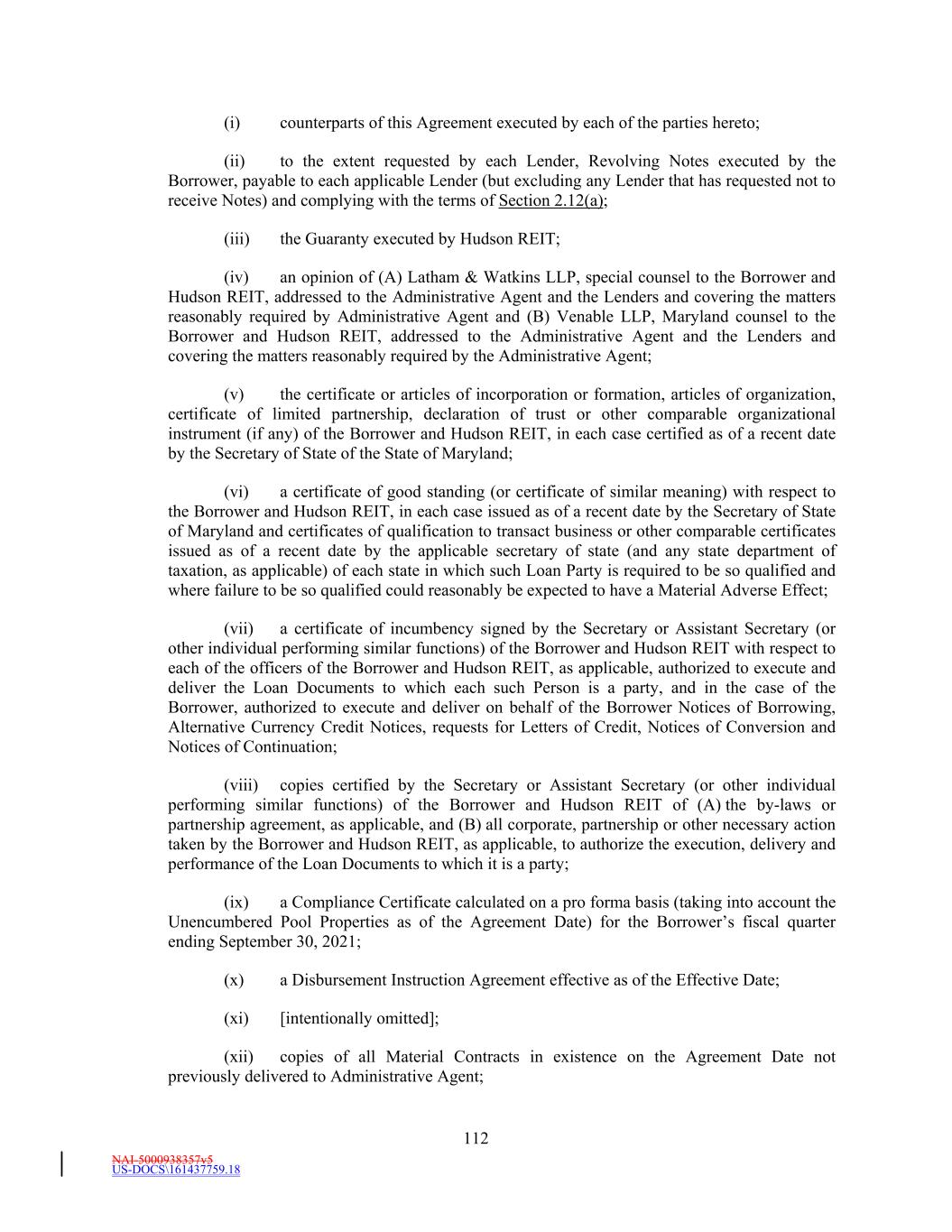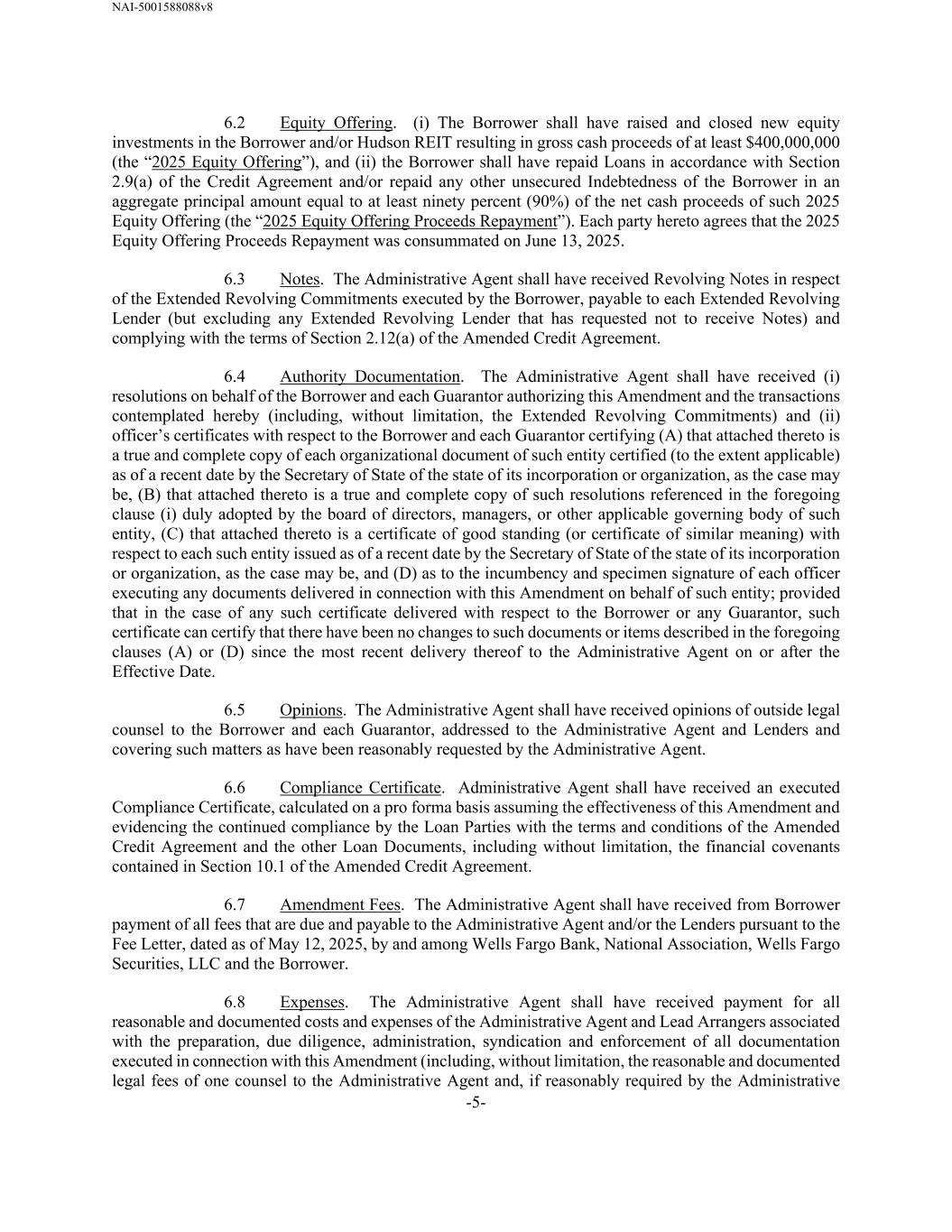 NAI-5001588088v8 -5- 6.2 Equity Offering. (i) The Borrower shall have raised and closed new equity investments in the Borrower and/or Hudson REIT resulting in gross cash proceeds of at least $400,000,000 (the “2025 Equity Offering”), and (ii) the Borrower shall have repaid Loans in accordance with Section 2.9(a) of the Credit Agreement and/or repaid any other unsecured Indebtedness of the Borrower in an aggregate principal amount equal to at least ninety percent (90%) of the net cash proceeds of such 2025 Equity Offering (the “2025 Equity Offering Proceeds Repayment”). Each party hereto agrees that the 2025 Equity Offering Proceeds Repayment was consummated on June 13, 2025. 6.3 Notes. The Administrative Agent shall have received Revolving Notes in respect of the Extended Revolving Commitments executed by the Borrower, payable to each Extended Revolving Lender (but excluding any Extended Revolving Lender that has requested not to receive Notes) and complying with the terms of Section 2.12(a) of the Amended Credit Agreement. 6.4 Authority Documentation. The Administrative Agent shall have received (i) resolutions on behalf of the Borrower and each Guarantor authorizing this Amendment and the transactions contemplated hereby (including, without limitation, the Extended Revolving Commitments) and (ii) officer’s certificates with respect to the Borrower and each Guarantor certifying (A) that attached thereto is a true and complete copy of each organizational document of such entity certified (to the extent applicable) as of a recent date by the Secretary of State of the state of its incorporation or organization, as the case may be, (B) that attached thereto is a true and complete copy of such resolutions referenced in the foregoing clause (i) duly adopted by the board of directors, managers, or other applicable governing body of such entity, (C) that attached thereto is a certificate of good standing (or certificate of similar meaning) with respect to each such entity issued as of a recent date by the Secretary of State of the state of its incorporation or organization, as the case may be, and (D) as to the incumbency and specimen signature of each officer executing any documents delivered in connection with this Amendment on behalf of such entity; provided that in the case of any such certificate delivered with respect to the Borrower or any Guarantor, such certificate can certify that there have been no changes to such documents or items described in the foregoing clauses (A) or (D) since the most recent delivery thereof to the Administrative Agent on or after the Effective Date. 6.5 Opinions. The Administrative Agent shall have received opinions of outside legal counsel to the Borrower and each Guarantor, addressed to the Administrative Agent and Lenders and covering such matters as have been reasonably requested by the Administrative Agent. 6.6 Compliance Certificate. Administrative Agent shall have received an executed Compliance Certificate, calculated on a pro forma basis assuming the effectiveness of this Amendment and evidencing the continued compliance by the Loan Parties with the terms and conditions of the Amended Credit Agreement and the other Loan Documents, including without limitation, the financial covenants contained in Section 10.1 of the Amended Credit Agreement. 6.7 Amendment Fees. The Administrative Agent shall have received from Borrower payment of all fees that are due and payable to the Administrative Agent and/or the Lenders pursuant to the Fee Letter, dated as of May 12, 2025, by and among Wells Fargo Bank, National Association, Wells Fargo Securities, LLC and the Borrower. 6.8 Expenses. The Administrative Agent shall have received payment for all reasonable and documented costs and expenses of the Administrative Agent and Lead Arrangers associated with the preparation, due diligence, administration, syndication and enforcement of all documentation executed in connection with this Amendment (including, without limitation, the reasonable and documented legal fees of one counsel to the Administrative Agent and, if reasonably required by the Administrative