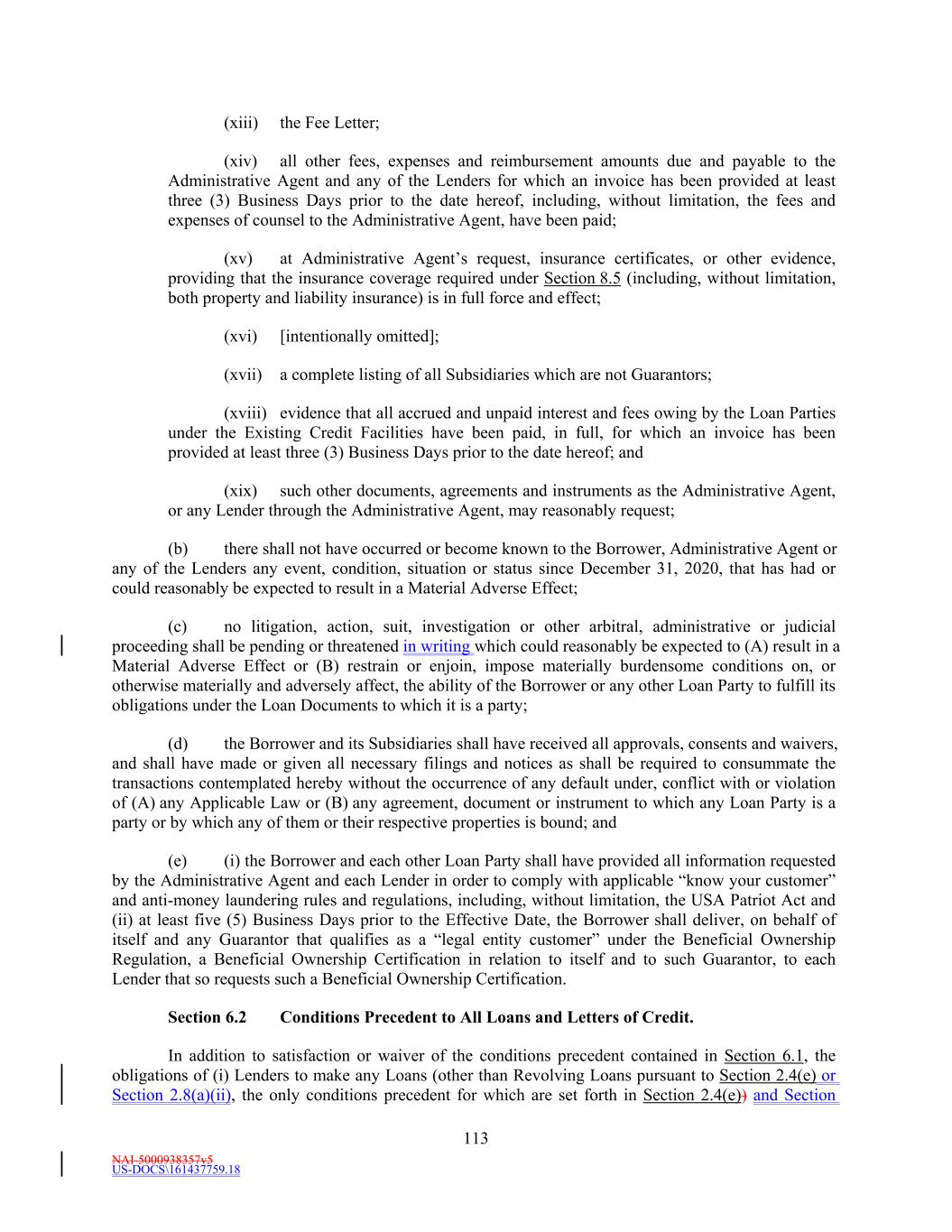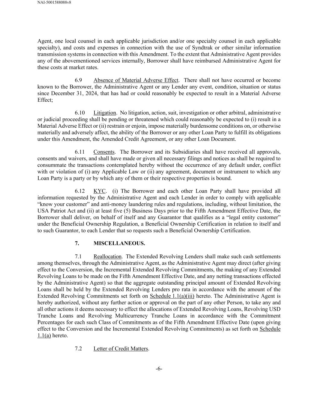 NAI-5001588088v8 -6- Agent, one local counsel in each applicable jurisdiction and/or one specialty counsel in each applicable specialty), and costs and expenses in connection with the use of Syndtrak or other similar information transmission systems in connection with this Amendment. To the extent that Administrative Agent provides any of the abovementioned services internally, Borrower shall have reimbursed Administrative Agent for these costs at market rates. 6.9 Absence of Material Adverse Effect. There shall not have occurred or become known to the Borrower, the Administrative Agent or any Lender any event, condition, situation or status since December 31, 2024, that has had or could reasonably be expected to result in a Material Adverse Effect; 6.10 Litigation. No litigation, action, suit, investigation or other arbitral, administrative or judicial proceeding shall be pending or threatened which could reasonably be expected to (i) result in a Material Adverse Effect or (ii) restrain or enjoin, impose materially burdensome conditions on, or otherwise materially and adversely affect, the ability of the Borrower or any other Loan Party to fulfill its obligations under this Amendment, the Amended Credit Agreement, or any other Loan Document. 6.11 Consents. The Borrower and its Subsidiaries shall have received all approvals, consents and waivers, and shall have made or given all necessary filings and notices as shall be required to consummate the transactions contemplated hereby without the occurrence of any default under, conflict with or violation of (i) any Applicable Law or (ii) any agreement, document or instrument to which any Loan Party is a party or by which any of them or their respective properties is bound. 6.12 KYC. (i) The Borrower and each other Loan Party shall have provided all information requested by the Administrative Agent and each Lender in order to comply with applicable “know your customer” and anti-money laundering rules and regulations, including, without limitation, the USA Patriot Act and (ii) at least five (5) Business Days prior to the Fifth Amendment Effective Date, the Borrower shall deliver, on behalf of itself and any Guarantor that qualifies as a “legal entity customer” under the Beneficial Ownership Regulation, a Beneficial Ownership Certification in relation to itself and to such Guarantor, to each Lender that so requests such a Beneficial Ownership Certification. 7. MISCELLANEOUS. 7.1 Reallocation. The Extended Revolving Lenders shall make such cash settlements among themselves, through the Administrative Agent, as the Administrative Agent may direct (after giving effect to the Conversion, the Incremental Extended Revolving Commitments, the making of any Extended Revolving Loans to be made on the Fifth Amendment Effective Date, and any netting transactions effected by the Administrative Agent) so that the aggregate outstanding principal amount of Extended Revolving Loans shall be held by the Extended Revolving Lenders pro rata in accordance with the amount of the Extended Revolving Commitments set forth on Schedule 1.1(a)(iii) hereto. The Administrative Agent is hereby authorized, without any further action or approval on the part of any other Person, to take any and all other actions it deems necessary to effect the allocations of Extended Revolving Loans, Revolving USD Tranche Loans and Revolving Multicurrency Tranche Loans in accordance with the Commitment Percentages for each such Class of Commitments as of the Fifth Amendment Effective Date (upon giving effect to the Conversion and the Incremental Extended Revolving Commitments) as set forth on Schedule 1.1(a) hereto. 7.2 Letter of Credit Matters.