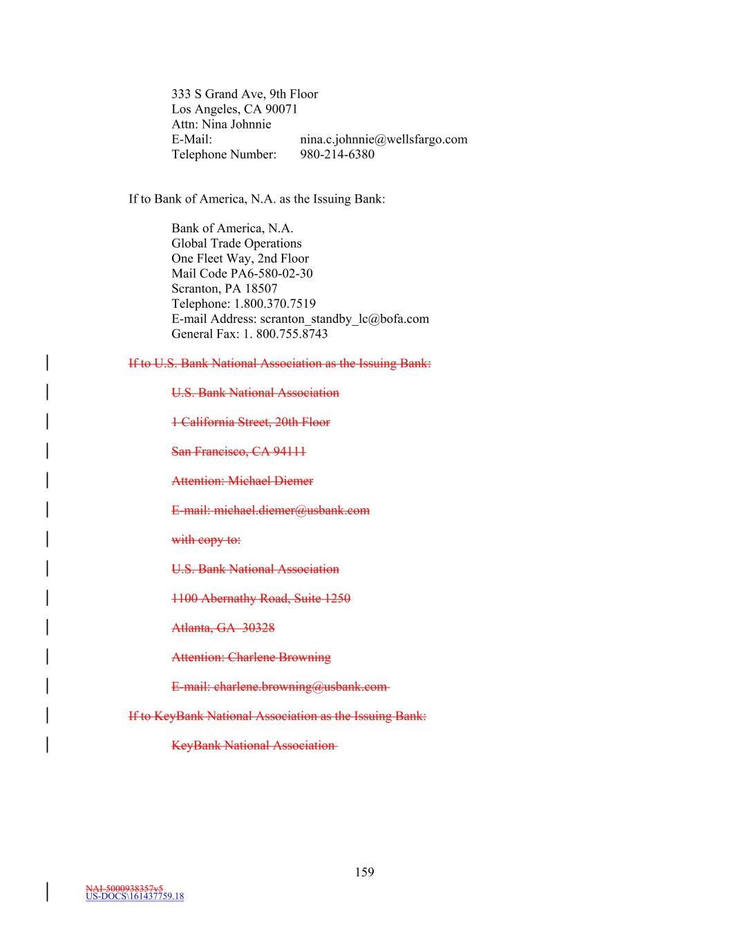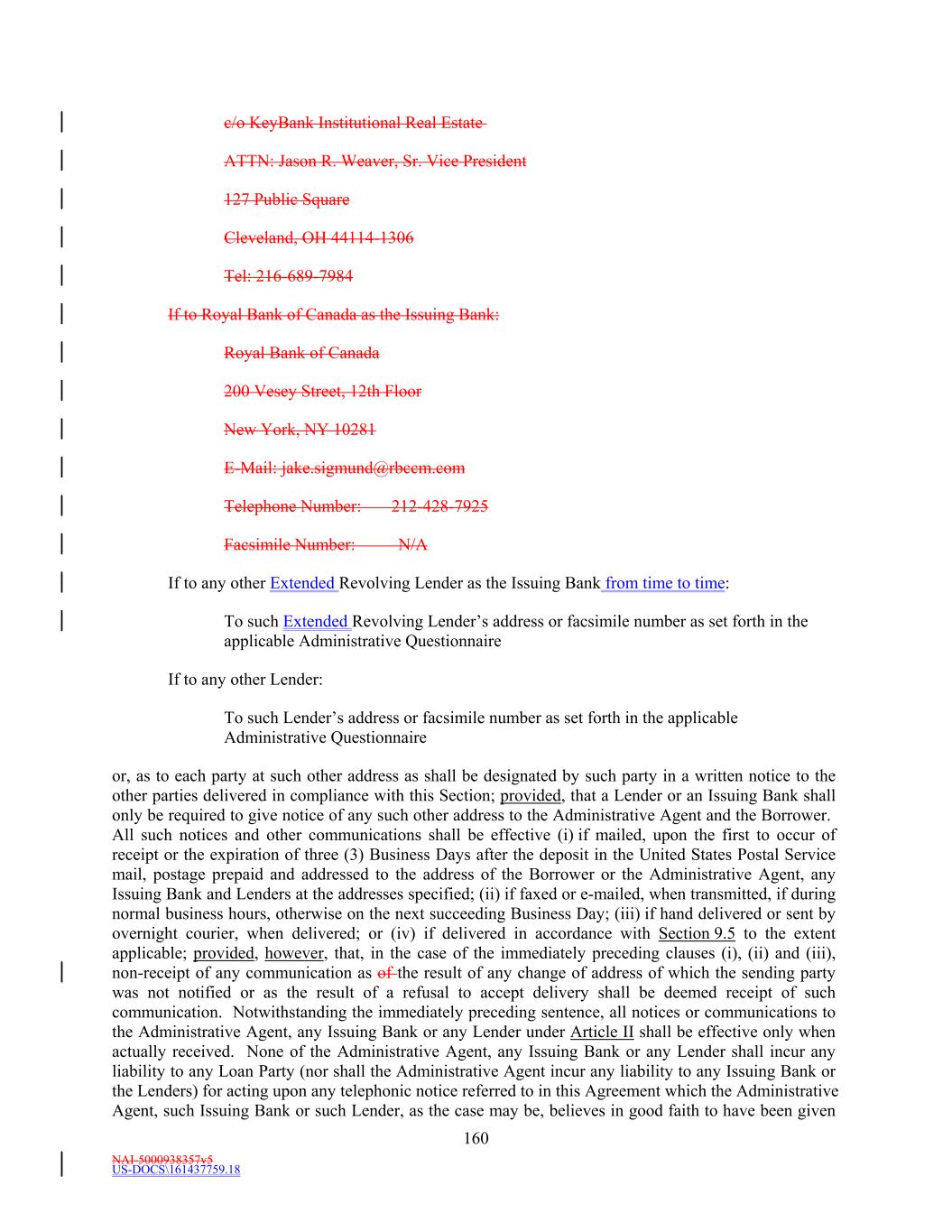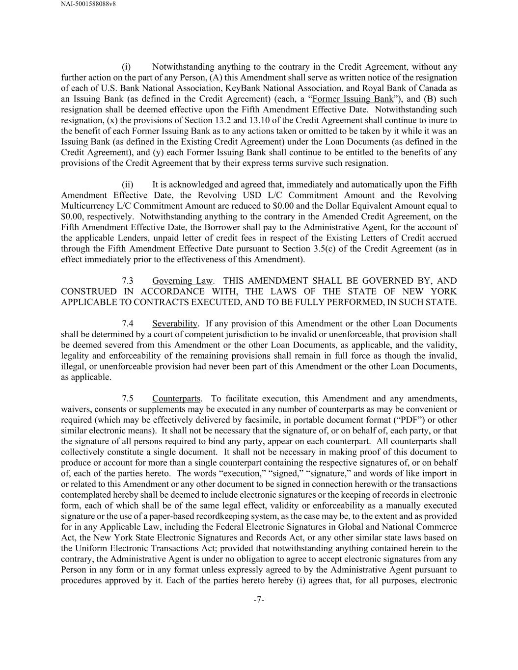 NAI-5001588088v8 -7- (i) Notwithstanding anything to the contrary in the Credit Agreement, without any further action on the part of any Person, (A) this Amendment shall serve as written notice of the resignation of each of U.S. Bank National Association, KeyBank National Association, and Royal Bank of Canada as an Issuing Bank (as defined in the Credit Agreement) (each, a “Former Issuing Bank”), and (B) such resignation shall be deemed effective upon the Fifth Amendment Effective Date. Notwithstanding such resignation, (x) the provisions of Section 13.2 and 13.10 of the Credit Agreement shall continue to inure to the benefit of each Former Issuing Bank as to any actions taken or omitted to be taken by it while it was an Issuing Bank (as defined in the Existing Credit Agreement) under the Loan Documents (as defined in the Credit Agreement), and (y) each Former Issuing Bank shall continue to be entitled to the benefits of any provisions of the Credit Agreement that by their express terms survive such resignation. (ii) It is acknowledged and agreed that, immediately and automatically upon the Fifth Amendment Effective Date, the Revolving USD L/C Commitment Amount and the Revolving Multicurrency L/C Commitment Amount are reduced to $0.00 and the Dollar Equivalent Amount equal to $0.00, respectively. Notwithstanding anything to the contrary in the Amended Credit Agreement, on the Fifth Amendment Effective Date, the Borrower shall pay to the Administrative Agent, for the account of the applicable Lenders, unpaid letter of credit fees in respect of the Existing Letters of Credit accrued through the Fifth Amendment Effective Date pursuant to Section 3.5(c) of the Credit Agreement (as in effect immediately prior to the effectiveness of this Amendment). 7.3 Governing Law. THIS AMENDMENT SHALL BE GOVERNED BY, AND CONSTRUED IN ACCORDANCE WITH, THE LAWS OF THE STATE OF NEW YORK APPLICABLE TO CONTRACTS EXECUTED, AND TO BE FULLY PERFORMED, IN SUCH STATE. 7.4 Severability. If any provision of this Amendment or the other Loan Documents shall be determined by a court of competent jurisdiction to be invalid or unenforceable, that provision shall be deemed severed from this Amendment or the other Loan Documents, as applicable, and the validity, legality and enforceability of the remaining provisions shall remain in full force as though the invalid, illegal, or unenforceable provision had never been part of this Amendment or the other Loan Documents, as applicable. 7.5 Counterparts. To facilitate execution, this Amendment and any amendments, waivers, consents or supplements may be executed in any number of counterparts as may be convenient or required (which may be effectively delivered by facsimile, in portable document format (“PDF”) or other similar electronic means). It shall not be necessary that the signature of, or on behalf of, each party, or that the signature of all persons required to bind any party, appear on each counterpart. All counterparts shall collectively constitute a single document. It shall not be necessary in making proof of this document to produce or account for more than a single counterpart containing the respective signatures of, or on behalf of, each of the parties hereto. The words “execution,” “signed,” “signature,” and words of like import in or related to this Amendment or any other document to be signed in connection herewith or the transactions contemplated hereby shall be deemed to include electronic signatures or the keeping of records in electronic form, each of which shall be of the same legal effect, validity or enforceability as a manually executed signature or the use of a paper-based recordkeeping system, as the case may be, to the extent and as provided for in any Applicable Law, including the Federal Electronic Signatures in Global and National Commerce Act, the New York State Electronic Signatures and Records Act, or any other similar state laws based on the Uniform Electronic Transactions Act; provided that notwithstanding anything contained herein to the contrary, the Administrative Agent is under no obligation to agree to accept electronic signatures from any Person in any form or in any format unless expressly agreed to by the Administrative Agent pursuant to procedures approved by it. Each of the parties hereto hereby (i) agrees that, for all purposes, electronic