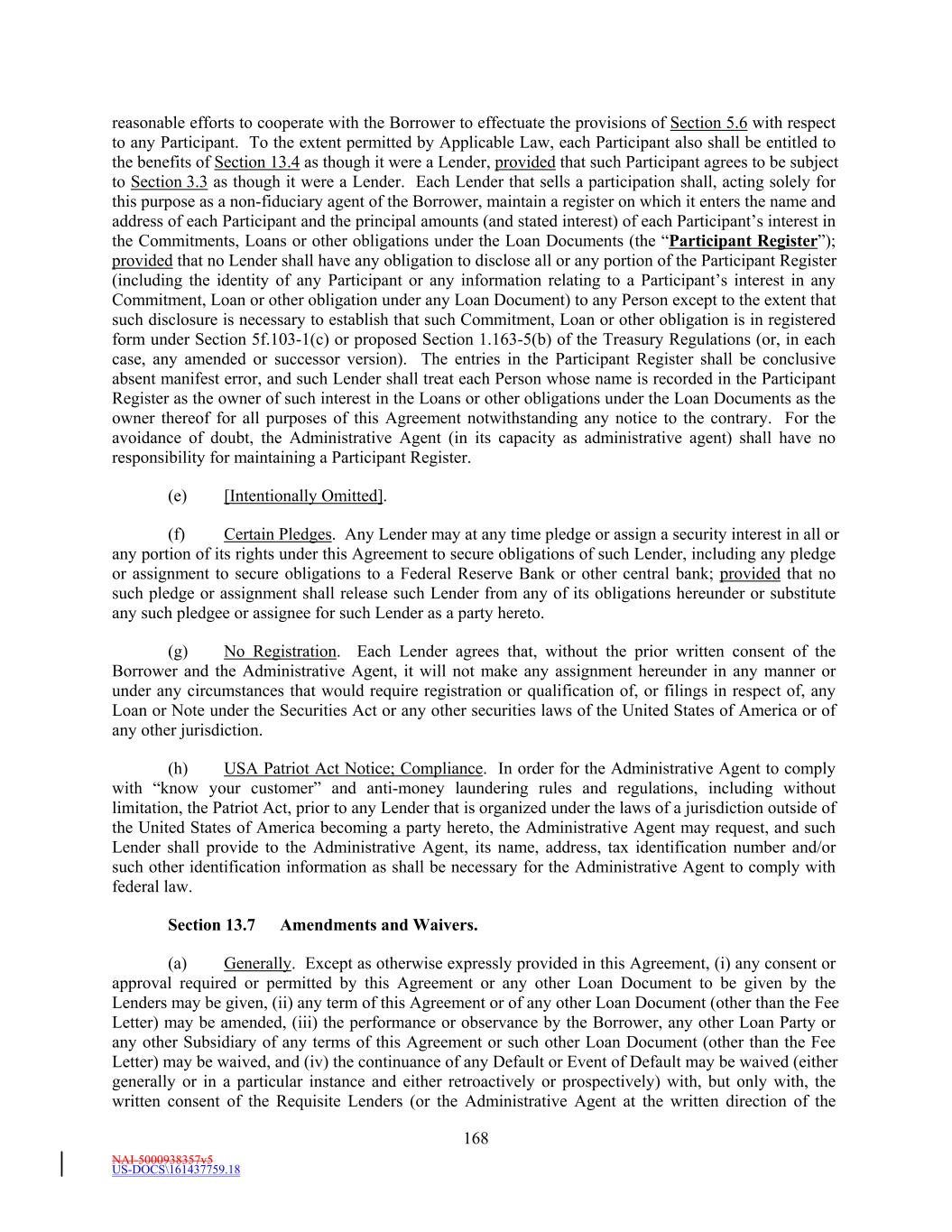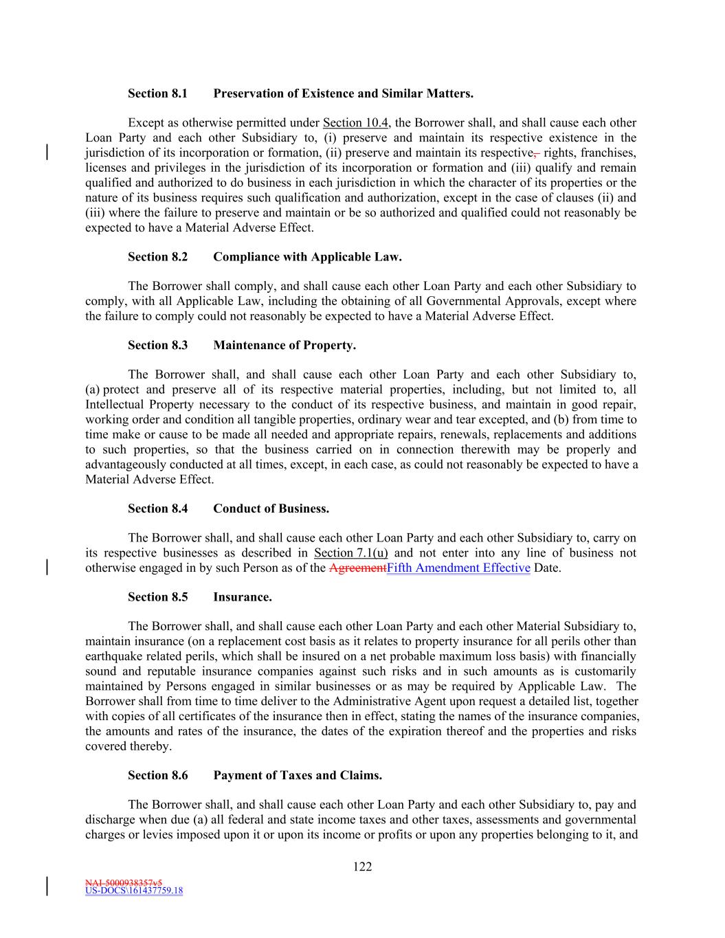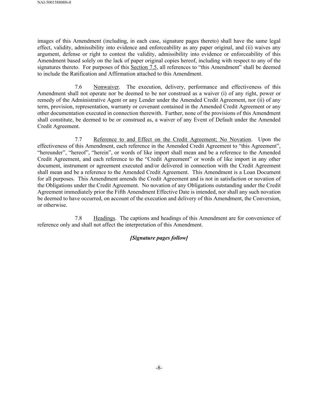 NAI-5001588088v8 -8- images of this Amendment (including, in each case, signature pages thereto) shall have the same legal effect, validity, admissibility into evidence and enforceability as any paper original, and (ii) waives any argument, defense or right to contest the validity, admissibility into evidence or enforceability of this Amendment based solely on the lack of paper original copies hereof, including with respect to any of the signatures thereto. For purposes of this Section 7.5, all references to “this Amendment” shall be deemed to include the Ratification and Affirmation attached to this Amendment. 7.6 Nonwaiver. The execution, delivery, performance and effectiveness of this Amendment shall not operate nor be deemed to be nor construed as a waiver (i) of any right, power or remedy of the Administrative Agent or any Lender under the Amended Credit Agreement, nor (ii) of any term, provision, representation, warranty or covenant contained in the Amended Credit Agreement or any other documentation executed in connection therewith. Further, none of the provisions of this Amendment shall constitute, be deemed to be or construed as, a waiver of any Event of Default under the Amended Credit Agreement. 7.7 Reference to and Effect on the Credit Agreement; No Novation. Upon the effectiveness of this Amendment, each reference in the Amended Credit Agreement to “this Agreement”, “hereunder”, “hereof”, “herein”, or words of like import shall mean and be a reference to the Amended Credit Agreement, and each reference to the “Credit Agreement” or words of like import in any other document, instrument or agreement executed and/or delivered in connection with the Credit Agreement shall mean and be a reference to the Amended Credit Agreement. This Amendment is a Loan Document for all purposes. This Amendment amends the Credit Agreement and is not in satisfaction or novation of the Obligations under the Credit Agreement. No novation of any Obligations outstanding under the Credit Agreement immediately prior the Fifth Amendment Effective Date is intended, nor shall any such novation be deemed to have occurred, on account of the execution and delivery of this Amendment, the Conversion, or otherwise. 7.8 Headings. The captions and headings of this Amendment are for convenience of reference only and shall not affect the interpretation of this Amendment. [Signature pages follow]
