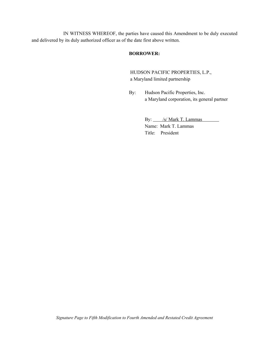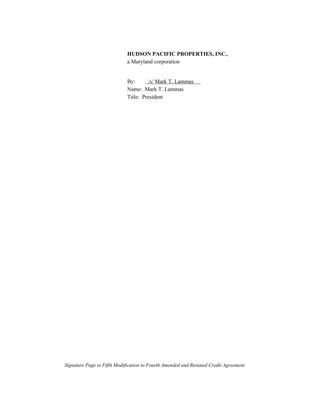 HUDSON PACIFIC PROPERTIES, INC., a Maryland corporation By: /s/ Mark T. Lammas Name: Mark T. Lammas Title: President Signature Page to Fifth Modification to Fourth Amended and Restated Credit Agreement