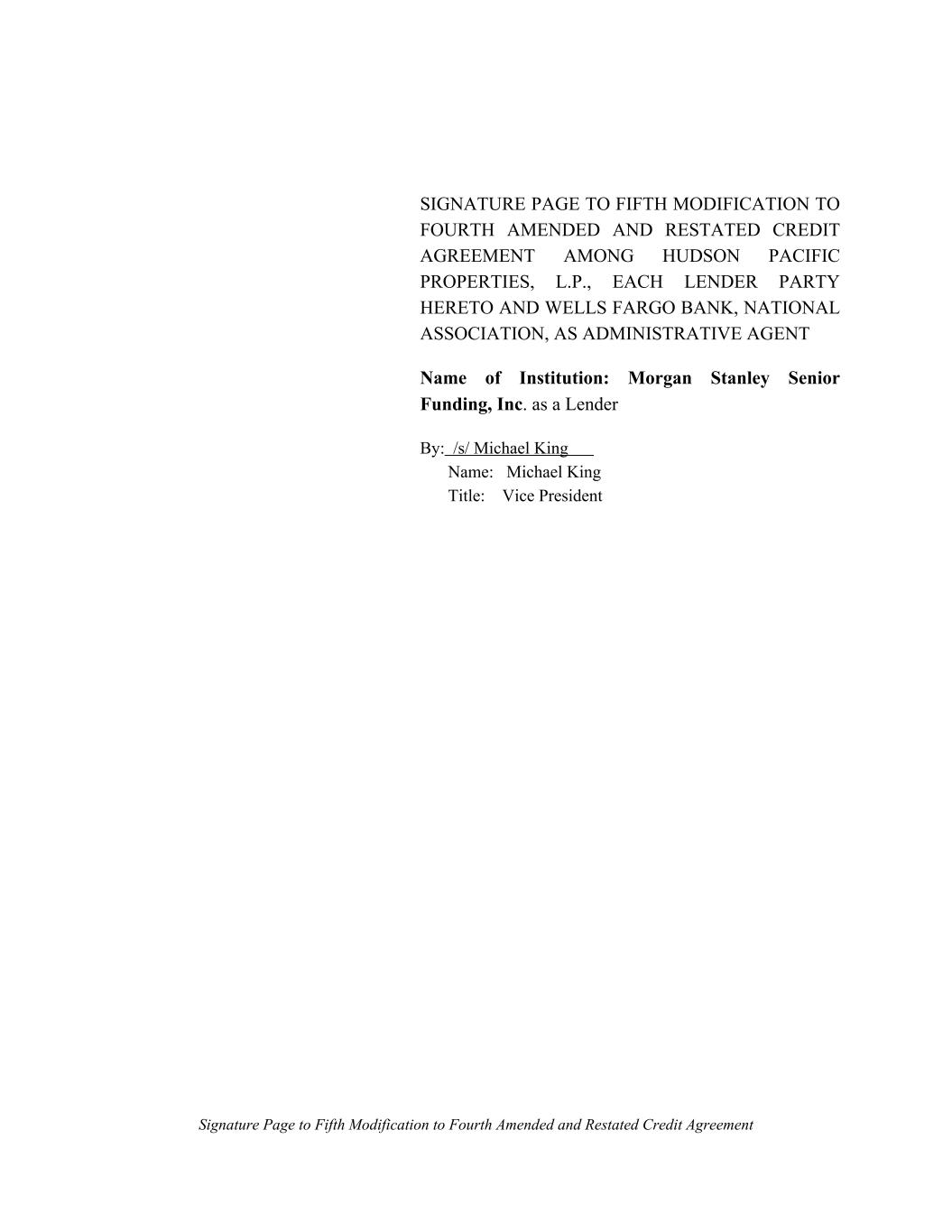 SIGNATURE PAGE TO FIFTH MODIFICATION TO FOURTH AMENDED AND RESTATED CREDIT AGREEMENT AMONG HUDSON PACIFIC PROPERTIES, L.P., EACH LENDER PARTY HERETO AND WELLS FARGO BANK, NATIONAL ASSOCIATION, AS ADMINISTRATIVE AGENT Name of Institution: Morgan Stanley Senior Funding, Inc. as a Lender By: /s/ Michael King Name: Michael King Title: Vice President Signature Page to Fifth Modification to Fourth Amended and Restated Credit Agreement