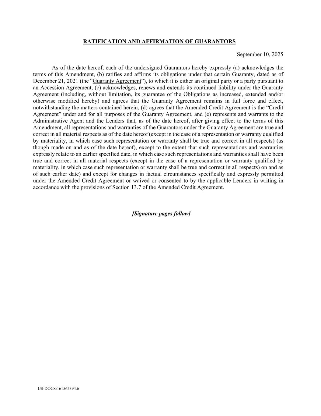 US-DOCS\161565394.6 RATIFICATION AND AFFIRMATION OF GUARANTORS September 10, 2025 As of the date hereof, each of the undersigned Guarantors hereby expressly (a) acknowledges the terms of this Amendment, (b) ratifies and affirms its obligations under that certain Guaranty, dated as of December 21, 2021 (the “Guaranty Agreement”), to which it is either an original party or a party pursuant to an Accession Agreement, (c) acknowledges, renews and extends its continued liability under the Guaranty Agreement (including, without limitation, its guarantee of the Obligations as increased, extended and/or otherwise modified hereby) and agrees that the Guaranty Agreement remains in full force and effect, notwithstanding the matters contained herein, (d) agrees that the Amended Credit Agreement is the “Credit Agreement” under and for all purposes of the Guaranty Agreement, and (e) represents and warrants to the Administrative Agent and the Lenders that, as of the date hereof, after giving effect to the terms of this Amendment, all representations and warranties of the Guarantors under the Guaranty Agreement are true and correct in all material respects as of the date hereof (except in the case of a representation or warranty qualified by materiality, in which case such representation or warranty shall be true and correct in all respects) (as though made on and as of the date hereof), except to the extent that such representations and warranties expressly relate to an earlier specified date, in which case such representations and warranties shall have been true and correct in all material respects (except in the case of a representation or warranty qualified by materiality, in which case such representation or warranty shall be true and correct in all respects) on and as of such earlier date) and except for changes in factual circumstances specifically and expressly permitted under the Amended Credit Agreement or waived or consented to by the applicable Lenders in writing in accordance with the provisions of Section 13.7 of the Amended Credit Agreement. [Signature pages follow]