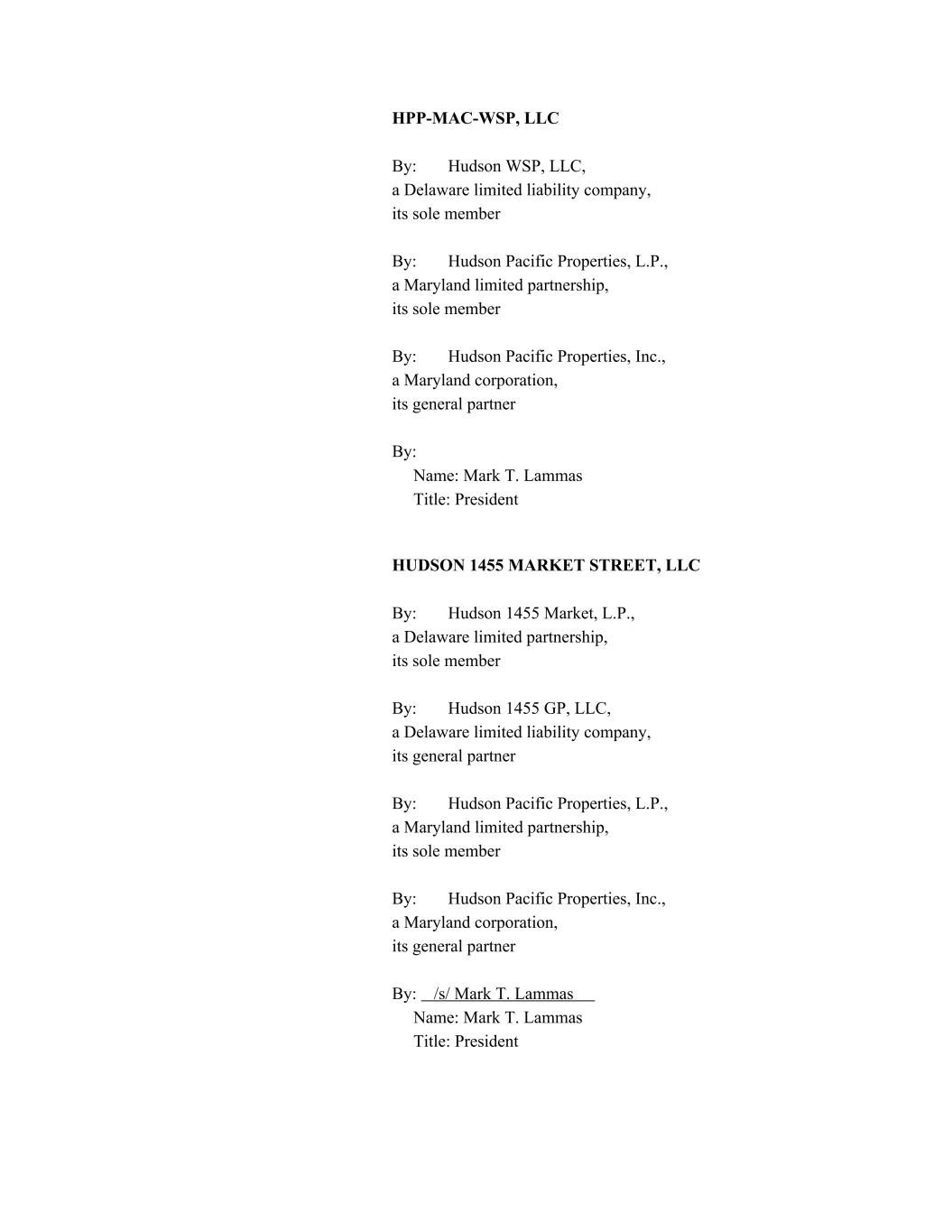 HPP-MAC-WSP, LLC By: Hudson WSP, LLC, a Delaware limited liability company, its sole member By: Hudson Pacific Properties, L.P., a Maryland limited partnership, its sole member By: Hudson Pacific Properties, Inc., a Maryland corporation, its general partner By: Name: Mark T. Lammas Title: President HUDSON 1455 MARKET STREET, LLC By: Hudson 1455 Market, L.P., a Delaware limited partnership, its sole member By: Hudson 1455 GP, LLC, a Delaware limited liability company, its general partner By: Hudson Pacific Properties, L.P., a Maryland limited partnership, its sole member By: Hudson Pacific Properties, Inc., a Maryland corporation, its general partner By: /s/ Mark T. Lammas Name: Mark T. Lammas Title: President