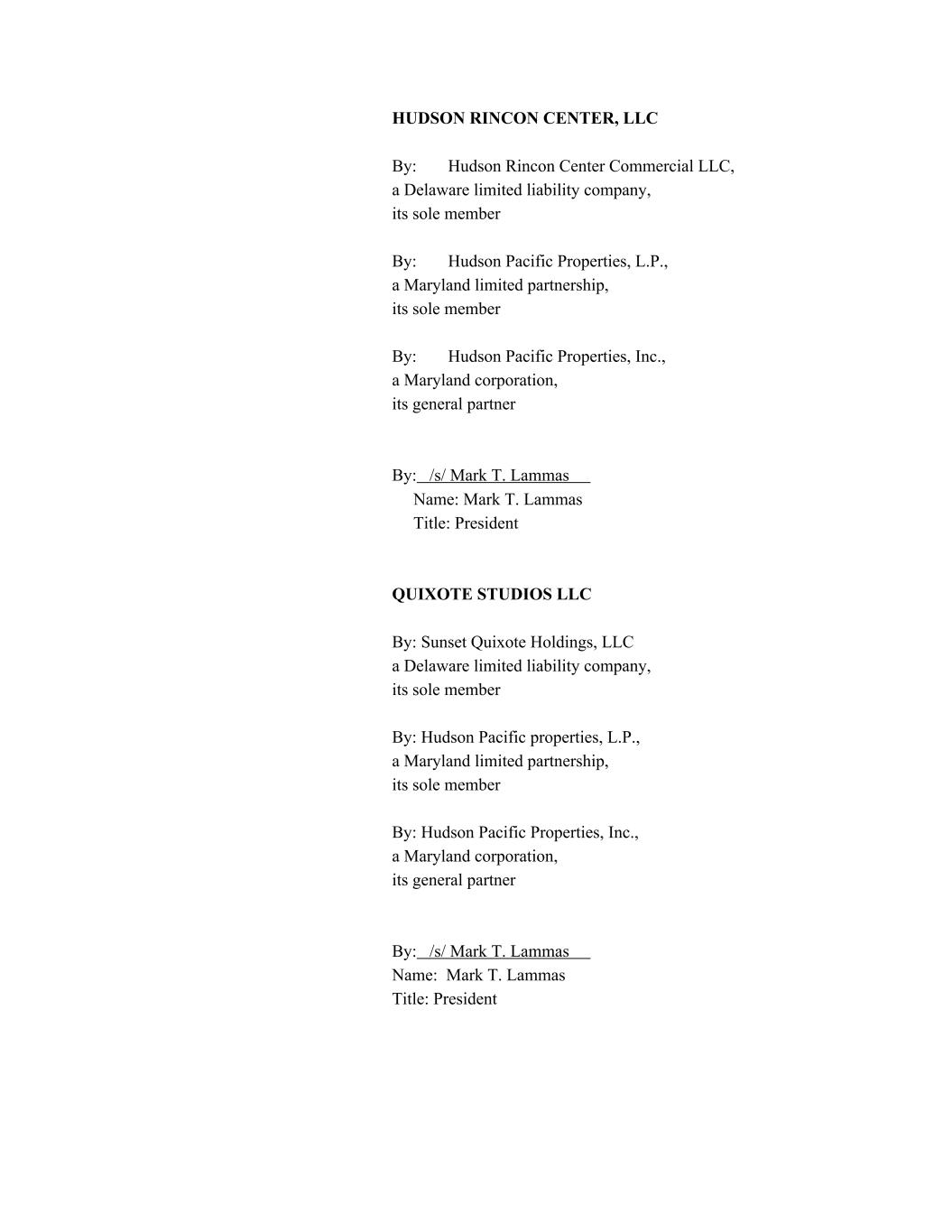 HUDSON RINCON CENTER, LLC By: Hudson Rincon Center Commercial LLC, a Delaware limited liability company, its sole member By: Hudson Pacific Properties, L.P., a Maryland limited partnership, its sole member By: Hudson Pacific Properties, Inc., a Maryland corporation, its general partner By: /s/ Mark T. Lammas Name: Mark T. Lammas Title: President QUIXOTE STUDIOS LLC By: Sunset Quixote Holdings, LLC a Delaware limited liability company, its sole member By: Hudson Pacific properties, L.P., a Maryland limited partnership, its sole member By: Hudson Pacific Properties, Inc., a Maryland corporation, its general partner By: /s/ Mark T. Lammas Name: Mark T. Lammas Title: President