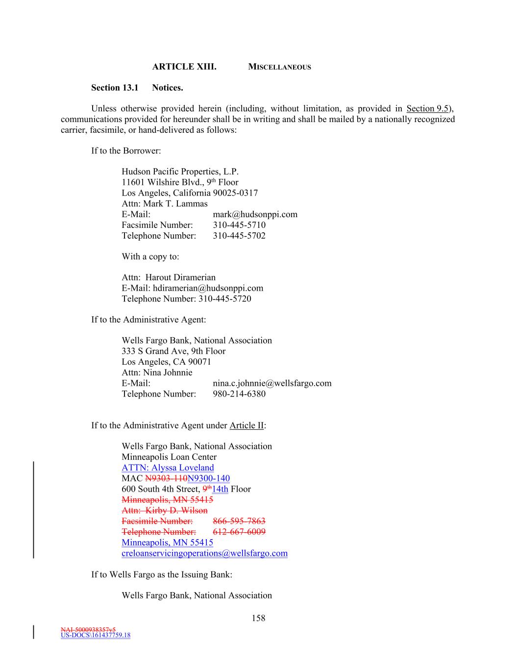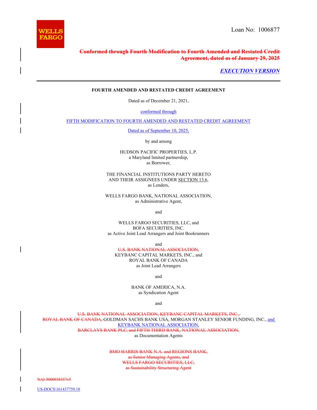 NAI-5000938357v5 US-DOCS\161437759.18 Loan No: 1006877 Conformed through Fourth Modification to Fourth Amended and Restated Credit Agreement, dated as of January 29, 2025 EXECUTION VERSION FOURTH AMENDED AND RESTATED CREDIT AGREEMENT Dated as of December 21, 2021, conformed through FIFTH MODIFICATION TO FOURTH AMENDED AND RESTATED CREDIT AGREEMENT Dated as of September 10, 2025, by and among HUDSON PACIFIC PROPERTIES, L.P. a Maryland limited partnership, as Borrower, THE FINANCIAL INSTITUTIONS PARTY HERETO AND THEIR ASSIGNEES UNDER SECTION 13.6, as Lenders, WELLS FARGO BANK, NATIONAL ASSOCIATION, as Administrative Agent, and WELLS FARGO SECURITIES, LLC, and BOFA SECURITIES, INC. as Active Joint Lead Arrangers and Joint Bookrunners and U.S. BANK NATIONAL ASSOCIATION, KEYBANC CAPITAL MARKETS, INC., and ROYAL BANK OF CANADA as Joint Lead Arrangers and BANK OF AMERICA, N.A. as Syndication Agent and U.S. BANK NATIONAL ASSOCIATION, KEYBANC CAPITAL MARKETS, INC., ROYAL BANK OF CANADA, GOLDMAN SACHS BANK USA, MORGAN STANLEY SENIOR FUNDING, INC., and KEYBANK NATIONAL ASSOCIATION, BARCLAYS BANK PLC, and FIFTH THIRD BANK, NATIONAL ASSOCIATION, as Documentation Agents BMO HARRIS BANK N.A. and REGIONS BANK, as Senior Managing Agents, and WELLS FARGO SECURITIES, LLC, as Sustainability Structuring Agent