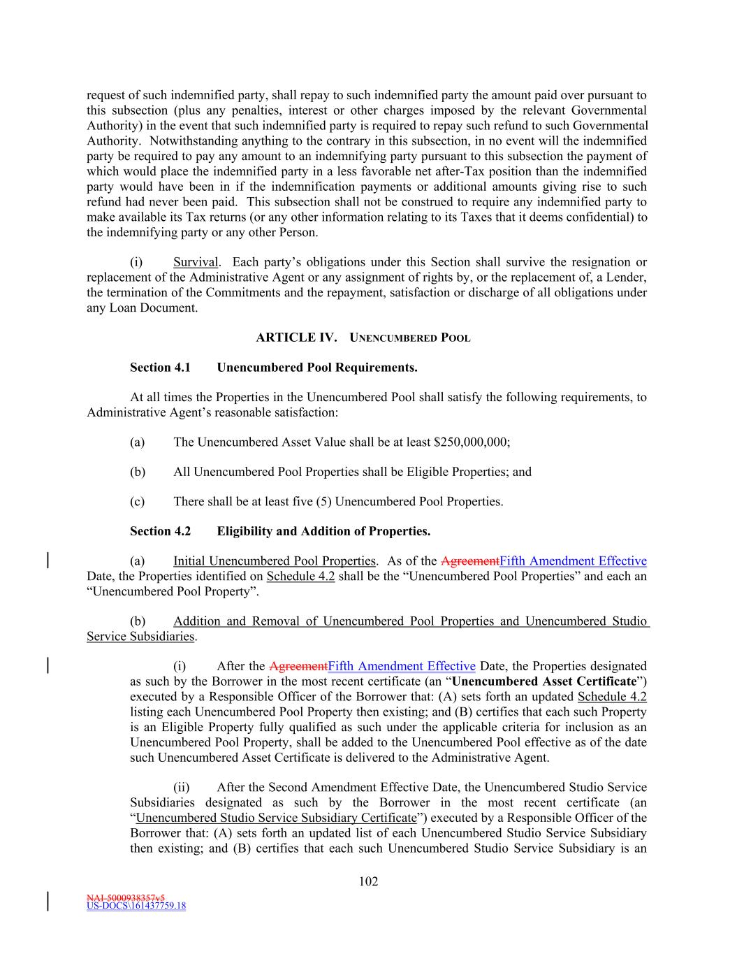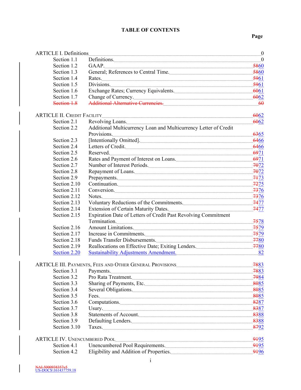 NAI-5000938357v5 US-DOCS\161437759.18 TABLE OF CONTENTS Page i ARTICLE I. Definitions 0 Section 1.1 Definitions. 0 Section 1.2 GAAP. 5860 Section 1.3 General; References to Central Time. 5860 Section 1.4 Rates. 5961 Section 1.5 Divisions. 5961 Section 1.6 Exchange Rates; Currency Equivalents. 6061 Section 1.7 Change of Currency. 6062 Section 1.8 Additional Alternative Currencies. 60 ARTICLE II. CREDIT FACILITY 6062 Section 2.1 Revolving Loans. 6062 Section 2.2 Additional Multicurrency Loan and Multicurrency Letter of Credit Provisions. 6365 Section 2.3 [Intentionally Omitted]. 6466 Section 2.4 Letters of Credit. 6466 Section 2.5 Reserved. 6971 Section 2.6 Rates and Payment of Interest on Loans. 6971 Section 2.7 Number of Interest Periods. 7072 Section 2.8 Repayment of Loans. 7072 Section 2.9 Prepayments. 7173 Section 2.10 Continuation. 7275 Section 2.11 Conversion. 7376 Section 2.12 Notes. 7376 Section 2.13 Voluntary Reductions of the Commitments. 7477 Section 2.14 Extension of Certain Maturity Dates. 7477 Section 2.15 Expiration Date of Letters of Credit Past Revolving Commitment Termination. 7578 Section 2.16 Amount Limitations. 7579 Section 2.17 Increase in Commitments. 7579 Section 2.18 Funds Transfer Disbursements. 7780 Section 2.19 Reallocations on Effective Date; Exiting Lenders. 7780 Section 2.20 Sustainability Adjustments Amendment. 82 ARTICLE III. PAYMENTS, FEES AND OTHER GENERAL PROVISIONS 7883 Section 3.1 Payments. 7883 Section 3.2 Pro Rata Treatment. 7984 Section 3.3 Sharing of Payments, Etc. 8085 Section 3.4 Several Obligations. 8085 Section 3.5 Fees. 8085 Section 3.6 Computations. 8287 Section 3.7 Usury. 8387 Section 3.8 Statements of Account. 8388 Section 3.9 Defaulting Lenders. 8388 Section 3.10 Taxes. 8792 ARTICLE IV. UNENCUMBERED POOL 9195 Section 4.1 Unencumbered Pool Requirements. 9195 Section 4.2 Eligibility and Addition of Properties. 9196