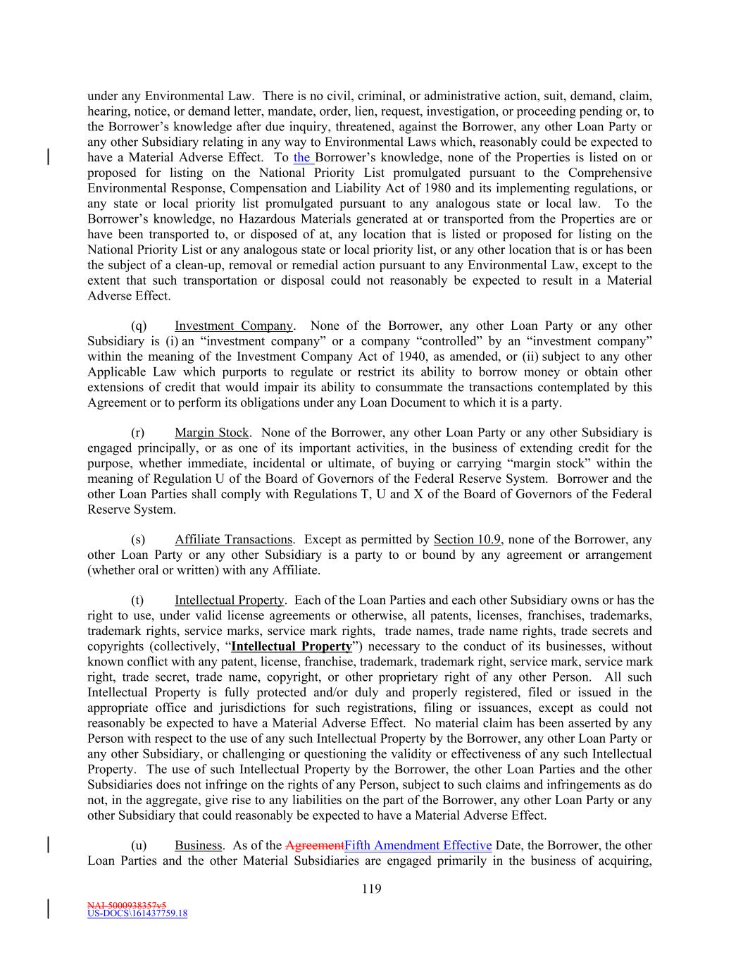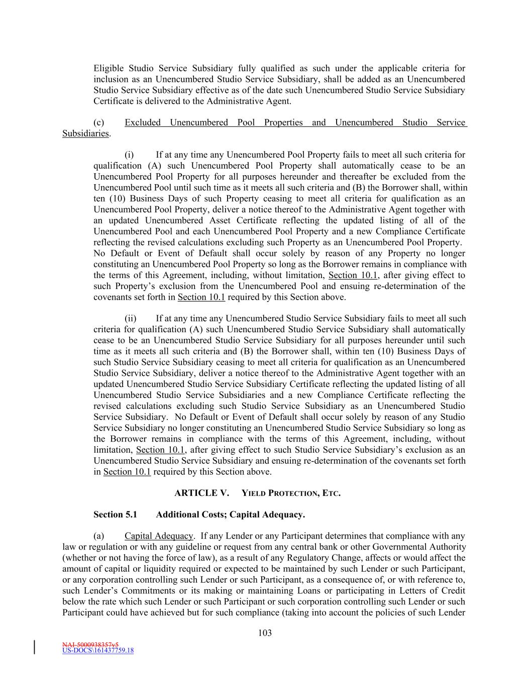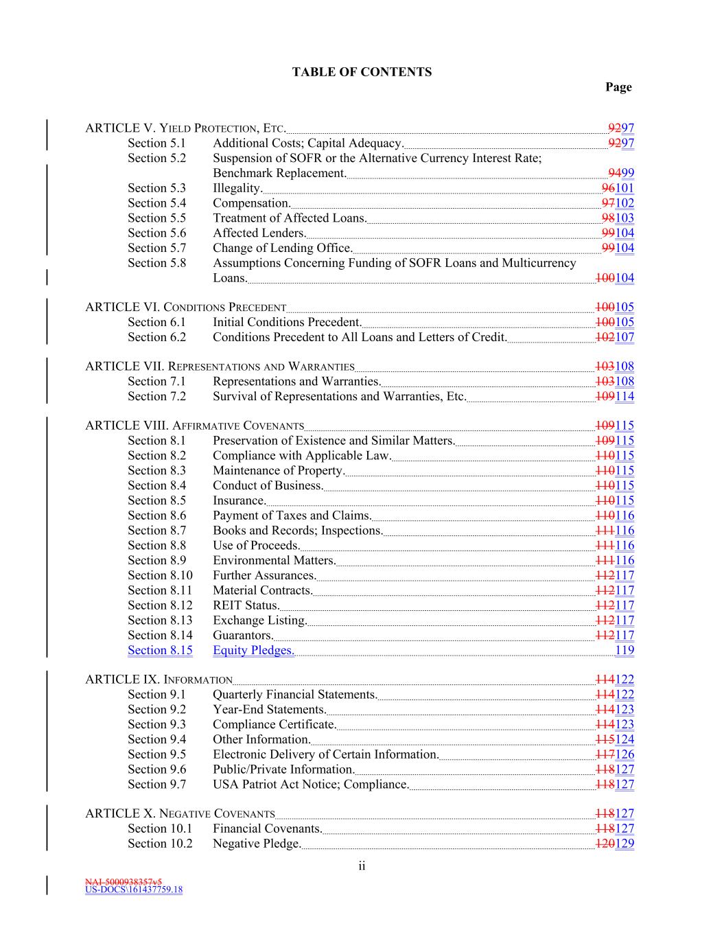 NAI-5000938357v5 US-DOCS\161437759.18 TABLE OF CONTENTS Page ii ARTICLE V. YIELD PROTECTION, ETC. 9297 Section 5.1 Additional Costs; Capital Adequacy. 9297 Section 5.2 Suspension of SOFR or the Alternative Currency Interest Rate; Benchmark Replacement. 9499 Section 5.3 Illegality. 96101 Section 5.4 Compensation. 97102 Section 5.5 Treatment of Affected Loans. 98103 Section 5.6 Affected Lenders. 99104 Section 5.7 Change of Lending Office. 99104 Section 5.8 Assumptions Concerning Funding of SOFR Loans and Multicurrency Loans. 100104 ARTICLE VI. CONDITIONS PRECEDENT 100105 Section 6.1 Initial Conditions Precedent. 100105 Section 6.2 Conditions Precedent to All Loans and Letters of Credit. 102107 ARTICLE VII. REPRESENTATIONS AND WARRANTIES 103108 Section 7.1 Representations and Warranties. 103108 Section 7.2 Survival of Representations and Warranties, Etc. 109114 ARTICLE VIII. AFFIRMATIVE COVENANTS 109115 Section 8.1 Preservation of Existence and Similar Matters. 109115 Section 8.2 Compliance with Applicable Law. 110115 Section 8.3 Maintenance of Property. 110115 Section 8.4 Conduct of Business. 110115 Section 8.5 Insurance. 110115 Section 8.6 Payment of Taxes and Claims. 110116 Section 8.7 Books and Records; Inspections. 111116 Section 8.8 Use of Proceeds. 111116 Section 8.9 Environmental Matters. 111116 Section 8.10 Further Assurances. 112117 Section 8.11 Material Contracts. 112117 Section 8.12 REIT Status. 112117 Section 8.13 Exchange Listing. 112117 Section 8.14 Guarantors. 112117 Section 8.15 Equity Pledges. 119 ARTICLE IX. INFORMATION 114122 Section 9.1 Quarterly Financial Statements. 114122 Section 9.2 Year-End Statements. 114123 Section 9.3 Compliance Certificate. 114123 Section 9.4 Other Information. 115124 Section 9.5 Electronic Delivery of Certain Information. 117126 Section 9.6 Public/Private Information. 118127 Section 9.7 USA Patriot Act Notice; Compliance. 118127 ARTICLE X. NEGATIVE COVENANTS 118127 Section 10.1 Financial Covenants. 118127 Section 10.2 Negative Pledge. 120129