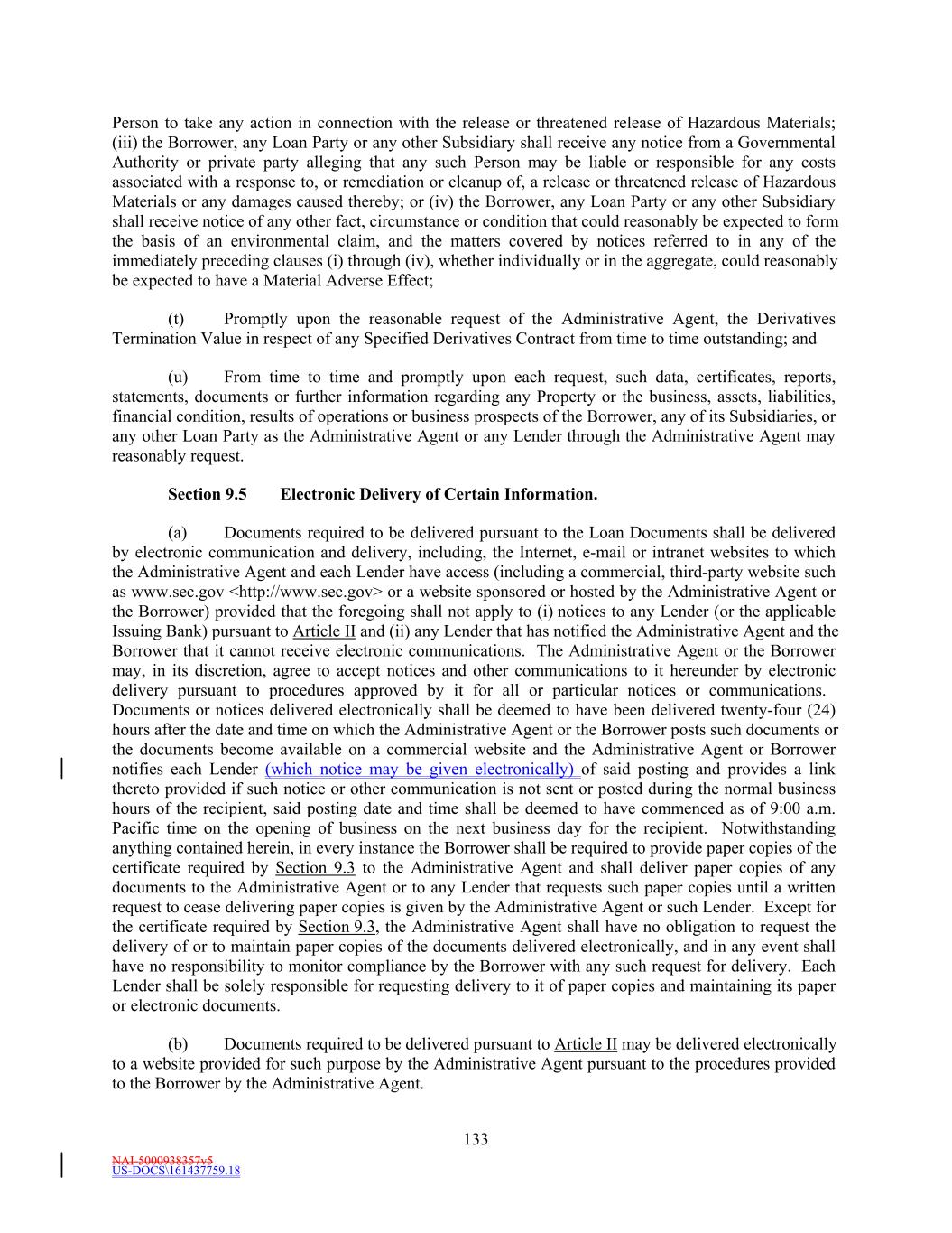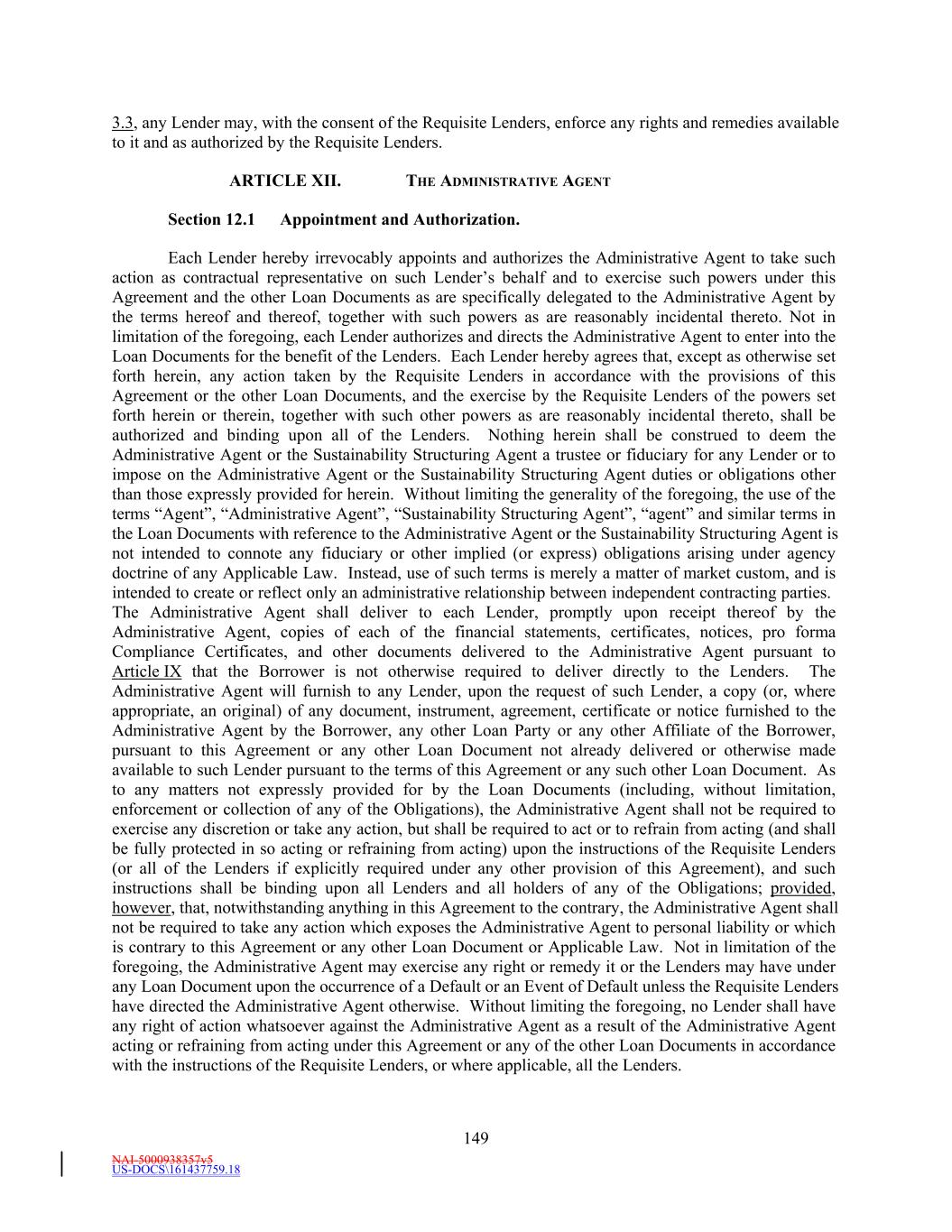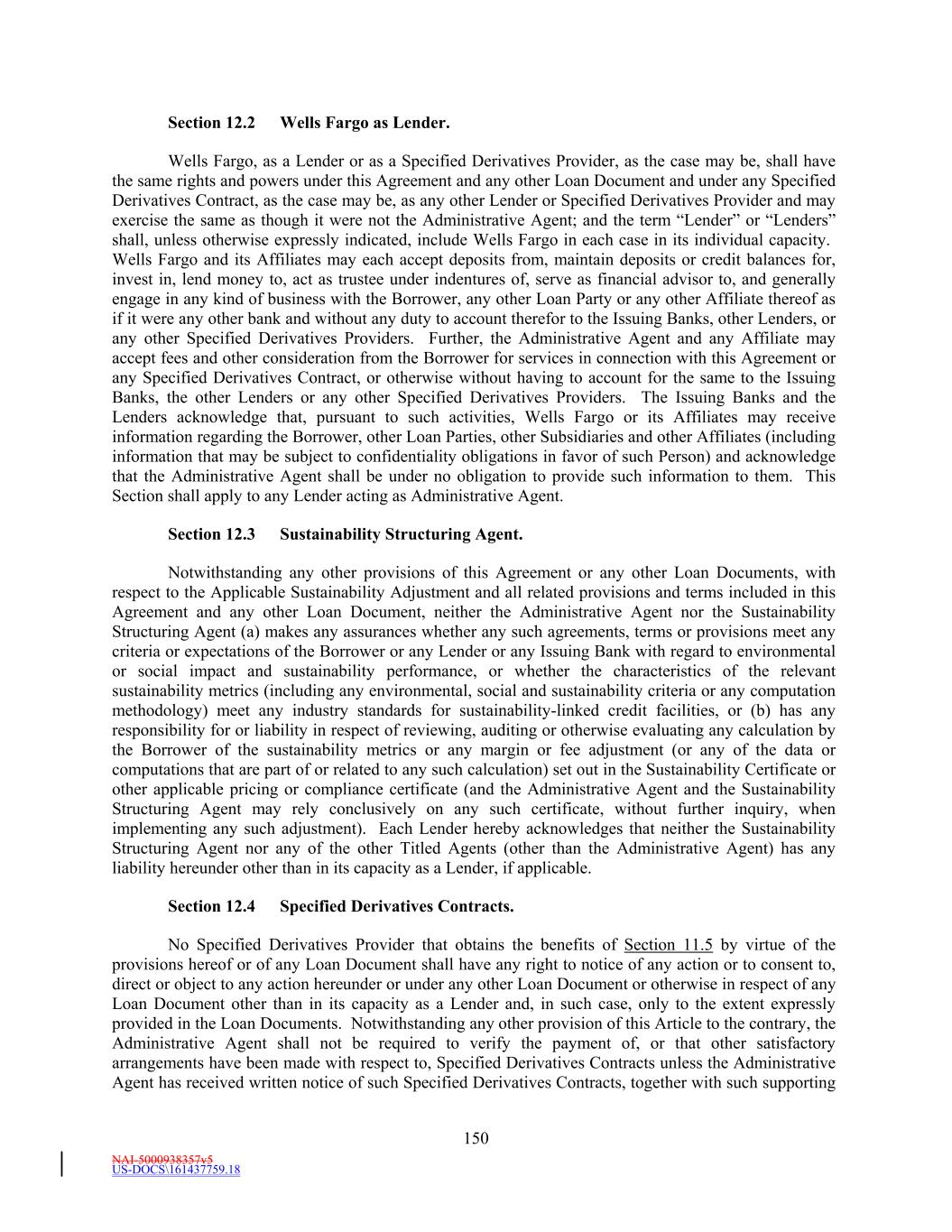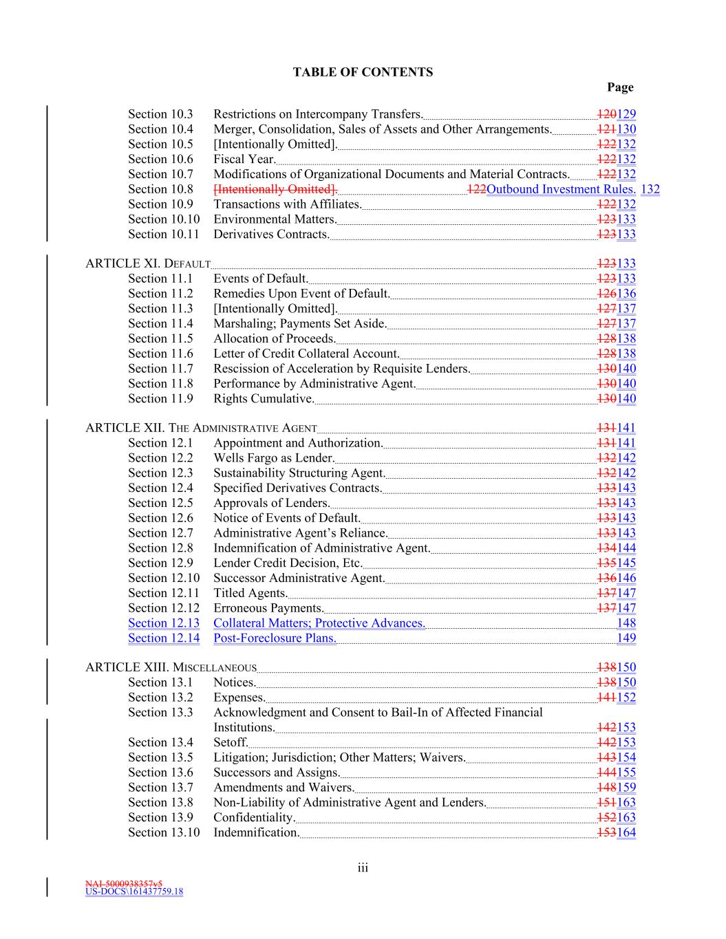 NAI-5000938357v5 US-DOCS\161437759.18 TABLE OF CONTENTS Page iii Section 10.3 Restrictions on Intercompany Transfers. 120129 Section 10.4 Merger, Consolidation, Sales of Assets and Other Arrangements. 121130 Section 10.5 [Intentionally Omitted]. 122132 Section 10.6 Fiscal Year. 122132 Section 10.7 Modifications of Organizational Documents and Material Contracts. 122132 Section 10.8 [Intentionally Omitted]. 122Outbound Investment Rules. 132 Section 10.9 Transactions with Affiliates. 122132 Section 10.10 Environmental Matters. 123133 Section 10.11 Derivatives Contracts. 123133 ARTICLE XI. DEFAULT 123133 Section 11.1 Events of Default. 123133 Section 11.2 Remedies Upon Event of Default. 126136 Section 11.3 [Intentionally Omitted]. 127137 Section 11.4 Marshaling; Payments Set Aside. 127137 Section 11.5 Allocation of Proceeds. 128138 Section 11.6 Letter of Credit Collateral Account. 128138 Section 11.7 Rescission of Acceleration by Requisite Lenders. 130140 Section 11.8 Performance by Administrative Agent. 130140 Section 11.9 Rights Cumulative. 130140 ARTICLE XII. THE ADMINISTRATIVE AGENT 131141 Section 12.1 Appointment and Authorization. 131141 Section 12.2 Wells Fargo as Lender. 132142 Section 12.3 Sustainability Structuring Agent. 132142 Section 12.4 Specified Derivatives Contracts. 133143 Section 12.5 Approvals of Lenders. 133143 Section 12.6 Notice of Events of Default. 133143 Section 12.7 Administrative Agent’s Reliance. 133143 Section 12.8 Indemnification of Administrative Agent. 134144 Section 12.9 Lender Credit Decision, Etc. 135145 Section 12.10 Successor Administrative Agent. 136146 Section 12.11 Titled Agents. 137147 Section 12.12 Erroneous Payments. 137147 Section 12.13 Collateral Matters; Protective Advances. 148 Section 12.14 Post-Foreclosure Plans. 149 ARTICLE XIII. MISCELLANEOUS 138150 Section 13.1 Notices. 138150 Section 13.2 Expenses. 141152 Section 13.3 Acknowledgment and Consent to Bail-In of Affected Financial Institutions. 142153 Section 13.4 Setoff. 142153 Section 13.5 Litigation; Jurisdiction; Other Matters; Waivers. 143154 Section 13.6 Successors and Assigns. 144155 Section 13.7 Amendments and Waivers. 148159 Section 13.8 Non-Liability of Administrative Agent and Lenders. 151163 Section 13.9 Confidentiality. 152163 Section 13.10 Indemnification. 153164