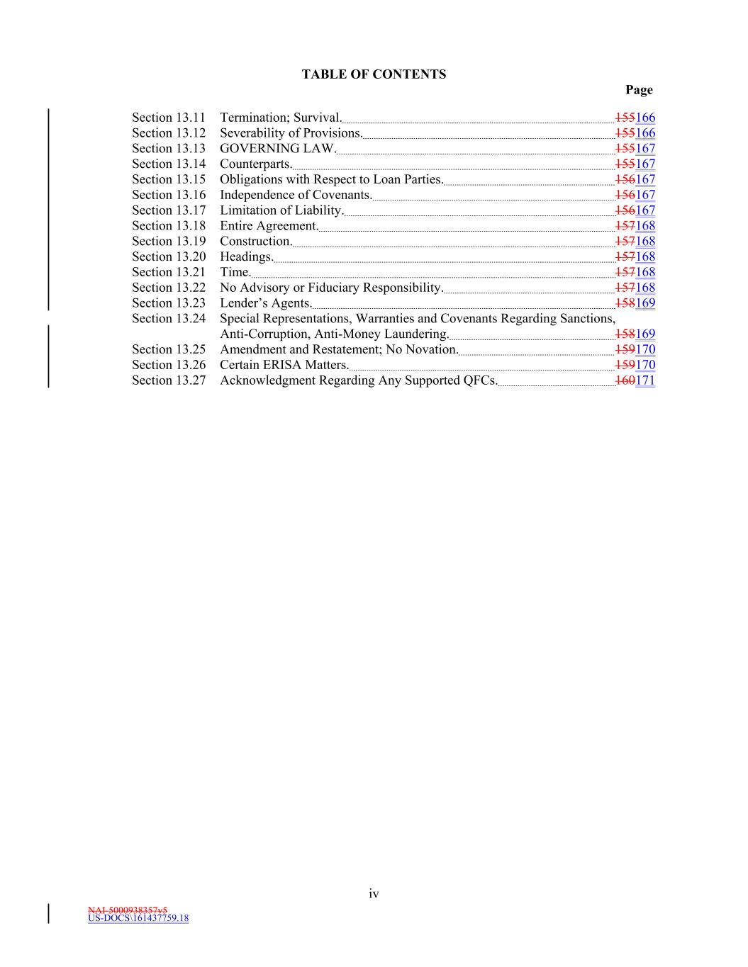 NAI-5000938357v5 US-DOCS\161437759.18 TABLE OF CONTENTS Page iv Section 13.11 Termination; Survival. 155166 Section 13.12 Severability of Provisions. 155166 Section 13.13 GOVERNING LAW. 155167 Section 13.14 Counterparts. 155167 Section 13.15 Obligations with Respect to Loan Parties. 156167 Section 13.16 Independence of Covenants. 156167 Section 13.17 Limitation of Liability. 156167 Section 13.18 Entire Agreement. 157168 Section 13.19 Construction. 157168 Section 13.20 Headings. 157168 Section 13.21 Time. 157168 Section 13.22 No Advisory or Fiduciary Responsibility. 157168 Section 13.23 Lender’s Agents. 158169 Section 13.24 Special Representations, Warranties and Covenants Regarding Sanctions, Anti-Corruption, Anti-Money Laundering. 158169 Section 13.25 Amendment and Restatement; No Novation. 159170 Section 13.26 Certain ERISA Matters. 159170 Section 13.27 Acknowledgment Regarding Any Supported QFCs. 160171
