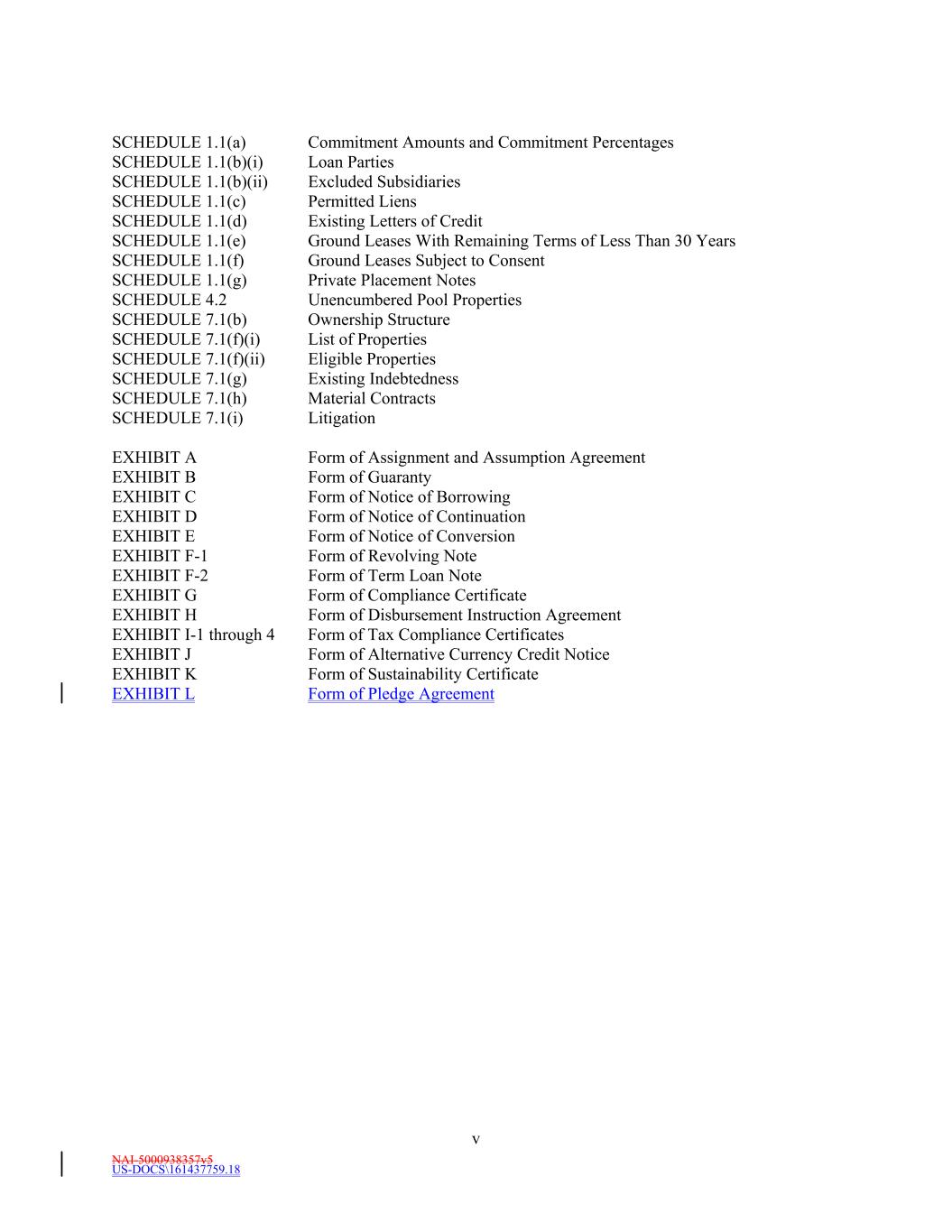 NAI-5000938357v5 US-DOCS\161437759.18 v SCHEDULE 1.1(a) Commitment Amounts and Commitment Percentages SCHEDULE 1.1(b)(i) Loan Parties SCHEDULE 1.1(b)(ii) Excluded Subsidiaries SCHEDULE 1.1(c) Permitted Liens SCHEDULE 1.1(d) Existing Letters of Credit SCHEDULE 1.1(e) Ground Leases With Remaining Terms of Less Than 30 Years SCHEDULE 1.1(f) Ground Leases Subject to Consent SCHEDULE 1.1(g) Private Placement Notes SCHEDULE 4.2 Unencumbered Pool Properties SCHEDULE 7.1(b) Ownership Structure SCHEDULE 7.1(f)(i) List of Properties SCHEDULE 7.1(f)(ii) Eligible Properties SCHEDULE 7.1(g) Existing Indebtedness SCHEDULE 7.1(h) Material Contracts SCHEDULE 7.1(i) Litigation EXHIBIT A Form of Assignment and Assumption Agreement EXHIBIT B Form of Guaranty EXHIBIT C Form of Notice of Borrowing EXHIBIT D Form of Notice of Continuation EXHIBIT E Form of Notice of Conversion EXHIBIT F-1 Form of Revolving Note EXHIBIT F-2 Form of Term Loan Note EXHIBIT G Form of Compliance Certificate EXHIBIT H Form of Disbursement Instruction Agreement EXHIBIT I-1 through 4 Form of Tax Compliance Certificates EXHIBIT J Form of Alternative Currency Credit Notice EXHIBIT K Form of Sustainability Certificate EXHIBIT L Form of Pledge Agreement