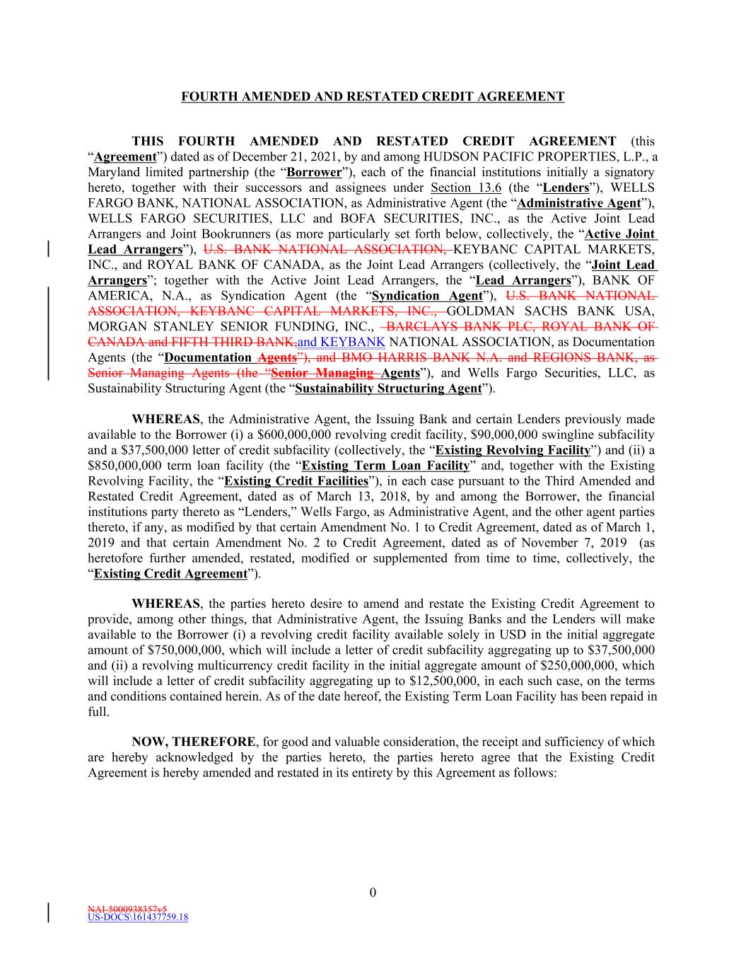 NAI-5000938357v5 US-DOCS\161437759.18 0 FOURTH AMENDED AND RESTATED CREDIT AGREEMENT THIS FOURTH AMENDED AND RESTATED CREDIT AGREEMENT (this “Agreement”) dated as of December 21, 2021, by and among HUDSON PACIFIC PROPERTIES, L.P., a Maryland limited partnership (the “Borrower”), each of the financial institutions initially a signatory hereto, together with their successors and assignees under Section 13.6 (the “Lenders”), WELLS FARGO BANK, NATIONAL ASSOCIATION, as Administrative Agent (the “Administrative Agent”), WELLS FARGO SECURITIES, LLC and BOFA SECURITIES, INC., as the Active Joint Lead Arrangers and Joint Bookrunners (as more particularly set forth below, collectively, the “Active Joint Lead Arrangers”), U.S. BANK NATIONAL ASSOCIATION, KEYBANC CAPITAL MARKETS, INC., and ROYAL BANK OF CANADA, as the Joint Lead Arrangers (collectively, the “Joint Lead Arrangers”; together with the Active Joint Lead Arrangers, the “Lead Arrangers”), BANK OF AMERICA, N.A., as Syndication Agent (the “Syndication Agent”), U.S. BANK NATIONAL ASSOCIATION, KEYBANC CAPITAL MARKETS, INC., GOLDMAN SACHS BANK USA, MORGAN STANLEY SENIOR FUNDING, INC., BARCLAYS BANK PLC, ROYAL BANK OF CANADA and FIFTH THIRD BANK,and KEYBANK NATIONAL ASSOCIATION, as Documentation Agents (the “Documentation Agents”), and BMO HARRIS BANK N.A. and REGIONS BANK, as Senior Managing Agents (the “Senior Managing Agents”), and Wells Fargo Securities, LLC, as Sustainability Structuring Agent (the “Sustainability Structuring Agent”). WHEREAS, the Administrative Agent, the Issuing Bank and certain Lenders previously made available to the Borrower (i) a $600,000,000 revolving credit facility, $90,000,000 swingline subfacility and a $37,500,000 letter of credit subfacility (collectively, the “Existing Revolving Facility”) and (ii) a $850,000,000 term loan facility (the “Existing Term Loan Facility” and, together with the Existing Revolving Facility, the “Existing Credit Facilities”), in each case pursuant to the Third Amended and Restated Credit Agreement, dated as of March 13, 2018, by and among the Borrower, the financial institutions party thereto as “Lenders,” Wells Fargo, as Administrative Agent, and the other agent parties thereto, if any, as modified by that certain Amendment No. 1 to Credit Agreement, dated as of March 1, 2019 and that certain Amendment No. 2 to Credit Agreement, dated as of November 7, 2019 (as heretofore further amended, restated, modified or supplemented from time to time, collectively, the “Existing Credit Agreement”). WHEREAS, the parties hereto desire to amend and restate the Existing Credit Agreement to provide, among other things, that Administrative Agent, the Issuing Banks and the Lenders will make available to the Borrower (i) a revolving credit facility available solely in USD in the initial aggregate amount of $750,000,000, which will include a letter of credit subfacility aggregating up to $37,500,000 and (ii) a revolving multicurrency credit facility in the initial aggregate amount of $250,000,000, which will include a letter of credit subfacility aggregating up to $12,500,000, in each such case, on the terms and conditions contained herein. As of the date hereof, the Existing Term Loan Facility has been repaid in full. NOW, THEREFORE, for good and valuable consideration, the receipt and sufficiency of which are hereby acknowledged by the parties hereto, the parties hereto agree that the Existing Credit Agreement is hereby amended and restated in its entirety by this Agreement as follows: