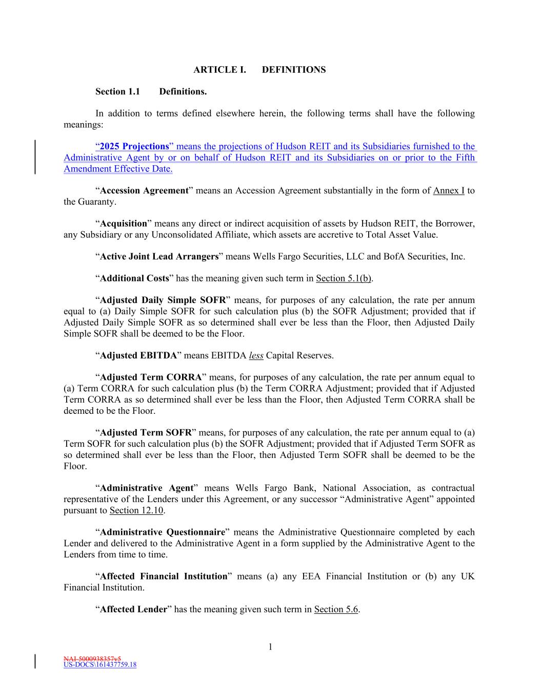 NAI-5000938357v5 US-DOCS\161437759.18 1 ARTICLE I. DEFINITIONS Section 1.1 Definitions. In addition to terms defined elsewhere herein, the following terms shall have the following meanings: “2025 Projections” means the projections of Hudson REIT and its Subsidiaries furnished to the Administrative Agent by or on behalf of Hudson REIT and its Subsidiaries on or prior to the Fifth Amendment Effective Date. “Accession Agreement” means an Accession Agreement substantially in the form of Annex I to the Guaranty. “Acquisition” means any direct or indirect acquisition of assets by Hudson REIT, the Borrower, any Subsidiary or any Unconsolidated Affiliate, which assets are accretive to Total Asset Value. “Active Joint Lead Arrangers” means Wells Fargo Securities, LLC and BofA Securities, Inc. “Additional Costs” has the meaning given such term in Section 5.1(b). “Adjusted Daily Simple SOFR” means, for purposes of any calculation, the rate per annum equal to (a) Daily Simple SOFR for such calculation plus (b) the SOFR Adjustment; provided that if Adjusted Daily Simple SOFR as so determined shall ever be less than the Floor, then Adjusted Daily Simple SOFR shall be deemed to be the Floor. “Adjusted EBITDA” means EBITDA less Capital Reserves. “Adjusted Term CORRA” means, for purposes of any calculation, the rate per annum equal to (a) Term CORRA for such calculation plus (b) the Term CORRA Adjustment; provided that if Adjusted Term CORRA as so determined shall ever be less than the Floor, then Adjusted Term CORRA shall be deemed to be the Floor. “Adjusted Term SOFR” means, for purposes of any calculation, the rate per annum equal to (a) Term SOFR for such calculation plus (b) the SOFR Adjustment; provided that if Adjusted Term SOFR as so determined shall ever be less than the Floor, then Adjusted Term SOFR shall be deemed to be the Floor. “Administrative Agent” means Wells Fargo Bank, National Association, as contractual representative of the Lenders under this Agreement, or any successor “Administrative Agent” appointed pursuant to Section 12.10. “Administrative Questionnaire” means the Administrative Questionnaire completed by each Lender and delivered to the Administrative Agent in a form supplied by the Administrative Agent to the Lenders from time to time. “Affected Financial Institution” means (a) any EEA Financial Institution or (b) any UK Financial Institution. “Affected Lender” has the meaning given such term in Section 5.6.