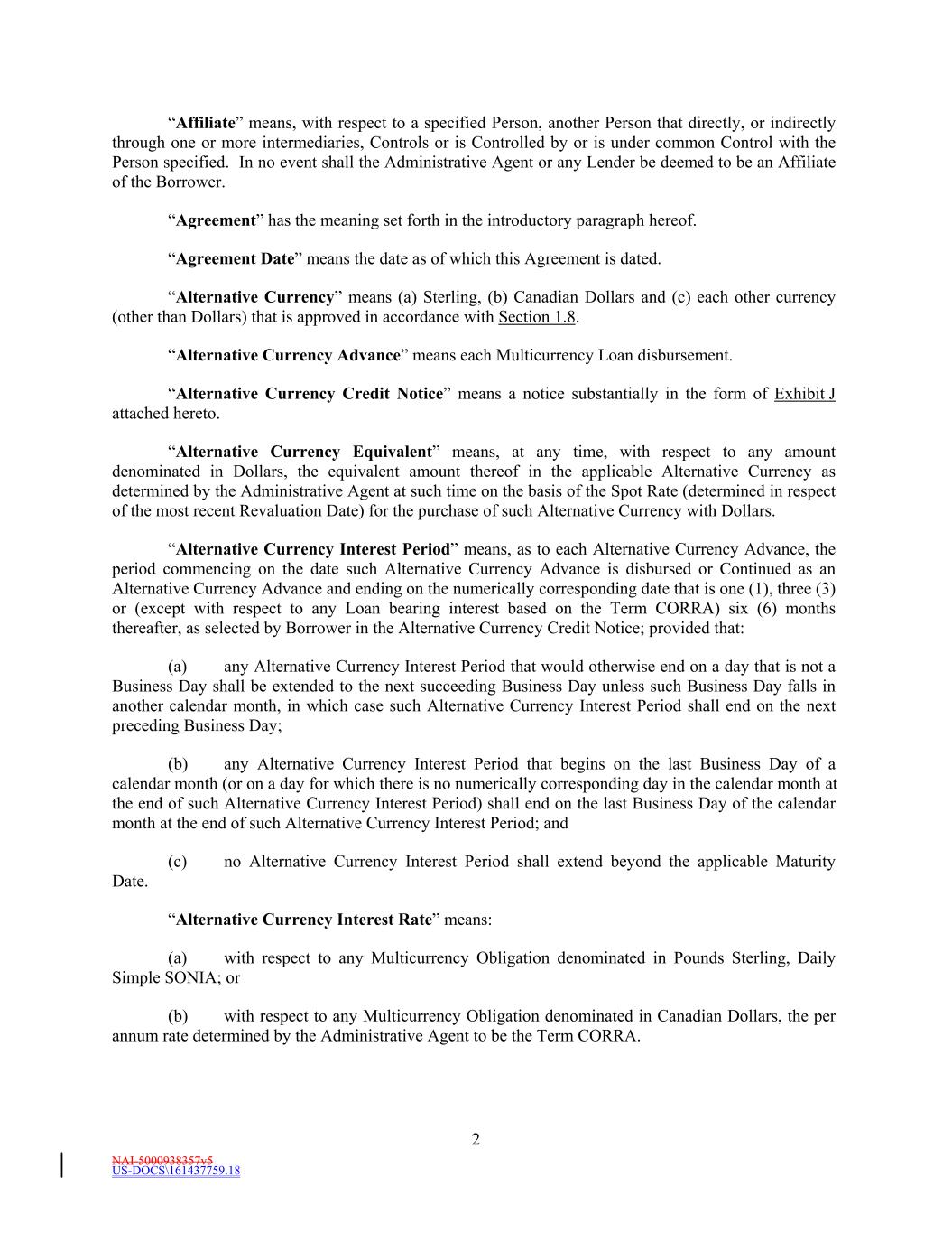 NAI-5000938357v5 US-DOCS\161437759.18 2 “Affiliate” means, with respect to a specified Person, another Person that directly, or indirectly through one or more intermediaries, Controls or is Controlled by or is under common Control with the Person specified. In no event shall the Administrative Agent or any Lender be deemed to be an Affiliate of the Borrower. “Agreement” has the meaning set forth in the introductory paragraph hereof. “Agreement Date” means the date as of which this Agreement is dated. “Alternative Currency” means (a) Sterling, (b) Canadian Dollars and (c) each other currency (other than Dollars) that is approved in accordance with Section 1.8. “Alternative Currency Advance” means each Multicurrency Loan disbursement. “Alternative Currency Credit Notice” means a notice substantially in the form of Exhibit J attached hereto. “Alternative Currency Equivalent” means, at any time, with respect to any amount denominated in Dollars, the equivalent amount thereof in the applicable Alternative Currency as determined by the Administrative Agent at such time on the basis of the Spot Rate (determined in respect of the most recent Revaluation Date) for the purchase of such Alternative Currency with Dollars. “Alternative Currency Interest Period” means, as to each Alternative Currency Advance, the period commencing on the date such Alternative Currency Advance is disbursed or Continued as an Alternative Currency Advance and ending on the numerically corresponding date that is one (1), three (3) or (except with respect to any Loan bearing interest based on the Term CORRA) six (6) months thereafter, as selected by Borrower in the Alternative Currency Credit Notice; provided that: (a) any Alternative Currency Interest Period that would otherwise end on a day that is not a Business Day shall be extended to the next succeeding Business Day unless such Business Day falls in another calendar month, in which case such Alternative Currency Interest Period shall end on the next preceding Business Day; (b) any Alternative Currency Interest Period that begins on the last Business Day of a calendar month (or on a day for which there is no numerically corresponding day in the calendar month at the end of such Alternative Currency Interest Period) shall end on the last Business Day of the calendar month at the end of such Alternative Currency Interest Period; and (c) no Alternative Currency Interest Period shall extend beyond the applicable Maturity Date. “Alternative Currency Interest Rate” means: (a) with respect to any Multicurrency Obligation denominated in Pounds Sterling, Daily Simple SONIA; or (b) with respect to any Multicurrency Obligation denominated in Canadian Dollars, the per annum rate determined by the Administrative Agent to be the Term CORRA.