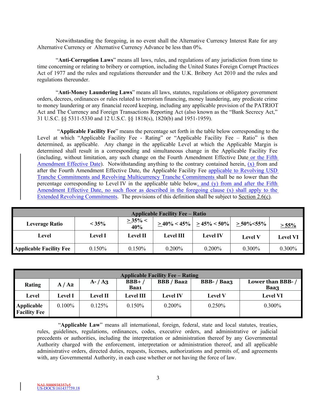NAI-5000938357v5 3 US-DOCS\161437759.18 BBB- / Baa3Rating Lower than BBB- / Baa3 Applicable Facility Fee Notwithstanding the foregoing, in no event shall the Alternative Currency Interest Rate for any Alternative Currency or Alternative Currency Advance be less than 0%. “Anti-Corruption Laws” means all laws, rules, and regulations of any jurisdiction from time to time concerning or relating to bribery or corruption, including the United States Foreign Corrupt Practices Act of 1977 and the rules and regulations thereunder and the U.K. Bribery Act 2010 and the rules and regulations thereunder. “Anti-Money Laundering Laws” means all laws, statutes, regulations or obligatory government orders, decrees, ordinances or rules related to terrorism financing, money laundering, any predicate crime to money laundering or any financial record keeping, including any applicable provision of the PATRIOT Act and The Currency and Foreign Transactions Reporting Act (also known as the “Bank Secrecy Act,” 31 U.S.C. §§ 5311-5330 and 12 U.S.C. §§ 1818(s), 1820(b) and 1951-1959). “Applicable Facility Fee” means the percentage set forth in the table below corresponding to the Level at which “Applicable Facility Fee - Rating” or “Applicable Facility Fee – Ratio” is then determined, as applicable. Any change in the applicable Level at which the Applicable Margin is determined shall result in a corresponding and simultaneous change in the Applicable Facility Fee (including, without limitation, any such change on the Fourth Amendment Effective Date or the Fifth Amendment Effective Date). Notwithstanding anything to the contrary contained herein, (x) from and after the Fourth Amendment Effective Date, the Applicable Facility Fee applicable to Revolving USD Tranche Commitments and Revolving Multicurrency Tranche Commitments shall be no lower than the percentage corresponding to Level IV in the applicable table below, and (y) from and after the Fifth Amendment Effective Date, no such floor as described in the foregoing clause (x) shall apply to the Extended Revolving Commitments. The provisions of this definition shall be subject to Section 2.6(c). 0.100% A / A2 0.125% Applicable Facility Fee – Rating 0.150% Level 0.200% A- / A3 0.250% Level I 0.300% “Applicable Law” means all international, foreign, federal, state and local statutes, treaties, rules, guidelines, regulations, ordinances, codes, executive orders, and administrative or judicial precedents or authorities, including the interpretation or administration thereof by any Governmental Authority charged with the enforcement, interpretation or administration thereof, and all applicable administrative orders, directed duties, requests, licenses, authorizations and permits of, and agreements with, any Governmental Authority, in each case whether or not having the force of law. Level II BBB+ / Baa1 Level III Level IV BBB / Baa2 Level V Level VI > 50%<55% Level VI < 35% > 55% Applicable Facility Fee 0.150% 0.150% > 35% < 40% 0.200% Level 0.200% Applicable Facility Fee – Ratio 0.300% Level I 0.300% > 40% < 45% Level II Leverage Ratio Level III > 45% < 50% Level IV Level V