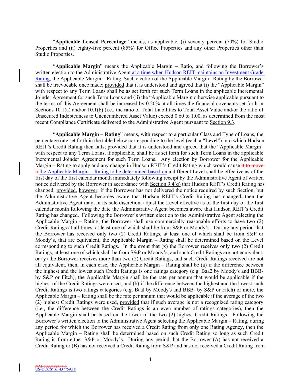 NAI-5000938357v5 US-DOCS\161437759.18 4 “Applicable Leased Percentage” means, as applicable, (i) seventy percent (70%) for Studio Properties and (ii) eighty-five percent (85%) for Office Properties and any other Properties other than Studio Properties. “Applicable Margin” means the Applicable Margin – Ratio, and following the Borrower’s written election to the Administrative Agent at a time when Hudson REIT maintains an Investment Grade Rating, the Applicable Margin – Rating. Such election of the Applicable Margin– Rating by the Borrower shall be irrevocable once made; provided that it is understood and agreed that (i) the “Applicable Margin” with respect to any Term Loans shall be as set forth for such Term Loans in the applicable Incremental Joinder Agreement for such Term Loans and (ii) the “Applicable Margin otherwise applicable pursuant to the terms of this Agreement shall be increased by 0.20% at all times the financial covenants set forth in Sections 10.1(a) and/or 10.1(b) (i.e., the ratio of Total Liabilities to Total Asset Value and/or the ratio of Unsecured Indebtedness to Unencumbered Asset Value) exceed 0.60 to 1.00, as determined from the most recent Compliance Certificate delivered to the Administrative Agent pursuant to Section 9.3. “Applicable Margin – Rating” means, with respect to a particular Class and Type of Loans, the percentage rate set forth in the table below corresponding to the level (each a “Level”) into which Hudson REIT’s Credit Rating then falls; provided that it is understood and agreed that the “Applicable Margin” with respect to any Term Loans, if applicable, shall be as set forth for such Term Loans in the applicable Incremental Joinder Agreement for such Term Loans. Any election by Borrower for the Applicable Margin – Rating to apply and any change in Hudson REIT’s Credit Rating which would cause it to move tothe Applicable Margin – Rating to be determined based on a different Level shall be effective as of the first day of the first calendar month immediately following receipt by the Administrative Agent of written notice delivered by the Borrower in accordance with Section 9.4(q) that Hudson REIT’s Credit Rating has changed; provided, however, if the Borrower has not delivered the notice required by such Section, but the Administrative Agent becomes aware that Hudson REIT’s Credit Rating has changed, then the Administrative Agent may, in its sole discretion, adjust the Level effective as of the first day of the first calendar month following the date the Administrative Agent becomes aware that Hudson REIT’s Credit Rating has changed. Following the Borrower’s written election to the Administrative Agent selecting the Applicable Margin – Rating, the Borrower shall use commercially reasonable efforts to have two (2) Credit Ratings at all times, at least one of which shall be from S&P or Moody’s. During any period that the Borrower has received only two (2) Credit Ratings, at least one of which shall be from S&P or Moody’s, that are equivalent, the Applicable Margin – Rating shall be determined based on the Level corresponding to such Credit Ratings. In the event that (x) the Borrower receives only two (2) Credit Ratings, at least one of which shall be from S&P or Moody’s, and such Credit Ratings are not equivalent, or (y) the Borrower receives more than two (2) Credit Ratings, and such Credit Ratings received are not all equivalent, then, in each case, the Applicable Margin – Rating shall be (a) if the difference between the highest and the lowest such Credit Ratings is one ratings category (e.g. Baa2 by Moody's and BBB- by S&P or Fitch), the Applicable Margin shall be the rate per annum that would be applicable if the highest of the Credit Ratings were used; and (b) if the difference between the highest and the lowest such Credit Ratings is two ratings categories (e.g. Baal by Moody's and BBB- by S&P or Fitch) or more, the Applicable Margin – Rating shall be the rate per annum that would be applicable if the average of the two (2) highest Credit Ratings were used, provided that if such average is not a recognized rating category (i.e., the difference between the Credit Ratings is an even number of ratings categories), then the Applicable Margin shall be based on the lower of the two (2) highest Credit Ratings. Following the Borrower’s written election to the Administrative Agent selecting the Applicable Margin – Rating, during any period for which the Borrower has received a Credit Rating from only one Rating Agency, then the Applicable Margin – Rating shall be determined based on such Credit Rating so long as such Credit Rating is from either S&P or Moody’s. During any period that the Borrower (A) has not received a Credit Rating or (B) has not received a Credit Rating from S&P and has not received a Credit Rating from
