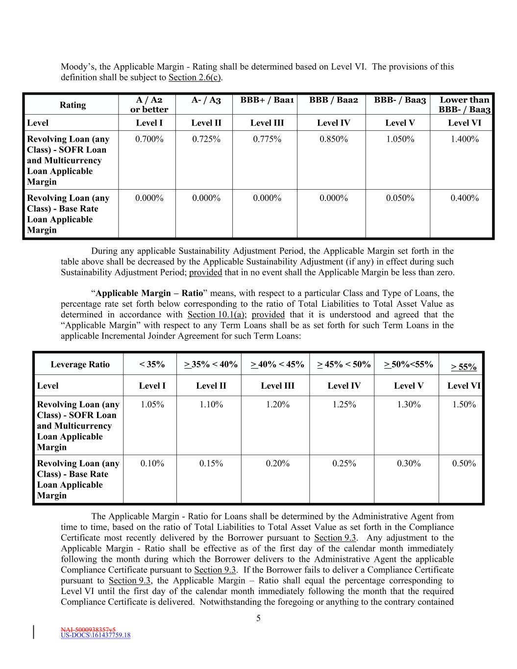 NAI-5000938357v5 5 US-DOCS\161437759.18 Leverage Ratio Level VI < 35% BBB- / Baa3 > 35% < 40% > 40% < 45% > 45% < 50% Revolving Loan (any Class) - SOFR Loan and Multicurrency Loan Applicable Margin > 50%<55% Lower than BBB- / Baa3 > 55% 0.700% A / A2 or better Level 0.725% Level I Level II 0.775% Level III Moody’s, the Applicable Margin - Rating shall be determined based on Level VI. The provisions of this definition shall be subject to Section 2.6(c). Level IV 0.850% Level V Level Level VI 1.050% A- / A3 Revolving Loan (any Class) - SOFR Loan and Multicurrency Loan Applicable Margin 1.400% 1.05% Level I 1.10% 1.20% 1.25% Revolving Loan (any Class) - Base Rate Loan Applicable Margin 1.30% Level II 1.50% 0.000% BBB+ / Baa1 Revolving Loan (any Class) - Base Rate Loan Applicable Margin 0.000% 0.10% Level III 0.15% 0.000% 0.20% 0.25% 0.000% 0.30% Level IV 0.50% 0.050% The Applicable Margin - Ratio for Loans shall be determined by the Administrative Agent from time to time, based on the ratio of Total Liabilities to Total Asset Value as set forth in the Compliance Certificate most recently delivered by the Borrower pursuant to Section 9.3. Any adjustment to the Applicable Margin - Ratio shall be effective as of the first day of the calendar month immediately following the month during which the Borrower delivers to the Administrative Agent the applicable Compliance Certificate pursuant to Section 9.3. If the Borrower fails to deliver a Compliance Certificate pursuant to Section 9.3, the Applicable Margin – Ratio shall equal the percentage corresponding to Level VI until the first day of the calendar month immediately following the month that the required Compliance Certificate is delivered. Notwithstanding the foregoing or anything to the contrary contained BBB / Baa2 0.400% Level V During any applicable Sustainability Adjustment Period, the Applicable Margin set forth in the table above shall be decreased by the Applicable Sustainability Adjustment (if any) in effect during such Sustainability Adjustment Period; provided that in no event shall the Applicable Margin be less than zero. “Applicable Margin – Ratio” means, with respect to a particular Class and Type of Loans, the percentage rate set forth below corresponding to the ratio of Total Liabilities to Total Asset Value as determined in accordance with Section 10.1(a); provided that it is understood and agreed that the “Applicable Margin” with respect to any Term Loans shall be as set forth for such Term Loans in the applicable Incremental Joinder Agreement for such Term Loans: Rating