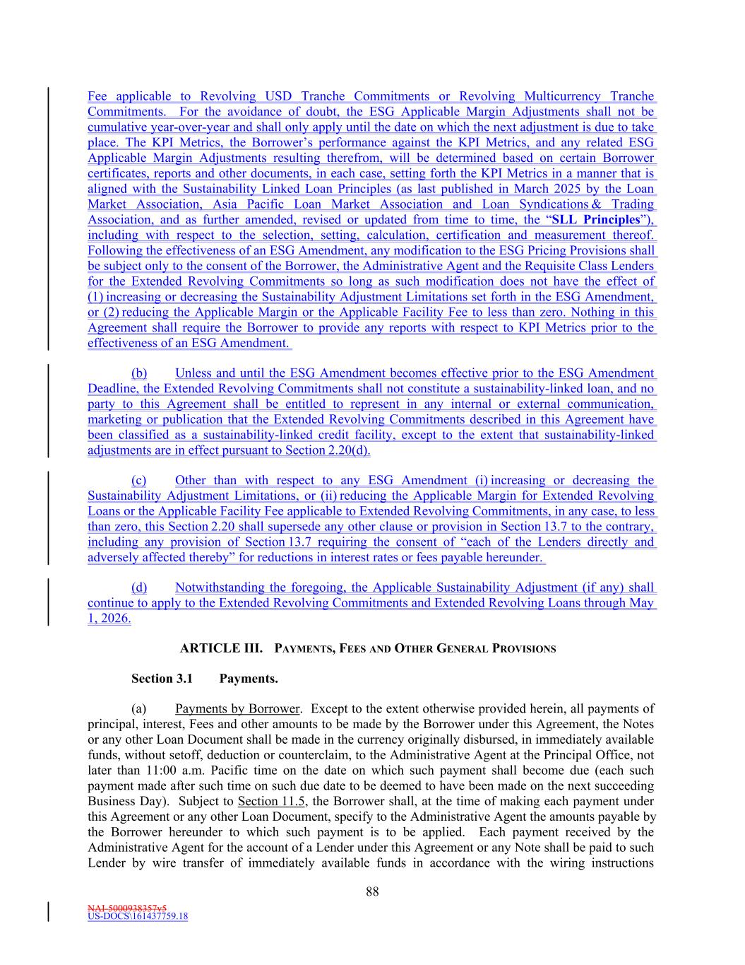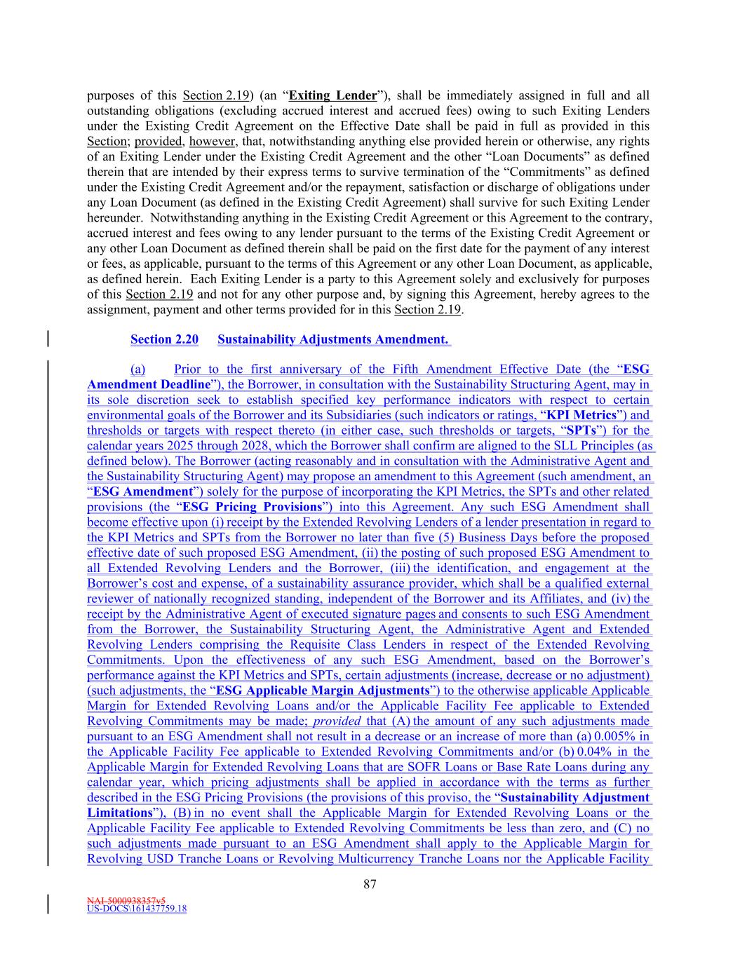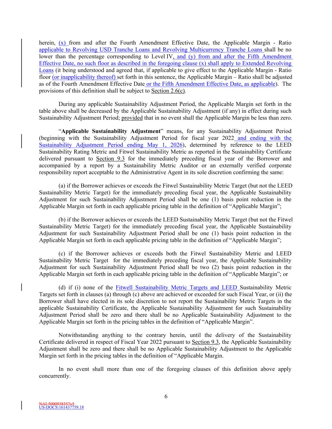 NAI-5000938357v5 US-DOCS\161437759.18 6 herein, (x) from and after the Fourth Amendment Effective Date, the Applicable Margin - Ratio applicable to Revolving USD Tranche Loans and Revolving Multicurrency Tranche Loans shall be no lower than the percentage corresponding to Level IV, and (y) from and after the Fifth Amendment Effective Date, no such floor as described in the foregoing clause (x) shall apply to Extended Revolving Loans (it being understood and agreed that, if applicable to give effect to the Applicable Margin - Ratio floor (or inapplicability thereof) set forth in this sentence, the Applicable Margin – Ratio shall be adjusted as of the Fourth Amendment Effective Date or the Fifth Amendment Effective Date, as applicable). The provisions of this definition shall be subject to Section 2.6(c). During any applicable Sustainability Adjustment Period, the Applicable Margin set forth in the table above shall be decreased by the Applicable Sustainability Adjustment (if any) in effect during such Sustainability Adjustment Period; provided that in no event shall the Applicable Margin be less than zero. “Applicable Sustainability Adjustment” means, for any Sustainability Adjustment Period (beginning with the Sustainability Adjustment Period for fiscal year 2022 and ending with the Sustainability Adjustment Period ending May 1, 2026), determined by reference to the LEED Sustainability Rating Metric and Fitwel Sustainability Metric as reported in the Sustainability Certificate delivered pursuant to Section 9.3 for the immediately preceding fiscal year of the Borrower and accompanied by a report by a Sustainability Metric Auditor or an externally verified corporate responsibility report acceptable to the Administrative Agent in its sole discretion confirming the same: (a) if the Borrower achieves or exceeds the Fitwel Sustainability Metric Target (but not the LEED Sustainability Metric Target) for the immediately preceding fiscal year, the Applicable Sustainability Adjustment for such Sustainability Adjustment Period shall be one (1) basis point reduction in the Applicable Margin set forth in each applicable pricing table in the definition of “Applicable Margin”; (b) if the Borrower achieves or exceeds the LEED Sustainability Metric Target (but not the Fitwel Sustainability Metric Target) for the immediately preceding fiscal year, the Applicable Sustainability Adjustment for such Sustainability Adjustment Period shall be one (1) basis point reduction in the Applicable Margin set forth in each applicable pricing table in the definition of “Applicable Margin”; (c) if the Borrower achieves or exceeds both the Fitwel Sustainability Metric and LEED Sustainability Metric Target for the immediately preceding fiscal year, the Applicable Sustainability Adjustment for such Sustainability Adjustment Period shall be two (2) basis point reduction in the Applicable Margin set forth in each applicable pricing table in the definition of “Applicable Margin”; or (d) if (i) none of the Fitwell Sustainability Metric Targets and LEED Sustainability Metric Targets set forth in clauses (a) through (c) above are achieved or exceeded for such Fiscal Year, or (ii) the Borrower shall have elected in its sole discretion to not report the Sustainability Metric Targets in the applicable Sustainability Certificate, the Applicable Sustainability Adjustment for such Sustainability Adjustment Period shall be zero and there shall be no Applicable Sustainability Adjustment to the Applicable Margin set forth in the pricing tables in the definition of “Applicable Margin”. Notwithstanding anything to the contrary herein, until the delivery of the Sustainability Certificate delivered in respect of Fiscal Year 2022 pursuant to Section 9.3, the Applicable Sustainability Adjustment shall be zero and there shall be no Applicable Sustainability Adjustment to the Applicable Margin set forth in the pricing tables in the definition of “Applicable Margin. In no event shall more than one of the foregoing clauses of this definition above apply concurrently.