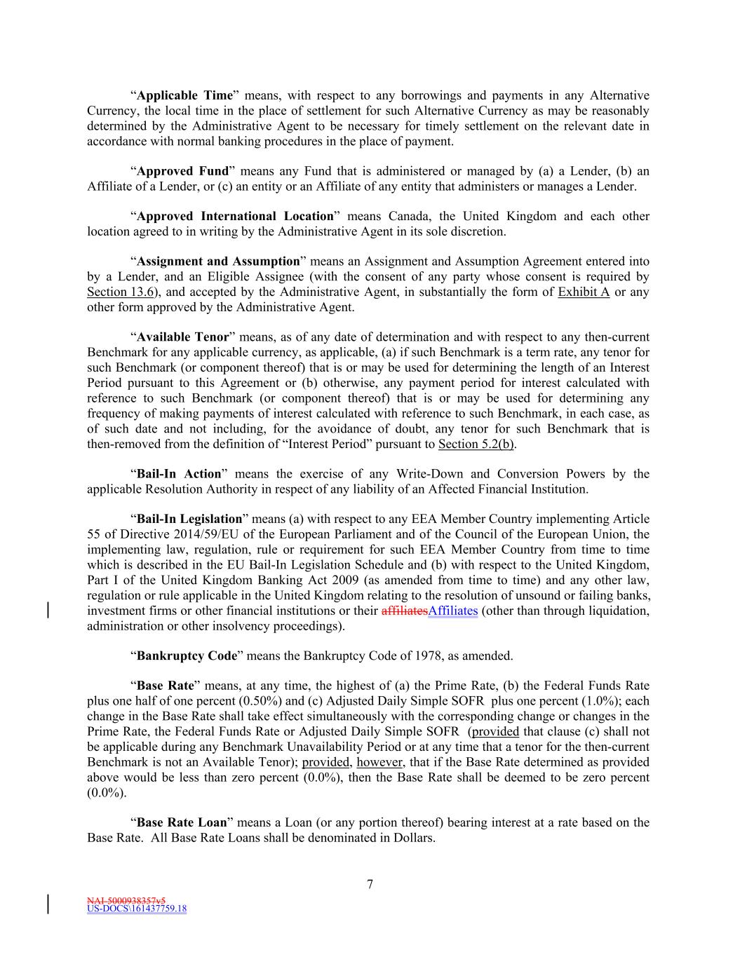 NAI-5000938357v5 US-DOCS\161437759.18 7 “Applicable Time” means, with respect to any borrowings and payments in any Alternative Currency, the local time in the place of settlement for such Alternative Currency as may be reasonably determined by the Administrative Agent to be necessary for timely settlement on the relevant date in accordance with normal banking procedures in the place of payment. “Approved Fund” means any Fund that is administered or managed by (a) a Lender, (b) an Affiliate of a Lender, or (c) an entity or an Affiliate of any entity that administers or manages a Lender. “Approved International Location” means Canada, the United Kingdom and each other location agreed to in writing by the Administrative Agent in its sole discretion. “Assignment and Assumption” means an Assignment and Assumption Agreement entered into by a Lender, and an Eligible Assignee (with the consent of any party whose consent is required by Section 13.6), and accepted by the Administrative Agent, in substantially the form of Exhibit A or any other form approved by the Administrative Agent. “Available Tenor” means, as of any date of determination and with respect to any then-current Benchmark for any applicable currency, as applicable, (a) if such Benchmark is a term rate, any tenor for such Benchmark (or component thereof) that is or may be used for determining the length of an Interest Period pursuant to this Agreement or (b) otherwise, any payment period for interest calculated with reference to such Benchmark (or component thereof) that is or may be used for determining any frequency of making payments of interest calculated with reference to such Benchmark, in each case, as of such date and not including, for the avoidance of doubt, any tenor for such Benchmark that is then-removed from the definition of “Interest Period” pursuant to Section 5.2(b). “Bail-In Action” means the exercise of any Write-Down and Conversion Powers by the applicable Resolution Authority in respect of any liability of an Affected Financial Institution. “Bail-In Legislation” means (a) with respect to any EEA Member Country implementing Article 55 of Directive 2014/59/EU of the European Parliament and of the Council of the European Union, the implementing law, regulation, rule or requirement for such EEA Member Country from time to time which is described in the EU Bail-In Legislation Schedule and (b) with respect to the United Kingdom, Part I of the United Kingdom Banking Act 2009 (as amended from time to time) and any other law, regulation or rule applicable in the United Kingdom relating to the resolution of unsound or failing banks, investment firms or other financial institutions or their affiliatesAffiliates (other than through liquidation, administration or other insolvency proceedings). “Bankruptcy Code” means the Bankruptcy Code of 1978, as amended. “Base Rate” means, at any time, the highest of (a) the Prime Rate, (b) the Federal Funds Rate plus one half of one percent (0.50%) and (c) Adjusted Daily Simple SOFR plus one percent (1.0%); each change in the Base Rate shall take effect simultaneously with the corresponding change or changes in the Prime Rate, the Federal Funds Rate or Adjusted Daily Simple SOFR (provided that clause (c) shall not be applicable during any Benchmark Unavailability Period or at any time that a tenor for the then-current Benchmark is not an Available Tenor); provided, however, that if the Base Rate determined as provided above would be less than zero percent (0.0%), then the Base Rate shall be deemed to be zero percent (0.0%). “Base Rate Loan” means a Loan (or any portion thereof) bearing interest at a rate based on the Base Rate. All Base Rate Loans shall be denominated in Dollars.