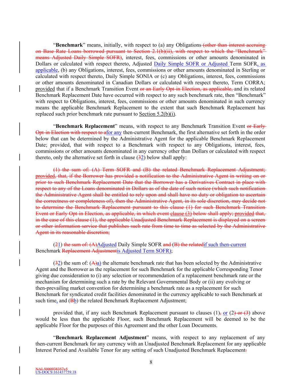 NAI-5000938357v5 US-DOCS\161437759.18 8 “Benchmark” means, initially, with respect to (a) any Obligations (other than interest accruing on Base Rate Loans borrowed pursuant to Section 2.1(b)(ii), with respect to which the “Benchmark” means Adjusted Daily Simple SOFR), interest, fees, commissions or other amounts denominated in Dollars or calculated with respect thereto, Adjusted Daily Simple SOFR or Adjusted Term SOFR, as applicable, (b) any Obligations, interest, fees, commissions or other amounts denominated in Sterling or calculated with respect thereto, Daily Simple SONIA or (c) any Obligations, interest, fees, commissions or other amounts denominated in Canadian Dollars or calculated with respect thereto, Term CORRA; provided that if a Benchmark Transition Event or an Early Opt-in Election, as applicable, and its related Benchmark Replacement Date have occurred with respect to any such benchmark rate, then “Benchmark” with respect to Obligations, interest, fees, commissions or other amounts denominated in such currency means the applicable Benchmark Replacement to the extent that such Benchmark Replacement has replaced such prior benchmark rate pursuant to Section 5.2(b)(i). “Benchmark Replacement” means, with respect to any Benchmark Transition Event or Early Opt-in Election with respect to afor any then-current Benchmark, the first alternative set forth in the order below that can be determined by the Administrative Agent for the applicable Benchmark Replacement Date; provided, that with respect to a Benchmark with respect to any Obligations, interest, fees, commissions or other amounts denominated in any currency other than Dollars or calculated with respect thereto, only the alternative set forth in clause (32) below shall apply: (1) the sum of: (A) Term SOFR and (B) the related Benchmark Replacement Adjustment; provided, that, if the Borrower has provided a notification to the Administrative Agent in writing on or prior to such Benchmark Replacement Date that the Borrower has a Derivatives Contract in place with respect to any of the Loans denominated in Dollars as of the date of such notice (which such notification the Administrative Agent shall be entitled to rely upon and shall have no duty or obligation to ascertain the correctness or completeness of), then the Administrative Agent, in its sole discretion, may decide not to determine the Benchmark Replacement pursuant to this clause (1) for such Benchmark Transition Event or Early Opt-in Election, as applicable, in which event clause (3) below shall apply; provided that, in the case of this clause (1), the applicable Unadjusted Benchmark Replacement is displayed on a screen or other information service that publishes such rate from time to time as selected by the Administrative Agent in its reasonable discretion; (21) the sum of: (A)Adjusted Daily Simple SOFR and (B) the relatedif such then-current Benchmark Replacement Adjustmentis Adjusted Term SOFR); (32) the sum of: (A)a) the alternate benchmark rate that has been selected by the Administrative Agent and the Borrower as the replacement for such Benchmark for the applicable Corresponding Tenor giving due consideration to (i) any selection or recommendation of a replacement benchmark rate or the mechanism for determining such a rate by the Relevant Governmental Body or (ii) any evolving or then-prevailing market convention for determining a benchmark rate as a replacement for such Benchmark for syndicated credit facilities denominated in the currency applicable to such Benchmark at such time, and (Bb) the related Benchmark Replacement Adjustment; provided that, if any such Benchmark Replacement pursuant to clauses (1), or (2) or (3) above would be less than the applicable Floor, such Benchmark Replacement will be deemed to be the applicable Floor for the purposes of this Agreement and the other Loan Documents. “Benchmark Replacement Adjustment” means, with respect to any replacement of any then-current Benchmark for any currency with an Unadjusted Benchmark Replacement for any applicable Interest Period and Available Tenor for any setting of such Unadjusted Benchmark Replacement: