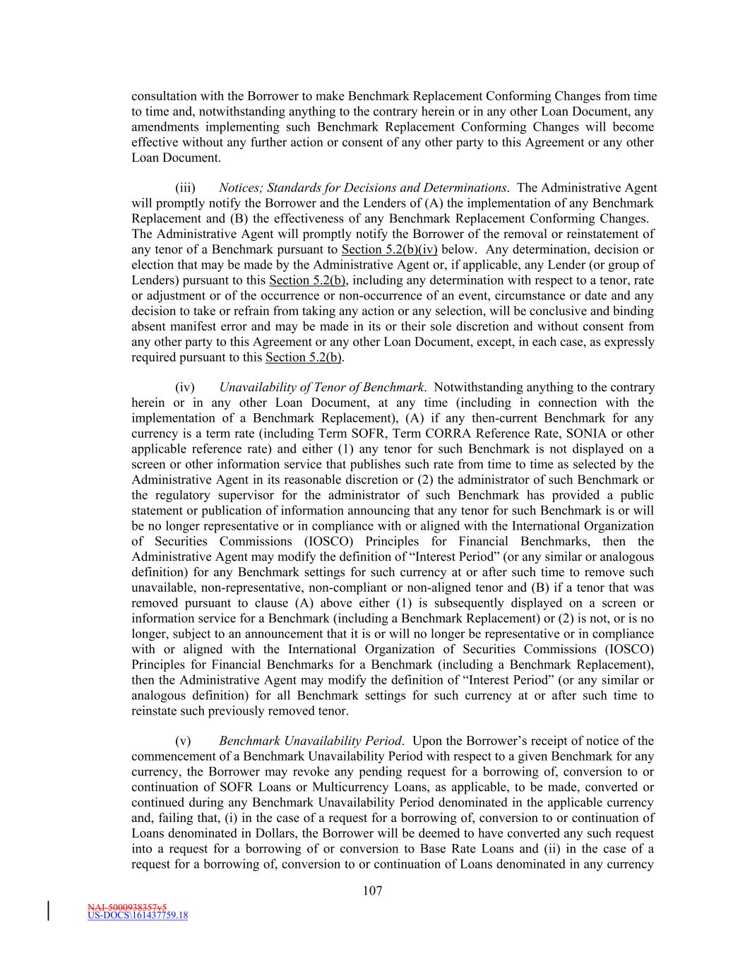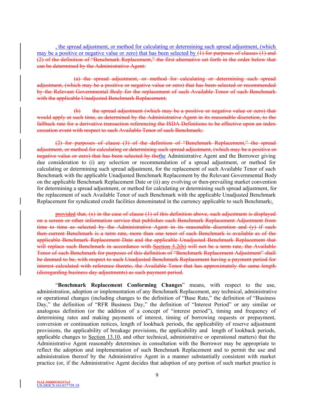 NAI-5000938357v5 US-DOCS\161437759.18 9 , the spread adjustment, or method for calculating or determining such spread adjustment, (which may be a positive or negative value or zero) that has been selected by (1) for purposes of clauses (1) and (2) of the definition of “Benchmark Replacement,” the first alternative set forth in the order below that can be determined by the Administrative Agent: (a) the spread adjustment, or method for calculating or determining such spread adjustment, (which may be a positive or negative value or zero) that has been selected or recommended by the Relevant Governmental Body for the replacement of such Available Tenor of such Benchmark with the applicable Unadjusted Benchmark Replacement; (b) the spread adjustment (which may be a positive or negative value or zero) that would apply at such time, as determined by the Administrative Agent in its reasonable discretion, to the fallback rate for a derivative transaction referencing the ISDA Definitions to be effective upon an index cessation event with respect to such Available Tenor of such Benchmark; (2) for purposes of clause (3) of the definition of “Benchmark Replacement,” the spread adjustment, or method for calculating or determining such spread adjustment, (which may be a positive or negative value or zero) that has been selected by thethe Administrative Agent and the Borrower giving due consideration to (i) any selection or recommendation of a spread adjustment, or method for calculating or determining such spread adjustment, for the replacement of such Available Tenor of such Benchmark with the applicable Unadjusted Benchmark Replacement by the Relevant Governmental Body on the applicable Benchmark Replacement Date or (ii) any evolving or then-prevailing market convention for determining a spread adjustment, or method for calculating or determining such spread adjustment, for the replacement of such Available Tenor of such Benchmark with the applicable Unadjusted Benchmark Replacement for syndicated credit facilities denominated in the currency applicable to such Benchmark;. provided that, (x) in the case of clause (1) of this definition above, such adjustment is displayed on a screen or other information service that publishes such Benchmark Replacement Adjustment from time to time as selected by the Administrative Agent in its reasonable discretion and (y) if such then-current Benchmark is a term rate, more than one tenor of such Benchmark is available as of the applicable Benchmark Replacement Date and the applicable Unadjusted Benchmark Replacement that will replace such Benchmark in accordance with Section 5.2(b) will not be a term rate, the Available Tenor of such Benchmark for purposes of this definition of “Benchmark Replacement Adjustment” shall be deemed to be, with respect to each Unadjusted Benchmark Replacement having a payment period for interest calculated with reference thereto, the Available Tenor that has approximately the same length (disregarding business day adjustments) as such payment period. “Benchmark Replacement Conforming Changes” means, with respect to the use, administration, adoption or implementation of any Benchmark Replacement, any technical, administrative or operational changes (including changes to the definition of “Base Rate,” the definition of “Business Day,” the definition of “RFR Business Day,” the definition of “Interest Period” or any similar or analogous definition (or the addition of a concept of “interest period”), timing and frequency of determining rates and making payments of interest, timing of borrowing requests or prepayment, conversion or continuation notices, length of lookback periods, the applicability of reserve adjustment provisions, the applicability of breakage provisions, the applicability and length of lookback periods, applicable changes to Section 13.10, and other technical, administrative or operational matters) that the Administrative Agent reasonably determines in consultation with the Borrower may be appropriate to reflect the adoption and implementation of such Benchmark Replacement and to permit the use and administration thereof by the Administrative Agent in a manner substantially consistent with market practice (or, if the Administrative Agent decides that adoption of any portion of such market practice is