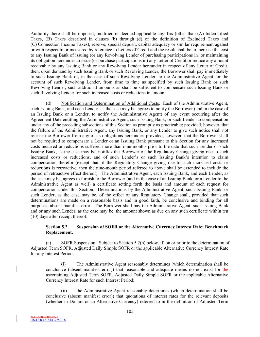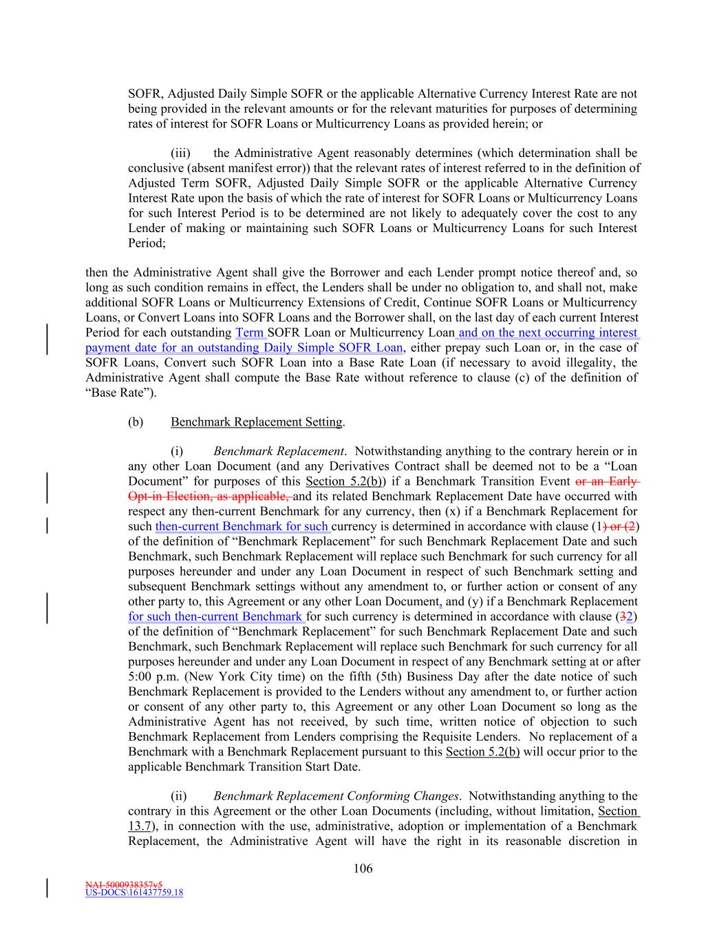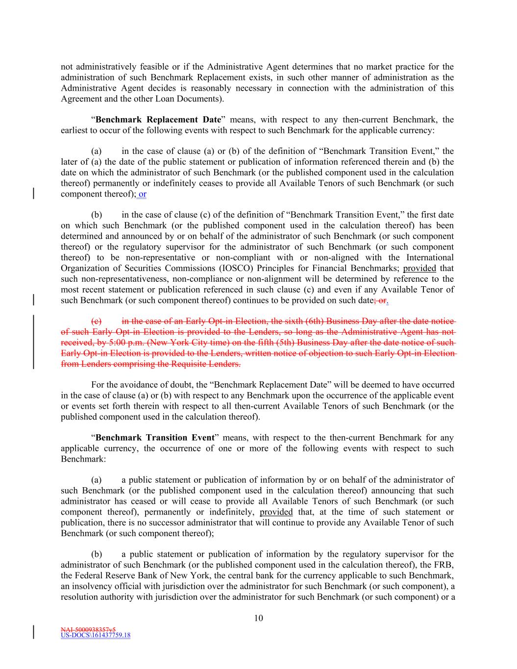 NAI-5000938357v5 US-DOCS\161437759.18 10 not administratively feasible or if the Administrative Agent determines that no market practice for the administration of such Benchmark Replacement exists, in such other manner of administration as the Administrative Agent decides is reasonably necessary in connection with the administration of this Agreement and the other Loan Documents). “Benchmark Replacement Date” means, with respect to any then-current Benchmark, the earliest to occur of the following events with respect to such Benchmark for the applicable currency: (a) in the case of clause (a) or (b) of the definition of “Benchmark Transition Event,” the later of (a) the date of the public statement or publication of information referenced therein and (b) the date on which the administrator of such Benchmark (or the published component used in the calculation thereof) permanently or indefinitely ceases to provide all Available Tenors of such Benchmark (or such component thereof); or (b) in the case of clause (c) of the definition of “Benchmark Transition Event,” the first date on which such Benchmark (or the published component used in the calculation thereof) has been determined and announced by or on behalf of the administrator of such Benchmark (or such component thereof) or the regulatory supervisor for the administrator of such Benchmark (or such component thereof) to be non-representative or non-compliant with or non-aligned with the International Organization of Securities Commissions (IOSCO) Principles for Financial Benchmarks; provided that such non-representativeness, non-compliance or non-alignment will be determined by reference to the most recent statement or publication referenced in such clause (c) and even if any Available Tenor of such Benchmark (or such component thereof) continues to be provided on such date; or. (c) in the case of an Early Opt-in Election, the sixth (6th) Business Day after the date notice of such Early Opt-in Election is provided to the Lenders, so long as the Administrative Agent has not received, by 5:00 p.m. (New York City time) on the fifth (5th) Business Day after the date notice of such Early Opt-in Election is provided to the Lenders, written notice of objection to such Early Opt-in Election from Lenders comprising the Requisite Lenders. For the avoidance of doubt, the “Benchmark Replacement Date” will be deemed to have occurred in the case of clause (a) or (b) with respect to any Benchmark upon the occurrence of the applicable event or events set forth therein with respect to all then-current Available Tenors of such Benchmark (or the published component used in the calculation thereof). “Benchmark Transition Event” means, with respect to the then-current Benchmark for any applicable currency, the occurrence of one or more of the following events with respect to such Benchmark: (a) a public statement or publication of information by or on behalf of the administrator of such Benchmark (or the published component used in the calculation thereof) announcing that such administrator has ceased or will cease to provide all Available Tenors of such Benchmark (or such component thereof), permanently or indefinitely, provided that, at the time of such statement or publication, there is no successor administrator that will continue to provide any Available Tenor of such Benchmark (or such component thereof); (b) a public statement or publication of information by the regulatory supervisor for the administrator of such Benchmark (or the published component used in the calculation thereof), the FRB, the Federal Reserve Bank of New York, the central bank for the currency applicable to such Benchmark, an insolvency official with jurisdiction over the administrator for such Benchmark (or such component), a resolution authority with jurisdiction over the administrator for such Benchmark (or such component) or a