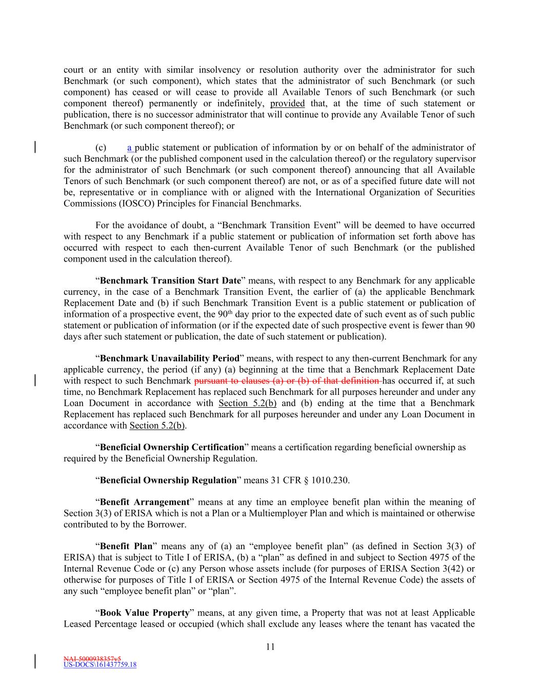 NAI-5000938357v5 US-DOCS\161437759.18 11 court or an entity with similar insolvency or resolution authority over the administrator for such Benchmark (or such component), which states that the administrator of such Benchmark (or such component) has ceased or will cease to provide all Available Tenors of such Benchmark (or such component thereof) permanently or indefinitely, provided that, at the time of such statement or publication, there is no successor administrator that will continue to provide any Available Tenor of such Benchmark (or such component thereof); or (c) a public statement or publication of information by or on behalf of the administrator of such Benchmark (or the published component used in the calculation thereof) or the regulatory supervisor for the administrator of such Benchmark (or such component thereof) announcing that all Available Tenors of such Benchmark (or such component thereof) are not, or as of a specified future date will not be, representative or in compliance with or aligned with the International Organization of Securities Commissions (IOSCO) Principles for Financial Benchmarks. For the avoidance of doubt, a “Benchmark Transition Event” will be deemed to have occurred with respect to any Benchmark if a public statement or publication of information set forth above has occurred with respect to each then-current Available Tenor of such Benchmark (or the published component used in the calculation thereof). “Benchmark Transition Start Date” means, with respect to any Benchmark for any applicable currency, in the case of a Benchmark Transition Event, the earlier of (a) the applicable Benchmark Replacement Date and (b) if such Benchmark Transition Event is a public statement or publication of information of a prospective event, the 90th day prior to the expected date of such event as of such public statement or publication of information (or if the expected date of such prospective event is fewer than 90 days after such statement or publication, the date of such statement or publication). “Benchmark Unavailability Period” means, with respect to any then-current Benchmark for any applicable currency, the period (if any) (a) beginning at the time that a Benchmark Replacement Date with respect to such Benchmark pursuant to clauses (a) or (b) of that definition has occurred if, at such time, no Benchmark Replacement has replaced such Benchmark for all purposes hereunder and under any Loan Document in accordance with Section 5.2(b) and (b) ending at the time that a Benchmark Replacement has replaced such Benchmark for all purposes hereunder and under any Loan Document in accordance with Section 5.2(b). “Beneficial Ownership Certification” means a certification regarding beneficial ownership as required by the Beneficial Ownership Regulation. “Beneficial Ownership Regulation” means 31 CFR § 1010.230. “Benefit Arrangement” means at any time an employee benefit plan within the meaning of Section 3(3) of ERISA which is not a Plan or a Multiemployer Plan and which is maintained or otherwise contributed to by the Borrower. “Benefit Plan” means any of (a) an “employee benefit plan” (as defined in Section 3(3) of ERISA) that is subject to Title I of ERISA, (b) a “plan” as defined in and subject to Section 4975 of the Internal Revenue Code or (c) any Person whose assets include (for purposes of ERISA Section 3(42) or otherwise for purposes of Title I of ERISA or Section 4975 of the Internal Revenue Code) the assets of any such “employee benefit plan” or “plan”. “Book Value Property” means, at any given time, a Property that was not at least Applicable Leased Percentage leased or occupied (which shall exclude any leases where the tenant has vacated the