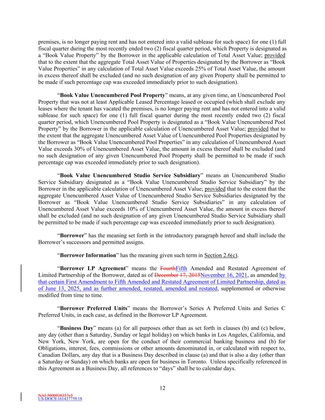 NAI-5000938357v5 US-DOCS\161437759.18 12 premises, is no longer paying rent and has not entered into a valid sublease for such space) for one (1) full fiscal quarter during the most recently ended two (2) fiscal quarter period, which Property is designated as a “Book Value Property” by the Borrower in the applicable calculation of Total Asset Value; provided that to the extent that the aggregate Total Asset Value of Properties designated by the Borrower as “Book Value Properties” in any calculation of Total Asset Value exceeds 25% of Total Asset Value, the amount in excess thereof shall be excluded (and no such designation of any given Property shall be permitted to be made if such percentage cap was exceeded immediately prior to such designation). “Book Value Unencumbered Pool Property” means, at any given time, an Unencumbered Pool Property that was not at least Applicable Leased Percentage leased or occupied (which shall exclude any leases where the tenant has vacated the premises, is no longer paying rent and has not entered into a valid sublease for such space) for one (1) full fiscal quarter during the most recently ended two (2) fiscal quarter period, which Unencumbered Pool Property is designated as a “Book Value Unencumbered Pool Property” by the Borrower in the applicable calculation of Unencumbered Asset Value; provided that to the extent that the aggregate Unencumbered Asset Value of Unencumbered Pool Properties designated by the Borrower as “Book Value Unencumbered Pool Properties” in any calculation of Unencumbered Asset Value exceeds 30% of Unencumbered Asset Value, the amount in excess thereof shall be excluded (and no such designation of any given Unencumbered Pool Property shall be permitted to be made if such percentage cap was exceeded immediately prior to such designation). “Book Value Unencumbered Studio Service Subsidiary” means an Unencumbered Studio Service Subsidiary designated as a “Book Value Unencumbered Studio Service Subsidiary” by the Borrower in the applicable calculation of Unencumbered Asset Value; provided that to the extent that the aggregate Unencumbered Asset Value of Unencumbered Studio Service Subsidiaries designated by the Borrower as “Book Value Unencumbered Studio Service Subsidiaries” in any calculation of Unencumbered Asset Value exceeds 10% of Unencumbered Asset Value, the amount in excess thereof shall be excluded (and no such designation of any given Unencumbered Studio Service Subsidiary shall be permitted to be made if such percentage cap was exceeded immediately prior to such designation). “Borrower” has the meaning set forth in the introductory paragraph hereof and shall include the Borrower’s successors and permitted assigns. “Borrower Information” has the meaning given such term in Section 2.6(c). “Borrower LP Agreement” means the FourthFifth Amended and Restated Agreement of Limited Partnership of the Borrower, dated as of December 17, 2015November 16, 2021, as amended by that certain First Amendment to Fifth Amended and Restated Agreement of Limited Partnership, dated as of June 13, 2025, and as further amended, restated, amended and restated, supplemented or otherwise modified from time to time. “Borrower Preferred Units” means the Borrower’s Series A Preferred Units and Series C Preferred Units, in each case, as defined in the Borrower LP Agreement. “Business Day” means (a) for all purposes other than as set forth in clauses (b) and (c) below, any day (other than a Saturday, Sunday or legal holiday) on which banks in Los Angeles, California, and New York, New York, are open for the conduct of their commercial banking business and (b) for Obligations, interest, fees, commissions or other amounts denominated in, or calculated with respect to, Canadian Dollars, any day that is a Business Day described in clause (a) and that is also a day (other than a Saturday or Sunday) on which banks are open for business in Toronto. Unless specifically referenced in this Agreement as a Business Day, all references to “days” shall be to calendar days.