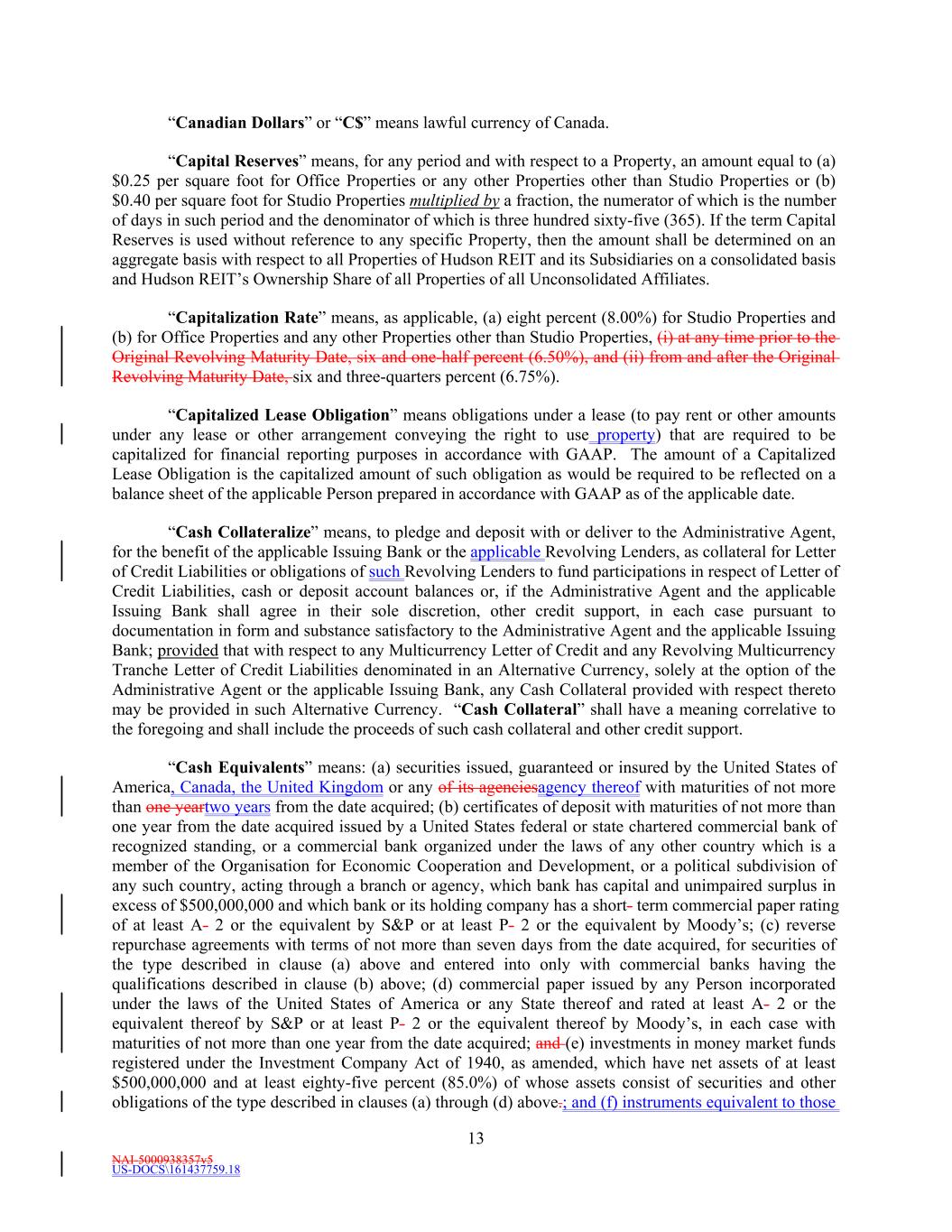 NAI-5000938357v5 US-DOCS\161437759.18 13 “Canadian Dollars” or “C$” means lawful currency of Canada. “Capital Reserves” means, for any period and with respect to a Property, an amount equal to (a) $0.25 per square foot for Office Properties or any other Properties other than Studio Properties or (b) $0.40 per square foot for Studio Properties multiplied by a fraction, the numerator of which is the number of days in such period and the denominator of which is three hundred sixty-five (365). If the term Capital Reserves is used without reference to any specific Property, then the amount shall be determined on an aggregate basis with respect to all Properties of Hudson REIT and its Subsidiaries on a consolidated basis and Hudson REIT’s Ownership Share of all Properties of all Unconsolidated Affiliates. “Capitalization Rate” means, as applicable, (a) eight percent (8.00%) for Studio Properties and (b) for Office Properties and any other Properties other than Studio Properties, (i) at any time prior to the Original Revolving Maturity Date, six and one-half percent (6.50%), and (ii) from and after the Original Revolving Maturity Date, six and three-quarters percent (6.75%). “Capitalized Lease Obligation” means obligations under a lease (to pay rent or other amounts under any lease or other arrangement conveying the right to use property) that are required to be capitalized for financial reporting purposes in accordance with GAAP. The amount of a Capitalized Lease Obligation is the capitalized amount of such obligation as would be required to be reflected on a balance sheet of the applicable Person prepared in accordance with GAAP as of the applicable date. “Cash Collateralize” means, to pledge and deposit with or deliver to the Administrative Agent, for the benefit of the applicable Issuing Bank or the applicable Revolving Lenders, as collateral for Letter of Credit Liabilities or obligations of such Revolving Lenders to fund participations in respect of Letter of Credit Liabilities, cash or deposit account balances or, if the Administrative Agent and the applicable Issuing Bank shall agree in their sole discretion, other credit support, in each case pursuant to documentation in form and substance satisfactory to the Administrative Agent and the applicable Issuing Bank; provided that with respect to any Multicurrency Letter of Credit and any Revolving Multicurrency Tranche Letter of Credit Liabilities denominated in an Alternative Currency, solely at the option of the Administrative Agent or the applicable Issuing Bank, any Cash Collateral provided with respect thereto may be provided in such Alternative Currency. “Cash Collateral” shall have a meaning correlative to the foregoing and shall include the proceeds of such cash collateral and other credit support. “Cash Equivalents” means: (a) securities issued, guaranteed or insured by the United States of America, Canada, the United Kingdom or any of its agenciesagency thereof with maturities of not more than one yeartwo years from the date acquired; (b) certificates of deposit with maturities of not more than one year from the date acquired issued by a United States federal or state chartered commercial bank of recognized standing, or a commercial bank organized under the laws of any other country which is a member of the Organisation for Economic Cooperation and Development, or a political subdivision of any such country, acting through a branch or agency, which bank has capital and unimpaired surplus in excess of $500,000,000 and which bank or its holding company has a short- term commercial paper rating of at least A- 2 or the equivalent by S&P or at least P- 2 or the equivalent by Moody’s; (c) reverse repurchase agreements with terms of not more than seven days from the date acquired, for securities of the type described in clause (a) above and entered into only with commercial banks having the qualifications described in clause (b) above; (d) commercial paper issued by any Person incorporated under the laws of the United States of America or any State thereof and rated at least A- 2 or the equivalent thereof by S&P or at least P- 2 or the equivalent thereof by Moody’s, in each case with maturities of not more than one year from the date acquired; and (e) investments in money market funds registered under the Investment Company Act of 1940, as amended, which have net assets of at least $500,000,000 and at least eighty-five percent (85.0%) of whose assets consist of securities and other obligations of the type described in clauses (a) through (d) above.; and (f) instruments equivalent to those