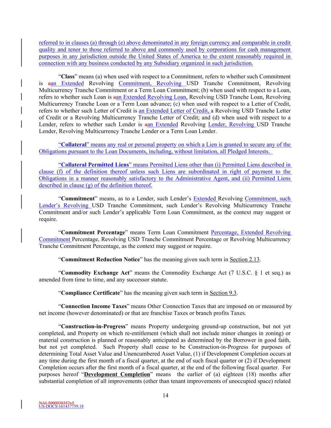 NAI-5000938357v5 US-DOCS\161437759.18 14 referred to in clauses (a) through (e) above denominated in any foreign currency and comparable in credit quality and tenor to those referred to above and commonly used by corporations for cash management purposes in any jurisdiction outside the United States of America to the extent reasonably required in connection with any business conducted by any Subsidiary organized in such jurisdiction. “Class” means (a) when used with respect to a Commitment, refers to whether such Commitment is aan Extended Revolving Commitment, Revolving USD Tranche Commitment, Revolving Multicurrency Tranche Commitment or a Term Loan Commitment; (b) when used with respect to a Loan, refers to whether such Loan is aan Extended Revolving Loan, Revolving USD Tranche Loan, Revolving Multicurrency Tranche Loan or a Term Loan advance; (c) when used with respect to a Letter of Credit, refers to whether such Letter of Credit is an Extended Letter of Credit, a Revolving USD Tranche Letter of Credit or a Revolving Multicurrency Tranche Letter of Credit; and (d) when used with respect to a Lender, refers to whether such Lender is aan Extended Revolving Lender, Revolving USD Tranche Lender, Revolving Multicurrency Tranche Lender or a Term Loan Lender. “Collateral” means any real or personal property on which a Lien is granted to secure any of the Obligations pursuant to the Loan Documents, including, without limitation, all Pledged Interests. “Collateral Permitted Liens” means Permitted Liens other than (i) Permitted Liens described in clause (f) of the definition thereof unless such Liens are subordinated in right of payment to the Obligations in a manner reasonably satisfactory to the Administrative Agent, and (ii) Permitted Liens described in clause (g) of the definition thereof. “Commitment” means, as to a Lender, such Lender’s Extended Revolving Commitment, such Lender’s Revolving USD Tranche Commitment, such Lender’s Revolving Multicurrency Tranche Commitment and/or such Lender’s applicable Term Loan Commitment, as the context may suggest or require. “Commitment Percentage” means Term Loan Commitment Percentage, Extended Revolving Commitment Percentage, Revolving USD Tranche Commitment Percentage or Revolving Multicurrency Tranche Commitment Percentage, as the context may suggest or require. “Commitment Reduction Notice” has the meaning given such term in Section 2.13. “Commodity Exchange Act” means the Commodity Exchange Act (7 U.S.C. § 1 et seq.) as amended from time to time, and any successor statute. “Compliance Certificate” has the meaning given such term in Section 9.3. “Connection Income Taxes” means Other Connection Taxes that are imposed on or measured by net income (however denominated) or that are franchise Taxes or branch profits Taxes. “Construction-in-Progress” means Property undergoing ground-up construction, but not yet completed, and Property on which re-entitlement (which shall not include minor changes in zoning) or material construction is planned or reasonably anticipated as determined by the Borrower in good faith, but not yet completed. Such Property shall cease to be Construction-in-Progress for purposes of determining Total Asset Value and Unencumbered Asset Value, (1) if Development Completion occurs at any time during the first month of a fiscal quarter, at the end of such fiscal quarter or (2) if Development Completion occurs after the first month of a fiscal quarter, at the end of the following fiscal quarter. For purposes hereof “Development Completion” means the earlier of (a) eighteen (18) months after substantial completion of all improvements (other than tenant improvements of unoccupied space) related