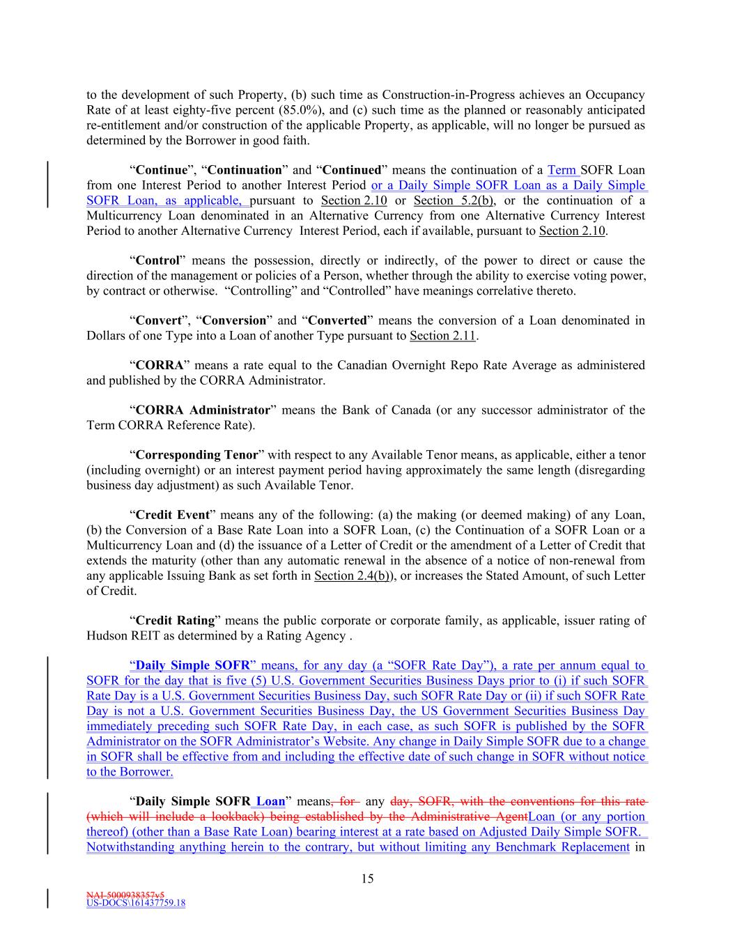 NAI-5000938357v5 US-DOCS\161437759.18 15 to the development of such Property, (b) such time as Construction-in-Progress achieves an Occupancy Rate of at least eighty-five percent (85.0%), and (c) such time as the planned or reasonably anticipated re-entitlement and/or construction of the applicable Property, as applicable, will no longer be pursued as determined by the Borrower in good faith. “Continue”, “Continuation” and “Continued” means the continuation of a Term SOFR Loan from one Interest Period to another Interest Period or a Daily Simple SOFR Loan as a Daily Simple SOFR Loan, as applicable, pursuant to Section 2.10 or Section 5.2(b), or the continuation of a Multicurrency Loan denominated in an Alternative Currency from one Alternative Currency Interest Period to another Alternative Currency Interest Period, each if available, pursuant to Section 2.10. “Control” means the possession, directly or indirectly, of the power to direct or cause the direction of the management or policies of a Person, whether through the ability to exercise voting power, by contract or otherwise. “Controlling” and “Controlled” have meanings correlative thereto. “Convert”, “Conversion” and “Converted” means the conversion of a Loan denominated in Dollars of one Type into a Loan of another Type pursuant to Section 2.11. “CORRA” means a rate equal to the Canadian Overnight Repo Rate Average as administered and published by the CORRA Administrator. “CORRA Administrator” means the Bank of Canada (or any successor administrator of the Term CORRA Reference Rate). “Corresponding Tenor” with respect to any Available Tenor means, as applicable, either a tenor (including overnight) or an interest payment period having approximately the same length (disregarding business day adjustment) as such Available Tenor. “Credit Event” means any of the following: (a) the making (or deemed making) of any Loan, (b) the Conversion of a Base Rate Loan into a SOFR Loan, (c) the Continuation of a SOFR Loan or a Multicurrency Loan and (d) the issuance of a Letter of Credit or the amendment of a Letter of Credit that extends the maturity (other than any automatic renewal in the absence of a notice of non-renewal from any applicable Issuing Bank as set forth in Section 2.4(b)), or increases the Stated Amount, of such Letter of Credit. “Credit Rating” means the public corporate or corporate family, as applicable, issuer rating of Hudson REIT as determined by a Rating Agency . “Daily Simple SOFR” means, for any day (a “SOFR Rate Day”), a rate per annum equal to SOFR for the day that is five (5) U.S. Government Securities Business Days prior to (i) if such SOFR Rate Day is a U.S. Government Securities Business Day, such SOFR Rate Day or (ii) if such SOFR Rate Day is not a U.S. Government Securities Business Day, the US Government Securities Business Day immediately preceding such SOFR Rate Day, in each case, as such SOFR is published by the SOFR Administrator on the SOFR Administrator’s Website. Any change in Daily Simple SOFR due to a change in SOFR shall be effective from and including the effective date of such change in SOFR without notice to the Borrower. “Daily Simple SOFR Loan” means, for any day, SOFR, with the conventions for this rate (which will include a lookback) being established by the Administrative AgentLoan (or any portion thereof) (other than a Base Rate Loan) bearing interest at a rate based on Adjusted Daily Simple SOFR. Notwithstanding anything herein to the contrary, but without limiting any Benchmark Replacement in