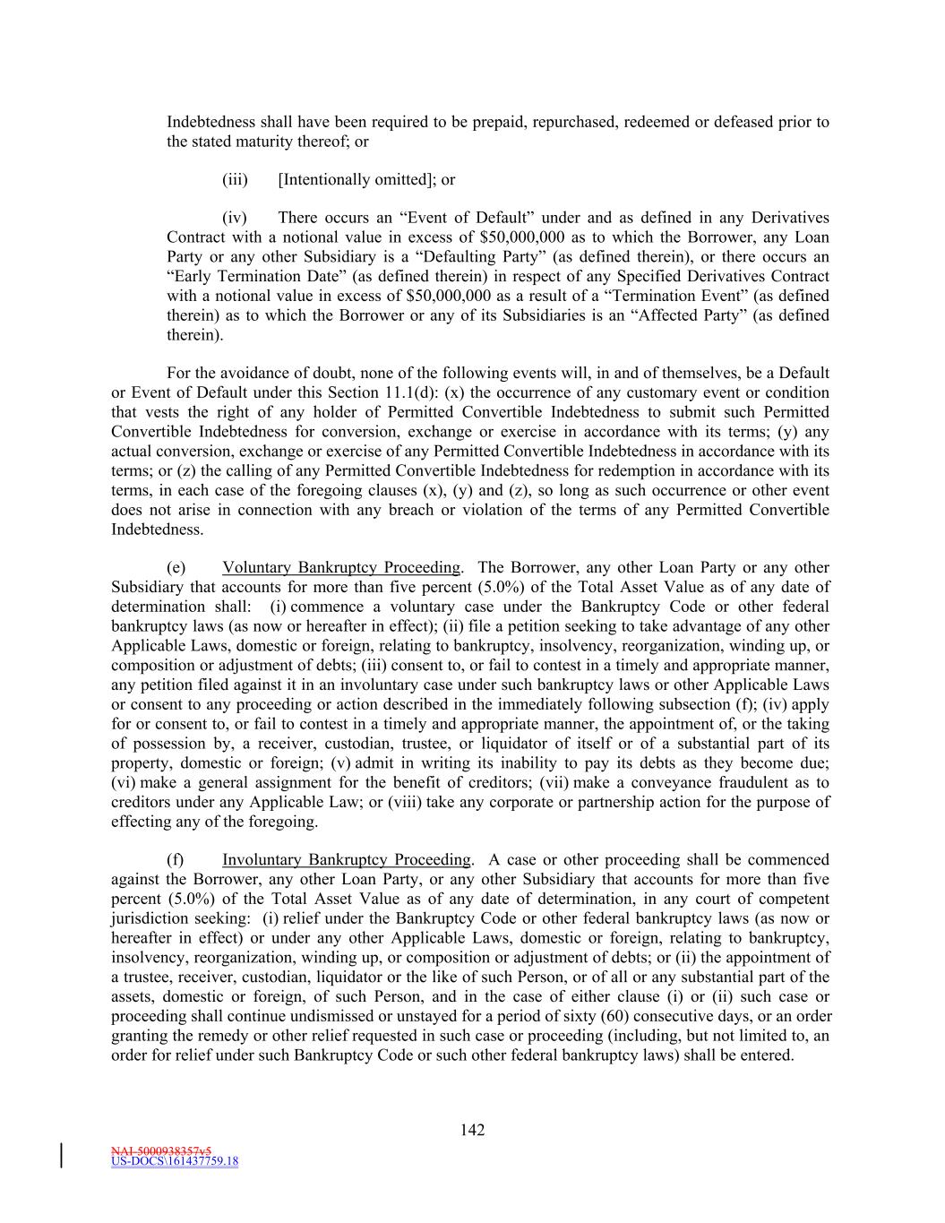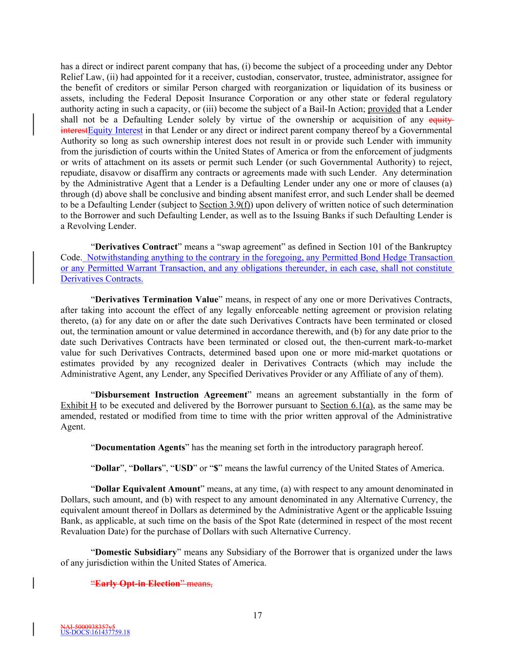 NAI-5000938357v5 US-DOCS\161437759.18 17 has a direct or indirect parent company that has, (i) become the subject of a proceeding under any Debtor Relief Law, (ii) had appointed for it a receiver, custodian, conservator, trustee, administrator, assignee for the benefit of creditors or similar Person charged with reorganization or liquidation of its business or assets, including the Federal Deposit Insurance Corporation or any other state or federal regulatory authority acting in such a capacity, or (iii) become the subject of a Bail-In Action; provided that a Lender shall not be a Defaulting Lender solely by virtue of the ownership or acquisition of any equity interestEquity Interest in that Lender or any direct or indirect parent company thereof by a Governmental Authority so long as such ownership interest does not result in or provide such Lender with immunity from the jurisdiction of courts within the United States of America or from the enforcement of judgments or writs of attachment on its assets or permit such Lender (or such Governmental Authority) to reject, repudiate, disavow or disaffirm any contracts or agreements made with such Lender. Any determination by the Administrative Agent that a Lender is a Defaulting Lender under any one or more of clauses (a) through (d) above shall be conclusive and binding absent manifest error, and such Lender shall be deemed to be a Defaulting Lender (subject to Section 3.9(f)) upon delivery of written notice of such determination to the Borrower and such Defaulting Lender, as well as to the Issuing Banks if such Defaulting Lender is a Revolving Lender. “Derivatives Contract” means a “swap agreement” as defined in Section 101 of the Bankruptcy Code. Notwithstanding anything to the contrary in the foregoing, any Permitted Bond Hedge Transaction or any Permitted Warrant Transaction, and any obligations thereunder, in each case, shall not constitute Derivatives Contracts. “Derivatives Termination Value” means, in respect of any one or more Derivatives Contracts, after taking into account the effect of any legally enforceable netting agreement or provision relating thereto, (a) for any date on or after the date such Derivatives Contracts have been terminated or closed out, the termination amount or value determined in accordance therewith, and (b) for any date prior to the date such Derivatives Contracts have been terminated or closed out, the then-current mark-to-market value for such Derivatives Contracts, determined based upon one or more mid-market quotations or estimates provided by any recognized dealer in Derivatives Contracts (which may include the Administrative Agent, any Lender, any Specified Derivatives Provider or any Affiliate of any of them). “Disbursement Instruction Agreement” means an agreement substantially in the form of Exhibit H to be executed and delivered by the Borrower pursuant to Section 6.1(a), as the same may be amended, restated or modified from time to time with the prior written approval of the Administrative Agent. “Documentation Agents” has the meaning set forth in the introductory paragraph hereof. “Dollar”, “Dollars”, “USD” or “$” means the lawful currency of the United States of America. “Dollar Equivalent Amount” means, at any time, (a) with respect to any amount denominated in Dollars, such amount, and (b) with respect to any amount denominated in any Alternative Currency, the equivalent amount thereof in Dollars as determined by the Administrative Agent or the applicable Issuing Bank, as applicable, at such time on the basis of the Spot Rate (determined in respect of the most recent Revaluation Date) for the purchase of Dollars with such Alternative Currency. “Domestic Subsidiary” means any Subsidiary of the Borrower that is organized under the laws of any jurisdiction within the United States of America. “Early Opt-in Election” means,