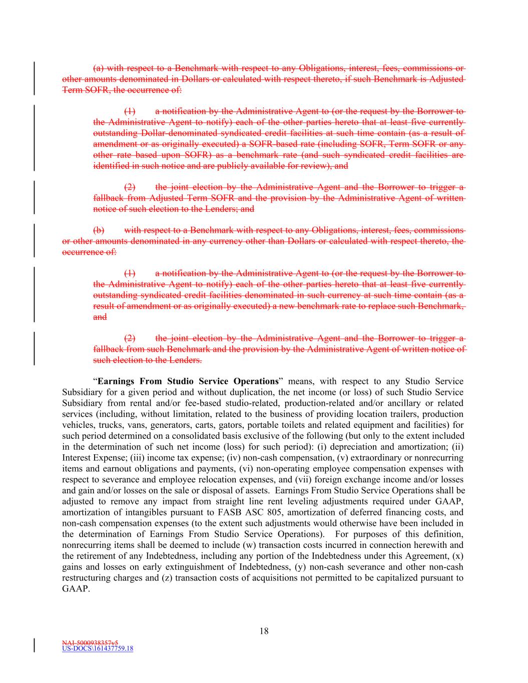 NAI-5000938357v5 US-DOCS\161437759.18 18 (a) with respect to a Benchmark with respect to any Obligations, interest, fees, commissions or other amounts denominated in Dollars or calculated with respect thereto, if such Benchmark is Adjusted Term SOFR, the occurrence of: (1) a notification by the Administrative Agent to (or the request by the Borrower to the Administrative Agent to notify) each of the other parties hereto that at least five currently outstanding Dollar-denominated syndicated credit facilities at such time contain (as a result of amendment or as originally executed) a SOFR-based rate (including SOFR, Term SOFR or any other rate based upon SOFR) as a benchmark rate (and such syndicated credit facilities are identified in such notice and are publicly available for review), and (2) the joint election by the Administrative Agent and the Borrower to trigger a fallback from Adjusted Term SOFR and the provision by the Administrative Agent of written notice of such election to the Lenders; and (b) with respect to a Benchmark with respect to any Obligations, interest, fees, commissions or other amounts denominated in any currency other than Dollars or calculated with respect thereto, the occurrence of: (1) a notification by the Administrative Agent to (or the request by the Borrower to the Administrative Agent to notify) each of the other parties hereto that at least five currently outstanding syndicated credit facilities denominated in such currency at such time contain (as a result of amendment or as originally executed) a new benchmark rate to replace such Benchmark, and (2) the joint election by the Administrative Agent and the Borrower to trigger a fallback from such Benchmark and the provision by the Administrative Agent of written notice of such election to the Lenders. “Earnings From Studio Service Operations” means, with respect to any Studio Service Subsidiary for a given period and without duplication, the net income (or loss) of such Studio Service Subsidiary from rental and/or fee-based studio-related, production-related and/or ancillary or related services (including, without limitation, related to the business of providing location trailers, production vehicles, trucks, vans, generators, carts, gators, portable toilets and related equipment and facilities) for such period determined on a consolidated basis exclusive of the following (but only to the extent included in the determination of such net income (loss) for such period): (i) depreciation and amortization; (ii) Interest Expense; (iii) income tax expense; (iv) non-cash compensation, (v) extraordinary or nonrecurring items and earnout obligations and payments, (vi) non-operating employee compensation expenses with respect to severance and employee relocation expenses, and (vii) foreign exchange income and/or losses and gain and/or losses on the sale or disposal of assets. Earnings From Studio Service Operations shall be adjusted to remove any impact from straight line rent leveling adjustments required under GAAP, amortization of intangibles pursuant to FASB ASC 805, amortization of deferred financing costs, and non-cash compensation expenses (to the extent such adjustments would otherwise have been included in the determination of Earnings From Studio Service Operations). For purposes of this definition, nonrecurring items shall be deemed to include (w) transaction costs incurred in connection herewith and the retirement of any Indebtedness, including any portion of the Indebtedness under this Agreement, (x) gains and losses on early extinguishment of Indebtedness, (y) non-cash severance and other non-cash restructuring charges and (z) transaction costs of acquisitions not permitted to be capitalized pursuant to GAAP.