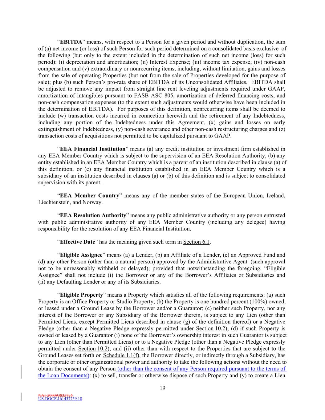 NAI-5000938357v5 US-DOCS\161437759.18 19 “EBITDA” means, with respect to a Person for a given period and without duplication, the sum of (a) net income (or loss) of such Person for such period determined on a consolidated basis exclusive of the following (but only to the extent included in the determination of such net income (loss) for such period): (i) depreciation and amortization; (ii) Interest Expense; (iii) income tax expense; (iv) non-cash compensation and (v) extraordinary or nonrecurring items, including, without limitation, gains and losses from the sale of operating Properties (but not from the sale of Properties developed for the purpose of sale); plus (b) such Person’s pro-rata share of EBITDA of its Unconsolidated Affiliates. EBITDA shall be adjusted to remove any impact from straight line rent leveling adjustments required under GAAP, amortization of intangibles pursuant to FASB ASC 805, amortization of deferred financing costs, and non-cash compensation expenses (to the extent such adjustments would otherwise have been included in the determination of EBITDA). For purposes of this definition, nonrecurring items shall be deemed to include (w) transaction costs incurred in connection herewith and the retirement of any Indebtedness, including any portion of the Indebtedness under this Agreement, (x) gains and losses on early extinguishment of Indebtedness, (y) non-cash severance and other non-cash restructuring charges and (z) transaction costs of acquisitions not permitted to be capitalized pursuant to GAAP. “EEA Financial Institution” means (a) any credit institution or investment firm established in any EEA Member Country which is subject to the supervision of an EEA Resolution Authority, (b) any entity established in an EEA Member Country which is a parent of an institution described in clause (a) of this definition, or (c) any financial institution established in an EEA Member Country which is a subsidiary of an institution described in clauses (a) or (b) of this definition and is subject to consolidated supervision with its parent. “EEA Member Country” means any of the member states of the European Union, Iceland, Liechtenstein, and Norway. “EEA Resolution Authority” means any public administrative authority or any person entrusted with public administrative authority of any EEA Member Country (including any delegee) having responsibility for the resolution of any EEA Financial Institution. “Effective Date” has the meaning given such term in Section 6.1. “Eligible Assignee” means (a) a Lender, (b) an Affiliate of a Lender, (c) an Approved Fund and (d) any other Person (other than a natural person) approved by the Administrative Agent (such approval not to be unreasonably withheld or delayed); provided that notwithstanding the foregoing, “Eligible Assignee” shall not include (i) the Borrower or any of the Borrower’s Affiliates or Subsidiaries and (ii) any Defaulting Lender or any of its Subsidiaries. “Eligible Property” means a Property which satisfies all of the following requirements: (a) such Property is an Office Property or Studio Property; (b) the Property is one hundred percent (100%) owned, or leased under a Ground Lease by the Borrower and/or a Guarantor; (c) neither such Property, nor any interest of the Borrower or any Subsidiary of the Borrower therein, is subject to any Lien (other than Permitted Liens, except Permitted Liens described in clause (g) of the definition thereof) or a Negative Pledge (other than a Negative Pledge expressly permitted under Section 10.2); (d) if such Property is owned or leased by a Guarantor (i) none of the Borrower’s ownership interest in such Guarantor is subject to any Lien (other than Permitted Liens) or to a Negative Pledge (other than a Negative Pledge expressly permitted under Section 10.2); and (ii) other than with respect to the Properties that are subject to the Ground Leases set forth on Schedule 1.1(f), the Borrower directly, or indirectly through a Subsidiary, has the corporate or other organizational power and authority to take the following actions without the need to obtain the consent of any Person (other than the consent of any Person required pursuant to the terms of the Loan Documents): (x) to sell, transfer or otherwise dispose of such Property and (y) to create a Lien