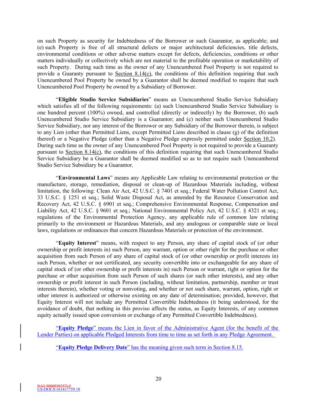 NAI-5000938357v5 US-DOCS\161437759.18 20 on such Property as security for Indebtedness of the Borrower or such Guarantor, as applicable; and (e) such Property is free of all structural defects or major architectural deficiencies, title defects, environmental conditions or other adverse matters except for defects, deficiencies, conditions or other matters individually or collectively which are not material to the profitable operation or marketability of such Property. During such time as the owner of any Unencumbered Pool Property is not required to provide a Guaranty pursuant to Section 8.14(c), the conditions of this definition requiring that such Unencumbered Pool Property be owned by a Guarantor shall be deemed modified to require that such Unencumbered Pool Property be owned by a Subsidiary of Borrower. “Eligible Studio Service Subsidiaries” means an Unencumbered Studio Service Subsidiary which satisfies all of the following requirements: (a) such Unencumbered Studio Service Subsidiary is one hundred percent (100%) owned, and controlled (directly or indirectly) by the Borrower, (b) such Unencumbered Studio Service Subsidiary is a Guarantor; and (c) neither such Unencumbered Studio Service Subsidiary, nor any interest of the Borrower or any Subsidiary of the Borrower therein, is subject to any Lien (other than Permitted Liens, except Permitted Liens described in clause (g) of the definition thereof) or a Negative Pledge (other than a Negative Pledge expressly permitted under Section 10.2). During such time as the owner of any Unencumbered Pool Property is not required to provide a Guaranty pursuant to Section 8.14(c), the conditions of this definition requiring that such Unencumbered Studio Service Subsidiary be a Guarantor shall be deemed modified so as to not require such Unencumbered Studio Service Subsidiary be a Guarantor. “Environmental Laws” means any Applicable Law relating to environmental protection or the manufacture, storage, remediation, disposal or clean-up of Hazardous Materials including, without limitation, the following: Clean Air Act, 42 U.S.C. § 7401 et seq.; Federal Water Pollution Control Act, 33 U.S.C. § 1251 et seq.; Solid Waste Disposal Act, as amended by the Resource Conservation and Recovery Act, 42 U.S.C. § 6901 et seq.; Comprehensive Environmental Response, Compensation and Liability Act, 42 U.S.C. § 9601 et seq.; National Environmental Policy Act, 42 U.S.C. § 4321 et seq.; regulations of the Environmental Protection Agency, any applicable rule of common law relating primarily to the environment or Hazardous Materials, and any analogous or comparable state or local laws, regulations or ordinances that concern Hazardous Materials or protection of the environment. “Equity Interest” means, with respect to any Person, any share of capital stock of (or other ownership or profit interests in) such Person, any warrant, option or other right for the purchase or other acquisition from such Person of any share of capital stock of (or other ownership or profit interests in) such Person, whether or not certificated, any security convertible into or exchangeable for any share of capital stock of (or other ownership or profit interests in) such Person or warrant, right or option for the purchase or other acquisition from such Person of such shares (or such other interests), and any other ownership or profit interest in such Person (including, without limitation, partnership, member or trust interests therein), whether voting or nonvoting, and whether or not such share, warrant, option, right or other interest is authorized or otherwise existing on any date of determination; provided, however, that Equity Interest will not include any Permitted Convertible Indebtedness (it being understood, for the avoidance of doubt, that nothing in this proviso affects the status, as Equity Interests, of any common equity actually issued upon conversion or exchange of any Permitted Convertible Indebtedness). “Equity Pledge” means the Lien in favor of the Administrative Agent (for the benefit of the Lender Parties) on applicable Pledged Interests from time to time as set forth in any Pledge Agreement. “Equity Pledge Delivery Date” has the meaning given such term in Section 8.15.