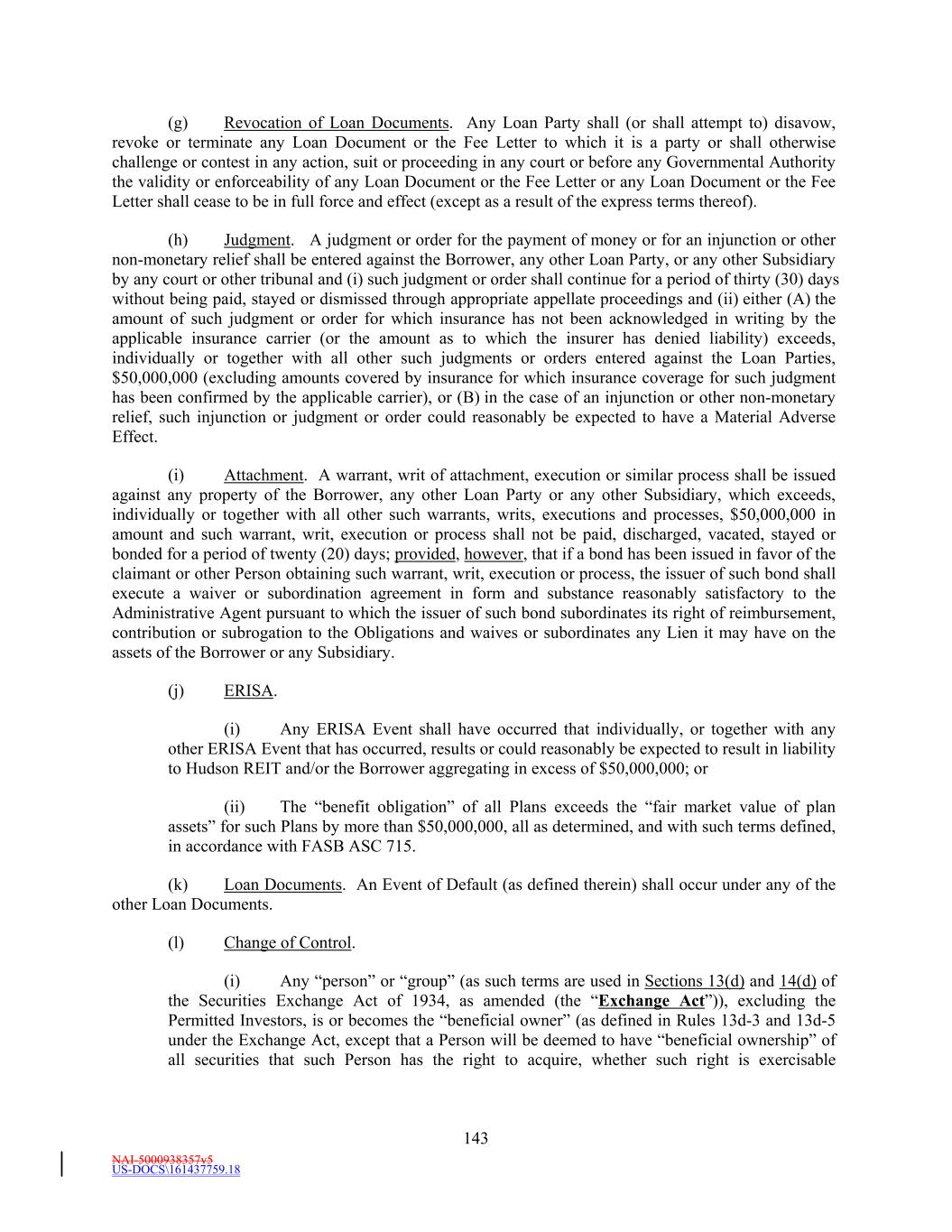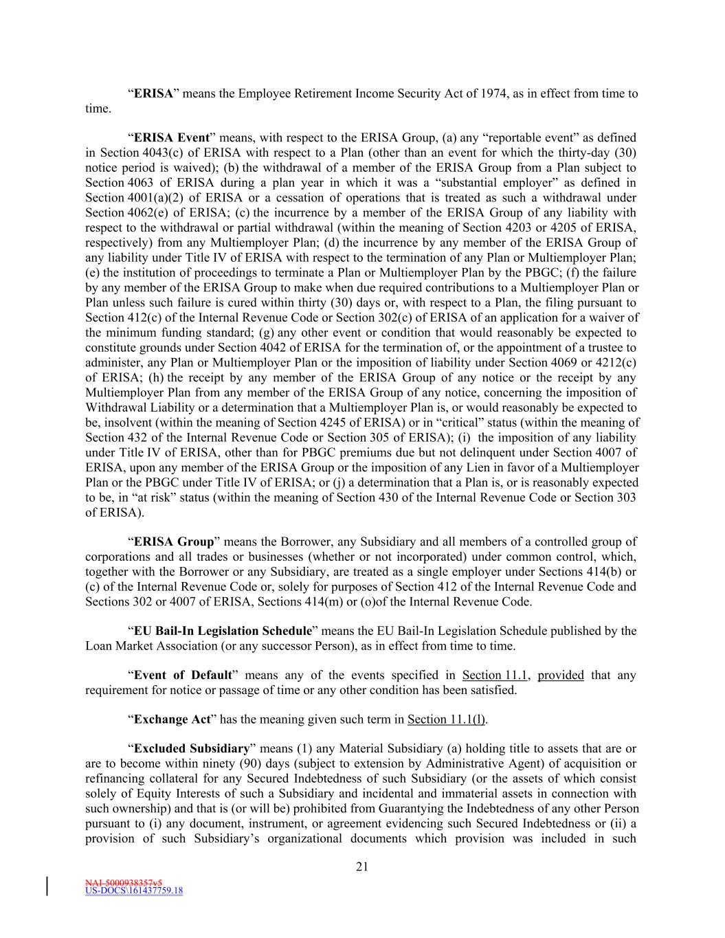 NAI-5000938357v5 US-DOCS\161437759.18 21 “ERISA” means the Employee Retirement Income Security Act of 1974, as in effect from time to time. “ERISA Event” means, with respect to the ERISA Group, (a) any “reportable event” as defined in Section 4043(c) of ERISA with respect to a Plan (other than an event for which the thirty-day (30) notice period is waived); (b) the withdrawal of a member of the ERISA Group from a Plan subject to Section 4063 of ERISA during a plan year in which it was a “substantial employer” as defined in Section 4001(a)(2) of ERISA or a cessation of operations that is treated as such a withdrawal under Section 4062(e) of ERISA; (c) the incurrence by a member of the ERISA Group of any liability with respect to the withdrawal or partial withdrawal (within the meaning of Section 4203 or 4205 of ERISA, respectively) from any Multiemployer Plan; (d) the incurrence by any member of the ERISA Group of any liability under Title IV of ERISA with respect to the termination of any Plan or Multiemployer Plan; (e) the institution of proceedings to terminate a Plan or Multiemployer Plan by the PBGC; (f) the failure by any member of the ERISA Group to make when due required contributions to a Multiemployer Plan or Plan unless such failure is cured within thirty (30) days or, with respect to a Plan, the filing pursuant to Section 412(c) of the Internal Revenue Code or Section 302(c) of ERISA of an application for a waiver of the minimum funding standard; (g) any other event or condition that would reasonably be expected to constitute grounds under Section 4042 of ERISA for the termination of, or the appointment of a trustee to administer, any Plan or Multiemployer Plan or the imposition of liability under Section 4069 or 4212(c) of ERISA; (h) the receipt by any member of the ERISA Group of any notice or the receipt by any Multiemployer Plan from any member of the ERISA Group of any notice, concerning the imposition of Withdrawal Liability or a determination that a Multiemployer Plan is, or would reasonably be expected to be, insolvent (within the meaning of Section 4245 of ERISA) or in “critical” status (within the meaning of Section 432 of the Internal Revenue Code or Section 305 of ERISA); (i) the imposition of any liability under Title IV of ERISA, other than for PBGC premiums due but not delinquent under Section 4007 of ERISA, upon any member of the ERISA Group or the imposition of any Lien in favor of a Multiemployer Plan or the PBGC under Title IV of ERISA; or (j) a determination that a Plan is, or is reasonably expected to be, in “at risk” status (within the meaning of Section 430 of the Internal Revenue Code or Section 303 of ERISA). “ERISA Group” means the Borrower, any Subsidiary and all members of a controlled group of corporations and all trades or businesses (whether or not incorporated) under common control, which, together with the Borrower or any Subsidiary, are treated as a single employer under Sections 414(b) or (c) of the Internal Revenue Code or, solely for purposes of Section 412 of the Internal Revenue Code and Sections 302 or 4007 of ERISA, Sections 414(m) or (o)of the Internal Revenue Code. “EU Bail-In Legislation Schedule” means the EU Bail-In Legislation Schedule published by the Loan Market Association (or any successor Person), as in effect from time to time. “Event of Default” means any of the events specified in Section 11.1, provided that any requirement for notice or passage of time or any other condition has been satisfied. “Exchange Act” has the meaning given such term in Section 11.1(l). “Excluded Subsidiary” means (1) any Material Subsidiary (a) holding title to assets that are or are to become within ninety (90) days (subject to extension by Administrative Agent) of acquisition or refinancing collateral for any Secured Indebtedness of such Subsidiary (or the assets of which consist solely of Equity Interests of such a Subsidiary and incidental and immaterial assets in connection with such ownership) and that is (or will be) prohibited from Guarantying the Indebtedness of any other Person pursuant to (i) any document, instrument, or agreement evidencing such Secured Indebtedness or (ii) a provision of such Subsidiary’s organizational documents which provision was included in such