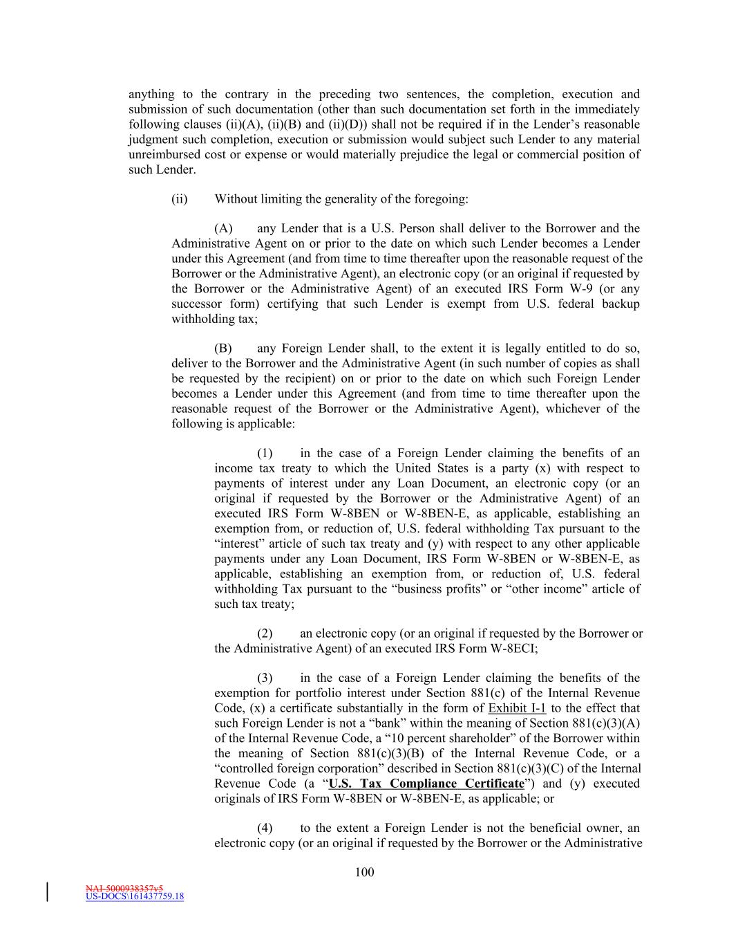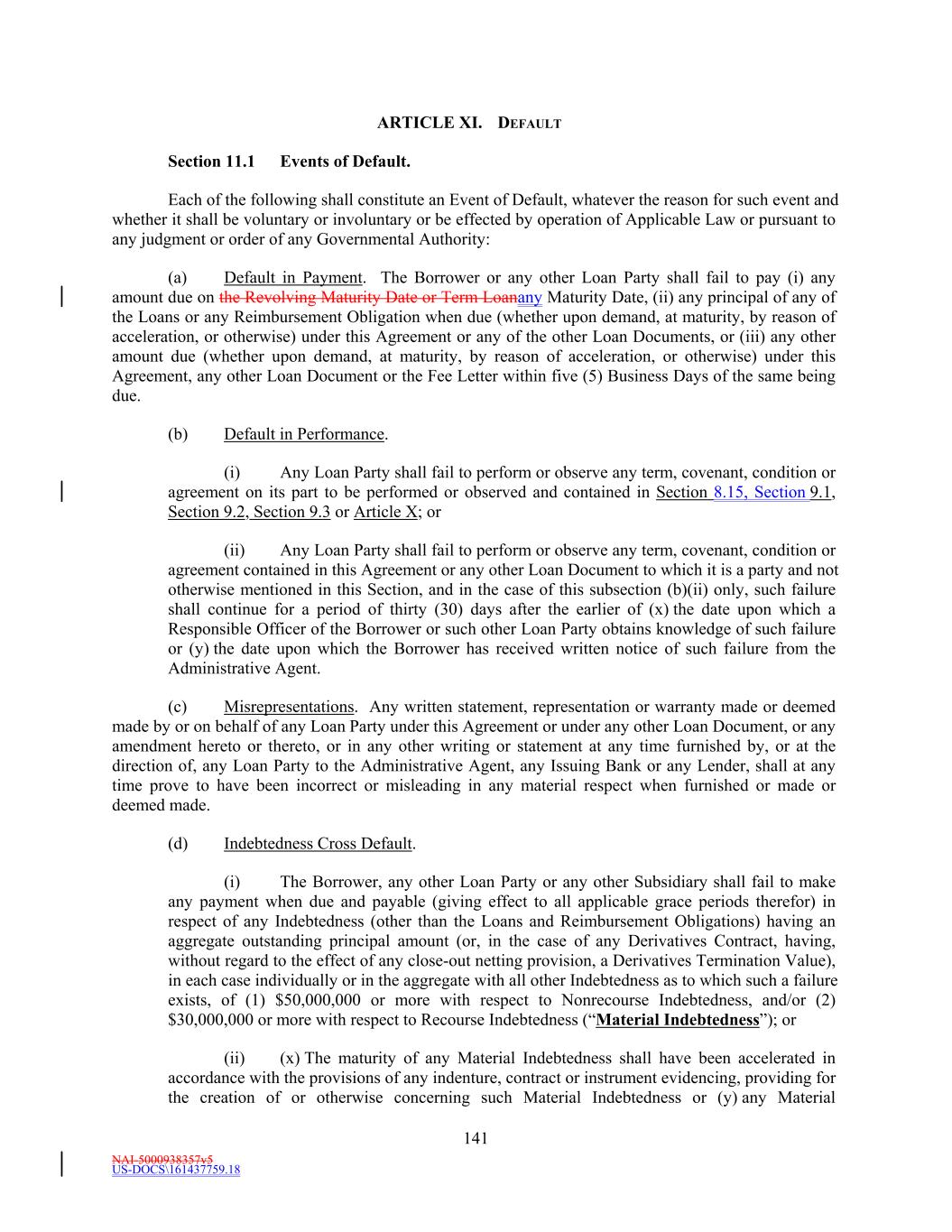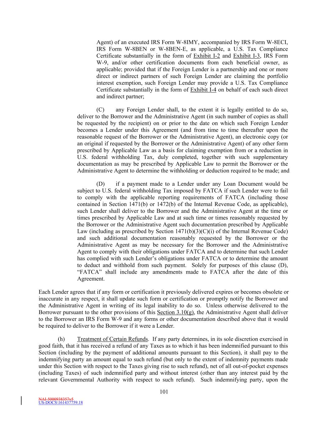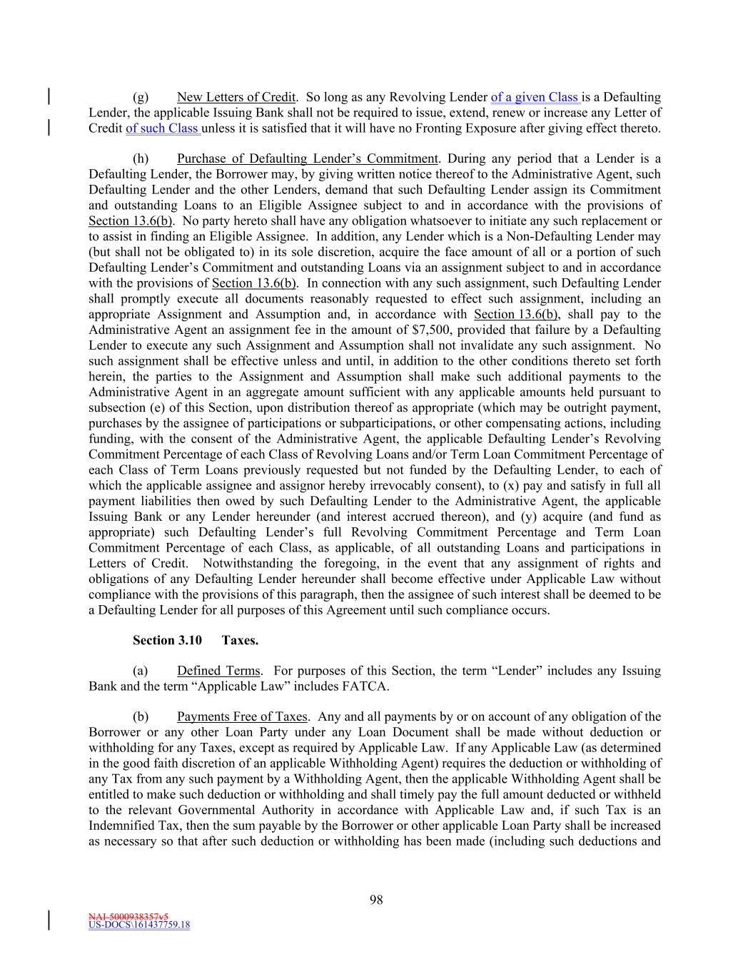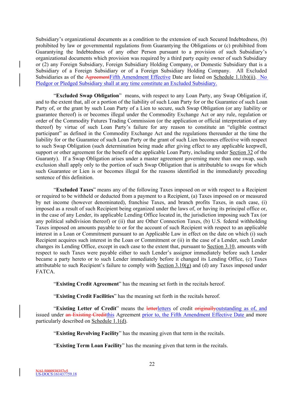 NAI-5000938357v5 US-DOCS\161437759.18 22 Subsidiary’s organizational documents as a condition to the extension of such Secured Indebtedness, (b) prohibited by law or governmental regulations from Guarantying the Obligations or (c) prohibited from Guarantying the Indebtedness of any other Person pursuant to a provision of such Subsidiary’s organizational documents which provision was required by a third party equity owner of such Subsidiary or (2) any Foreign Subsidiary, Foreign Subsidiary Holding Company, or Domestic Subsidiary that is a Subsidiary of a Foreign Subsidiary or of a Foreign Subsidiary Holding Company. All Excluded Subsidiaries as of the AgreementFifth Amendment Effective Date are listed on Schedule 1.1(b)(ii). No Pledgor or Pledged Subsidiary shall at any time constitute an Excluded Subsidiary. “Excluded Swap Obligation” means, with respect to any Loan Party, any Swap Obligation if, and to the extent that, all or a portion of the liability of such Loan Party for or the Guarantee of such Loan Party of, or the grant by such Loan Party of a Lien to secure, such Swap Obligation (or any liability or guarantee thereof) is or becomes illegal under the Commodity Exchange Act or any rule, regulation or order of the Commodity Futures Trading Commission (or the application or official interpretation of any thereof) by virtue of such Loan Party’s failure for any reason to constitute an “eligible contract participant” as defined in the Commodity Exchange Act and the regulations thereunder at the time the liability for or the Guarantee of such Loan Party or the grant of such Lien becomes effective with respect to such Swap Obligation (such determination being made after giving effect to any applicable keepwell, support or other agreement for the benefit of the applicable Loan Party, including under Section 32 of the Guaranty). If a Swap Obligation arises under a master agreement governing more than one swap, such exclusion shall apply only to the portion of such Swap Obligation that is attributable to swaps for which such Guarantee or Lien is or becomes illegal for the reasons identified in the immediately preceding sentence of this definition. “Excluded Taxes” means any of the following Taxes imposed on or with respect to a Recipient or required to be withheld or deducted from a payment to a Recipient, (a) Taxes imposed on or measured by net income (however denominated), franchise Taxes, and branch profits Taxes, in each case, (i) imposed as a result of such Recipient being organized under the laws of, or having its principal office or, in the case of any Lender, its applicable Lending Office located in, the jurisdiction imposing such Tax (or any political subdivision thereof) or (ii) that are Other Connection Taxes, (b) U.S. federal withholding Taxes imposed on amounts payable to or for the account of such Recipient with respect to an applicable interest in a Loan or Commitment pursuant to an Applicable Law in effect on the date on which (i) such Recipient acquires such interest in the Loan or Commitment or (ii) in the case of a Lender, such Lender changes its Lending Office, except in each case to the extent that, pursuant to Section 3.10, amounts with respect to such Taxes were payable either to such Lender’s assignor immediately before such Lender became a party hereto or to such Lender immediately before it changed its Lending Office, (c) Taxes attributable to such Recipient’s failure to comply with Section 3.10(g) and (d) any Taxes imposed under FATCA. “Existing Credit Agreement” has the meaning set forth in the recitals hereof. “Existing Credit Facilities” has the meaning set forth in the recitals hereof. “Existing Letter of Credit” means the letterletters of credit originallyoutstanding as of, and issued under an Existing Creditthis Agreement prior to, the Fifth Amendment Effective Date and more particularly described on Schedule 1.1(d). “Existing Revolving Facility” has the meaning given that term in the recitals. “Existing Term Loan Facility” has the meaning given that term in the recitals.