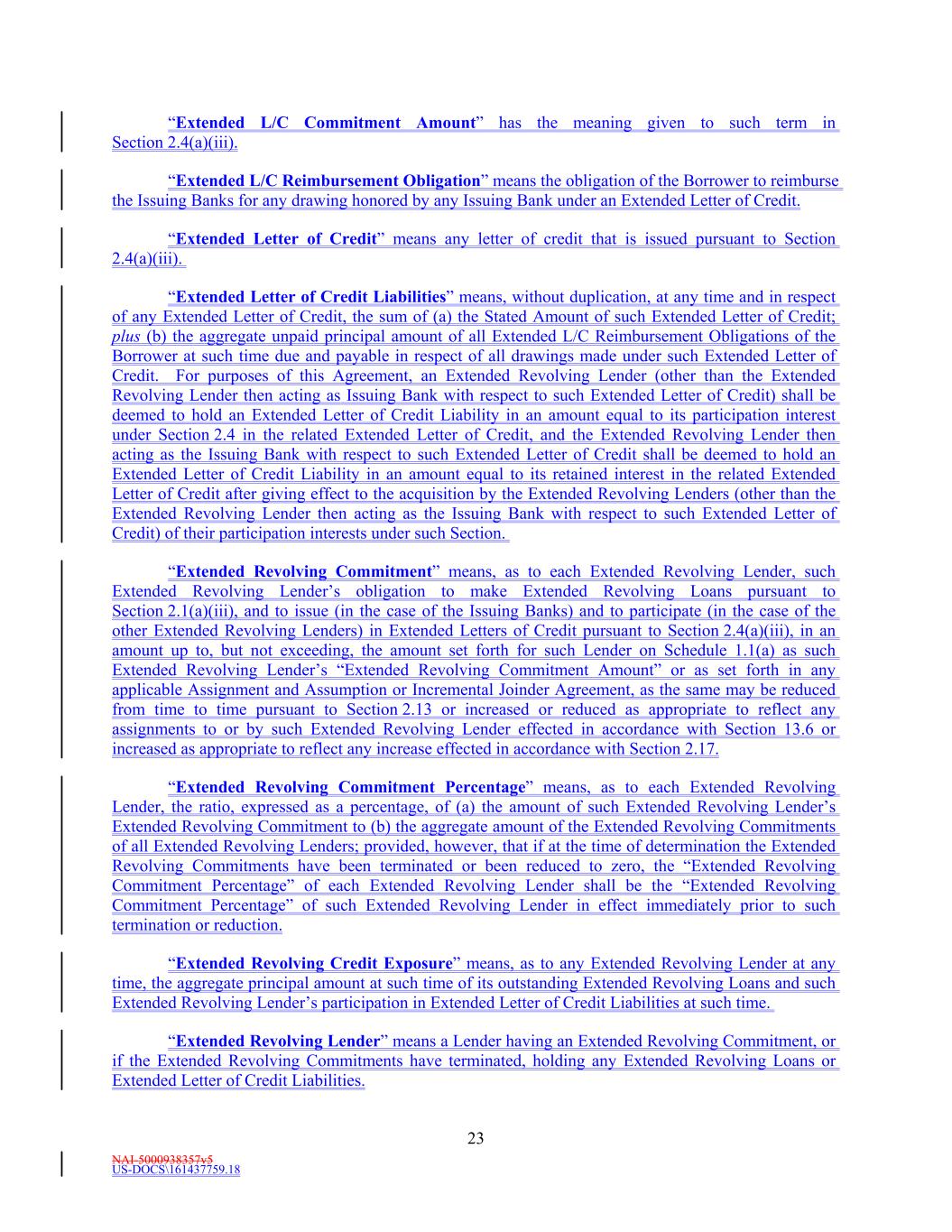 NAI-5000938357v5 US-DOCS\161437759.18 23 “Extended L/C Commitment Amount” has the meaning given to such term in Section 2.4(a)(iii). “Extended L/C Reimbursement Obligation” means the obligation of the Borrower to reimburse the Issuing Banks for any drawing honored by any Issuing Bank under an Extended Letter of Credit. “Extended Letter of Credit” means any letter of credit that is issued pursuant to Section 2.4(a)(iii). “Extended Letter of Credit Liabilities” means, without duplication, at any time and in respect of any Extended Letter of Credit, the sum of (a) the Stated Amount of such Extended Letter of Credit; plus (b) the aggregate unpaid principal amount of all Extended L/C Reimbursement Obligations of the Borrower at such time due and payable in respect of all drawings made under such Extended Letter of Credit. For purposes of this Agreement, an Extended Revolving Lender (other than the Extended Revolving Lender then acting as Issuing Bank with respect to such Extended Letter of Credit) shall be deemed to hold an Extended Letter of Credit Liability in an amount equal to its participation interest under Section 2.4 in the related Extended Letter of Credit, and the Extended Revolving Lender then acting as the Issuing Bank with respect to such Extended Letter of Credit shall be deemed to hold an Extended Letter of Credit Liability in an amount equal to its retained interest in the related Extended Letter of Credit after giving effect to the acquisition by the Extended Revolving Lenders (other than the Extended Revolving Lender then acting as the Issuing Bank with respect to such Extended Letter of Credit) of their participation interests under such Section. “Extended Revolving Commitment” means, as to each Extended Revolving Lender, such Extended Revolving Lender’s obligation to make Extended Revolving Loans pursuant to Section 2.1(a)(iii), and to issue (in the case of the Issuing Banks) and to participate (in the case of the other Extended Revolving Lenders) in Extended Letters of Credit pursuant to Section 2.4(a)(iii), in an amount up to, but not exceeding, the amount set forth for such Lender on Schedule 1.1(a) as such Extended Revolving Lender’s “Extended Revolving Commitment Amount” or as set forth in any applicable Assignment and Assumption or Incremental Joinder Agreement, as the same may be reduced from time to time pursuant to Section 2.13 or increased or reduced as appropriate to reflect any assignments to or by such Extended Revolving Lender effected in accordance with Section 13.6 or increased as appropriate to reflect any increase effected in accordance with Section 2.17. “Extended Revolving Commitment Percentage” means, as to each Extended Revolving Lender, the ratio, expressed as a percentage, of (a) the amount of such Extended Revolving Lender’s Extended Revolving Commitment to (b) the aggregate amount of the Extended Revolving Commitments of all Extended Revolving Lenders; provided, however, that if at the time of determination the Extended Revolving Commitments have been terminated or been reduced to zero, the “Extended Revolving Commitment Percentage” of each Extended Revolving Lender shall be the “Extended Revolving Commitment Percentage” of such Extended Revolving Lender in effect immediately prior to such termination or reduction. “Extended Revolving Credit Exposure” means, as to any Extended Revolving Lender at any time, the aggregate principal amount at such time of its outstanding Extended Revolving Loans and such Extended Revolving Lender’s participation in Extended Letter of Credit Liabilities at such time. “Extended Revolving Lender” means a Lender having an Extended Revolving Commitment, or if the Extended Revolving Commitments have terminated, holding any Extended Revolving Loans or Extended Letter of Credit Liabilities.