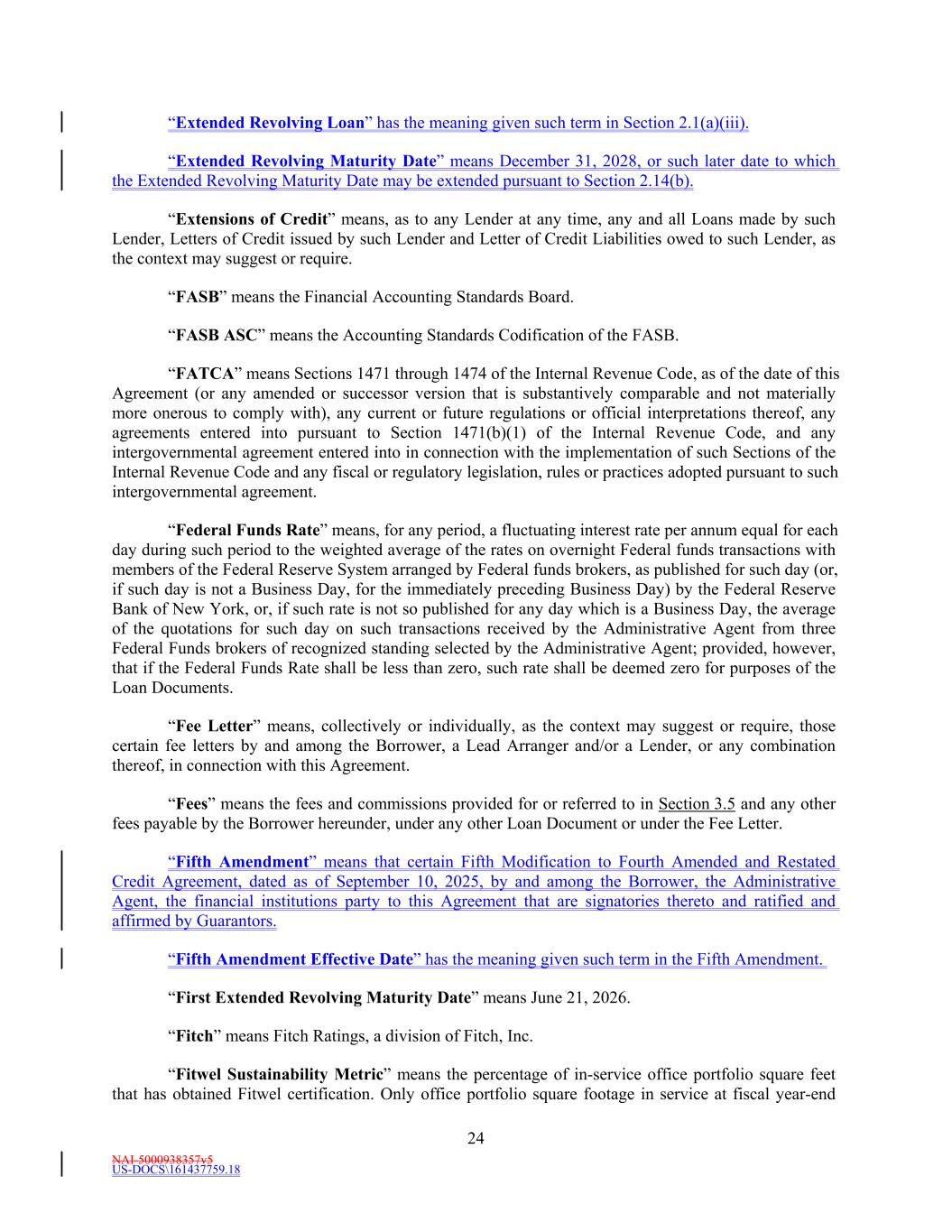 NAI-5000938357v5 US-DOCS\161437759.18 24 “Extended Revolving Loan” has the meaning given such term in Section 2.1(a)(iii). “Extended Revolving Maturity Date” means December 31, 2028, or such later date to which the Extended Revolving Maturity Date may be extended pursuant to Section 2.14(b). “Extensions of Credit” means, as to any Lender at any time, any and all Loans made by such Lender, Letters of Credit issued by such Lender and Letter of Credit Liabilities owed to such Lender, as the context may suggest or require. “FASB” means the Financial Accounting Standards Board. “FASB ASC” means the Accounting Standards Codification of the FASB. “FATCA” means Sections 1471 through 1474 of the Internal Revenue Code, as of the date of this Agreement (or any amended or successor version that is substantively comparable and not materially more onerous to comply with), any current or future regulations or official interpretations thereof, any agreements entered into pursuant to Section 1471(b)(1) of the Internal Revenue Code, and any intergovernmental agreement entered into in connection with the implementation of such Sections of the Internal Revenue Code and any fiscal or regulatory legislation, rules or practices adopted pursuant to such intergovernmental agreement. “Federal Funds Rate” means, for any period, a fluctuating interest rate per annum equal for each day during such period to the weighted average of the rates on overnight Federal funds transactions with members of the Federal Reserve System arranged by Federal funds brokers, as published for such day (or, if such day is not a Business Day, for the immediately preceding Business Day) by the Federal Reserve Bank of New York, or, if such rate is not so published for any day which is a Business Day, the average of the quotations for such day on such transactions received by the Administrative Agent from three Federal Funds brokers of recognized standing selected by the Administrative Agent; provided, however, that if the Federal Funds Rate shall be less than zero, such rate shall be deemed zero for purposes of the Loan Documents. “Fee Letter” means, collectively or individually, as the context may suggest or require, those certain fee letters by and among the Borrower, a Lead Arranger and/or a Lender, or any combination thereof, in connection with this Agreement. “Fees” means the fees and commissions provided for or referred to in Section 3.5 and any other fees payable by the Borrower hereunder, under any other Loan Document or under the Fee Letter. “Fifth Amendment” means that certain Fifth Modification to Fourth Amended and Restated Credit Agreement, dated as of September 10, 2025, by and among the Borrower, the Administrative Agent, the financial institutions party to this Agreement that are signatories thereto and ratified and affirmed by Guarantors. “Fifth Amendment Effective Date” has the meaning given such term in the Fifth Amendment. “First Extended Revolving Maturity Date” means June 21, 2026. “Fitch” means Fitch Ratings, a division of Fitch, Inc. “Fitwel Sustainability Metric” means the percentage of in-service office portfolio square feet that has obtained Fitwel certification. Only office portfolio square footage in service at fiscal year-end