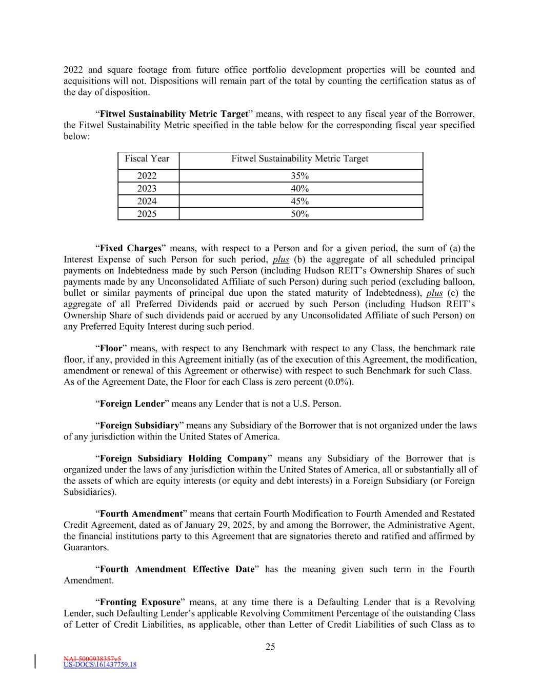 NAI-5000938357v5 25 US-DOCS\161437759.18 2024 45% 2022 2025 35% 50% Fiscal Year “Fixed Charges” means, with respect to a Person and for a given period, the sum of (a) the Interest Expense of such Person for such period, plus (b) the aggregate of all scheduled principal payments on Indebtedness made by such Person (including Hudson REIT’s Ownership Shares of such payments made by any Unconsolidated Affiliate of such Person) during such period (excluding balloon, bullet or similar payments of principal due upon the stated maturity of Indebtedness), plus (c) the aggregate of all Preferred Dividends paid or accrued by such Person (including Hudson REIT’s Ownership Share of such dividends paid or accrued by any Unconsolidated Affiliate of such Person) on any Preferred Equity Interest during such period. “Floor” means, with respect to any Benchmark with respect to any Class, the benchmark rate floor, if any, provided in this Agreement initially (as of the execution of this Agreement, the modification, amendment or renewal of this Agreement or otherwise) with respect to such Benchmark for such Class. As of the Agreement Date, the Floor for each Class is zero percent (0.0%). “Foreign Lender” means any Lender that is not a U.S. Person. “Foreign Subsidiary” means any Subsidiary of the Borrower that is not organized under the laws of any jurisdiction within the United States of America. “Foreign Subsidiary Holding Company” means any Subsidiary of the Borrower that is organized under the laws of any jurisdiction within the United States of America, all or substantially all of the assets of which are equity interests (or equity and debt interests) in a Foreign Subsidiary (or Foreign Subsidiaries). “Fourth Amendment” means that certain Fourth Modification to Fourth Amended and Restated Credit Agreement, dated as of January 29, 2025, by and among the Borrower, the Administrative Agent, the financial institutions party to this Agreement that are signatories thereto and ratified and affirmed by Guarantors. “Fourth Amendment Effective Date” has the meaning given such term in the Fourth Amendment. “Fronting Exposure” means, at any time there is a Defaulting Lender that is a Revolving Lender, such Defaulting Lender’s applicable Revolving Commitment Percentage of the outstanding Class of Letter of Credit Liabilities, as applicable, other than Letter of Credit Liabilities of such Class as to 2023 Fitwel Sustainability Metric Target 40% 2022 and square footage from future office portfolio development properties will be counted and acquisitions will not. Dispositions will remain part of the total by counting the certification status as of the day of disposition. “Fitwel Sustainability Metric Target” means, with respect to any fiscal year of the Borrower, the Fitwel Sustainability Metric specified in the table below for the corresponding fiscal year specified below: