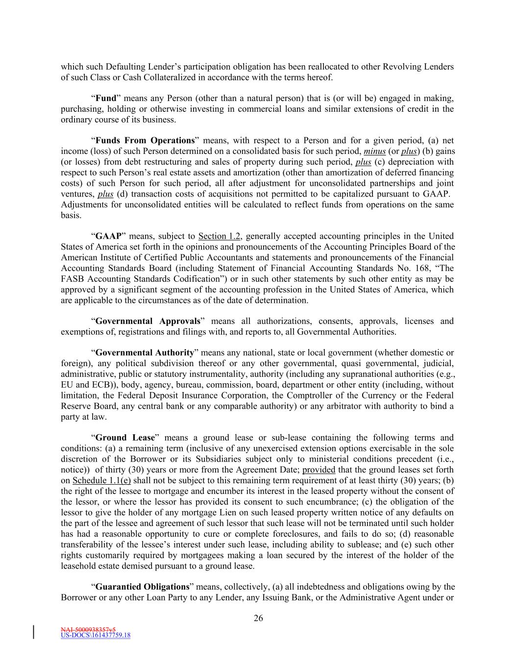 NAI-5000938357v5 US-DOCS\161437759.18 26 which such Defaulting Lender’s participation obligation has been reallocated to other Revolving Lenders of such Class or Cash Collateralized in accordance with the terms hereof. “Fund” means any Person (other than a natural person) that is (or will be) engaged in making, purchasing, holding or otherwise investing in commercial loans and similar extensions of credit in the ordinary course of its business. “Funds From Operations” means, with respect to a Person and for a given period, (a) net income (loss) of such Person determined on a consolidated basis for such period, minus (or plus) (b) gains (or losses) from debt restructuring and sales of property during such period, plus (c) depreciation with respect to such Person’s real estate assets and amortization (other than amortization of deferred financing costs) of such Person for such period, all after adjustment for unconsolidated partnerships and joint ventures, plus (d) transaction costs of acquisitions not permitted to be capitalized pursuant to GAAP. Adjustments for unconsolidated entities will be calculated to reflect funds from operations on the same basis. “GAAP” means, subject to Section 1.2, generally accepted accounting principles in the United States of America set forth in the opinions and pronouncements of the Accounting Principles Board of the American Institute of Certified Public Accountants and statements and pronouncements of the Financial Accounting Standards Board (including Statement of Financial Accounting Standards No. 168, “The FASB Accounting Standards Codification”) or in such other statements by such other entity as may be approved by a significant segment of the accounting profession in the United States of America, which are applicable to the circumstances as of the date of determination. “Governmental Approvals” means all authorizations, consents, approvals, licenses and exemptions of, registrations and filings with, and reports to, all Governmental Authorities. “Governmental Authority” means any national, state or local government (whether domestic or foreign), any political subdivision thereof or any other governmental, quasi governmental, judicial, administrative, public or statutory instrumentality, authority (including any supranational authorities (e.g., EU and ECB)), body, agency, bureau, commission, board, department or other entity (including, without limitation, the Federal Deposit Insurance Corporation, the Comptroller of the Currency or the Federal Reserve Board, any central bank or any comparable authority) or any arbitrator with authority to bind a party at law. “Ground Lease” means a ground lease or sub-lease containing the following terms and conditions: (a) a remaining term (inclusive of any unexercised extension options exercisable in the sole discretion of the Borrower or its Subsidiaries subject only to ministerial conditions precedent (i.e., notice)) of thirty (30) years or more from the Agreement Date; provided that the ground leases set forth on Schedule 1.1(e) shall not be subject to this remaining term requirement of at least thirty (30) years; (b) the right of the lessee to mortgage and encumber its interest in the leased property without the consent of the lessor, or where the lessor has provided its consent to such encumbrance; (c) the obligation of the lessor to give the holder of any mortgage Lien on such leased property written notice of any defaults on the part of the lessee and agreement of such lessor that such lease will not be terminated until such holder has had a reasonable opportunity to cure or complete foreclosures, and fails to do so; (d) reasonable transferability of the lessee’s interest under such lease, including ability to sublease; and (e) such other rights customarily required by mortgagees making a loan secured by the interest of the holder of the leasehold estate demised pursuant to a ground lease. “Guarantied Obligations” means, collectively, (a) all indebtedness and obligations owing by the Borrower or any other Loan Party to any Lender, any Issuing Bank, or the Administrative Agent under or