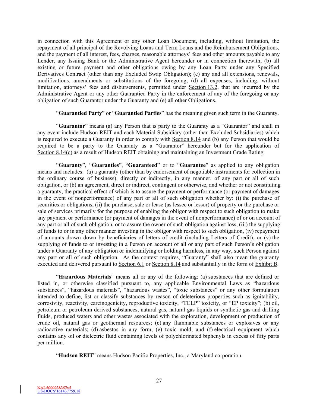 NAI-5000938357v5 US-DOCS\161437759.18 27 in connection with this Agreement or any other Loan Document, including, without limitation, the repayment of all principal of the Revolving Loans and Term Loans and the Reimbursement Obligations, and the payment of all interest, fees, charges, reasonable attorneys’ fees and other amounts payable to any Lender, any Issuing Bank or the Administrative Agent hereunder or in connection therewith; (b) all existing or future payment and other obligations owing by any Loan Party under any Specified Derivatives Contract (other than any Excluded Swap Obligation); (c) any and all extensions, renewals, modifications, amendments or substitutions of the foregoing; (d) all expenses, including, without limitation, attorneys’ fees and disbursements, permitted under Section 13.2, that are incurred by the Administrative Agent or any other Guarantied Party in the enforcement of any of the foregoing or any obligation of such Guarantor under the Guaranty and (e) all other Obligations. “Guarantied Party” or “Guarantied Parties” has the meaning given such term in the Guaranty. “Guarantor” means (a) any Person that is party to the Guaranty as a “Guarantor” and shall in any event include Hudson REIT and each Material Subsidiary (other than Excluded Subsidiaries) which is required to execute a Guaranty in order to comply with Section 8.14 and (b) any Person that would be required to be a party to the Guaranty as a “Guarantor” hereunder but for the application of Section 8.14(c) as a result of Hudson REIT obtaining and maintaining an Investment Grade Rating. “Guaranty”, “Guaranties”, “Guaranteed” or to “Guarantee” as applied to any obligation means and includes: (a) a guaranty (other than by endorsement of negotiable instruments for collection in the ordinary course of business), directly or indirectly, in any manner, of any part or all of such obligation, or (b) an agreement, direct or indirect, contingent or otherwise, and whether or not constituting a guaranty, the practical effect of which is to assure the payment or performance (or payment of damages in the event of nonperformance) of any part or all of such obligation whether by: (i) the purchase of securities or obligations, (ii) the purchase, sale or lease (as lessee or lessor) of property or the purchase or sale of services primarily for the purpose of enabling the obligor with respect to such obligation to make any payment or performance (or payment of damages in the event of nonperformance) of or on account of any part or all of such obligation, or to assure the owner of such obligation against loss, (iii) the supplying of funds to or in any other manner investing in the obligor with respect to such obligation, (iv) repayment of amounts drawn down by beneficiaries of letters of credit (including Letters of Credit), or (v) the supplying of funds to or investing in a Person on account of all or any part of such Person’s obligation under a Guaranty of any obligation or indemnifying or holding harmless, in any way, such Person against any part or all of such obligation. As the context requires, “Guaranty” shall also mean the guaranty executed and delivered pursuant to Section 6.1 or Section 8.14 and substantially in the form of Exhibit B. “Hazardous Materials” means all or any of the following: (a) substances that are defined or listed in, or otherwise classified pursuant to, any applicable Environmental Laws as “hazardous substances”, “hazardous materials”, “hazardous wastes”, “toxic substances” or any other formulation intended to define, list or classify substances by reason of deleterious properties such as ignitability, corrosivity, reactivity, carcinogenicity, reproductive toxicity, “TCLP” toxicity, or “EP toxicity”; (b) oil, petroleum or petroleum derived substances, natural gas, natural gas liquids or synthetic gas and drilling fluids, produced waters and other wastes associated with the exploration, development or production of crude oil, natural gas or geothermal resources; (c) any flammable substances or explosives or any radioactive materials; (d) asbestos in any form; (e) toxic mold; and (f) electrical equipment which contains any oil or dielectric fluid containing levels of polychlorinated biphenyls in excess of fifty parts per million. “Hudson REIT” means Hudson Pacific Properties, Inc., a Maryland corporation.