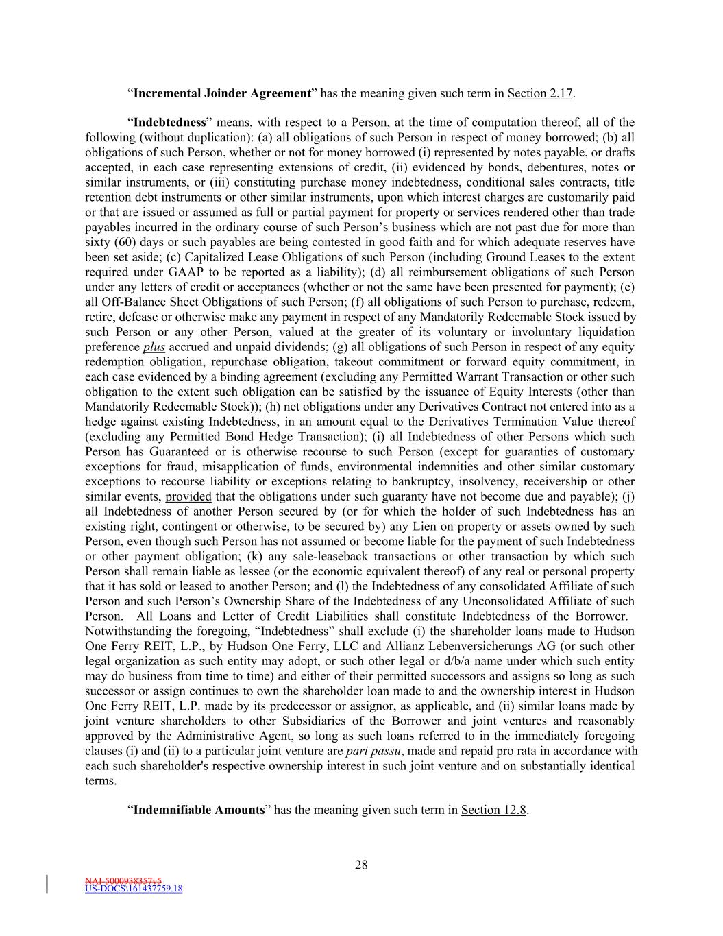 NAI-5000938357v5 US-DOCS\161437759.18 28 “Incremental Joinder Agreement” has the meaning given such term in Section 2.17. “Indebtedness” means, with respect to a Person, at the time of computation thereof, all of the following (without duplication): (a) all obligations of such Person in respect of money borrowed; (b) all obligations of such Person, whether or not for money borrowed (i) represented by notes payable, or drafts accepted, in each case representing extensions of credit, (ii) evidenced by bonds, debentures, notes or similar instruments, or (iii) constituting purchase money indebtedness, conditional sales contracts, title retention debt instruments or other similar instruments, upon which interest charges are customarily paid or that are issued or assumed as full or partial payment for property or services rendered other than trade payables incurred in the ordinary course of such Person’s business which are not past due for more than sixty (60) days or such payables are being contested in good faith and for which adequate reserves have been set aside; (c) Capitalized Lease Obligations of such Person (including Ground Leases to the extent required under GAAP to be reported as a liability); (d) all reimbursement obligations of such Person under any letters of credit or acceptances (whether or not the same have been presented for payment); (e) all Off-Balance Sheet Obligations of such Person; (f) all obligations of such Person to purchase, redeem, retire, defease or otherwise make any payment in respect of any Mandatorily Redeemable Stock issued by such Person or any other Person, valued at the greater of its voluntary or involuntary liquidation preference plus accrued and unpaid dividends; (g) all obligations of such Person in respect of any equity redemption obligation, repurchase obligation, takeout commitment or forward equity commitment, in each case evidenced by a binding agreement (excluding any Permitted Warrant Transaction or other such obligation to the extent such obligation can be satisfied by the issuance of Equity Interests (other than Mandatorily Redeemable Stock)); (h) net obligations under any Derivatives Contract not entered into as a hedge against existing Indebtedness, in an amount equal to the Derivatives Termination Value thereof (excluding any Permitted Bond Hedge Transaction); (i) all Indebtedness of other Persons which such Person has Guaranteed or is otherwise recourse to such Person (except for guaranties of customary exceptions for fraud, misapplication of funds, environmental indemnities and other similar customary exceptions to recourse liability or exceptions relating to bankruptcy, insolvency, receivership or other similar events, provided that the obligations under such guaranty have not become due and payable); (j) all Indebtedness of another Person secured by (or for which the holder of such Indebtedness has an existing right, contingent or otherwise, to be secured by) any Lien on property or assets owned by such Person, even though such Person has not assumed or become liable for the payment of such Indebtedness or other payment obligation; (k) any sale-leaseback transactions or other transaction by which such Person shall remain liable as lessee (or the economic equivalent thereof) of any real or personal property that it has sold or leased to another Person; and (l) the Indebtedness of any consolidated Affiliate of such Person and such Person’s Ownership Share of the Indebtedness of any Unconsolidated Affiliate of such Person. All Loans and Letter of Credit Liabilities shall constitute Indebtedness of the Borrower. Notwithstanding the foregoing, “Indebtedness” shall exclude (i) the shareholder loans made to Hudson One Ferry REIT, L.P., by Hudson One Ferry, LLC and Allianz Lebenversicherungs AG (or such other legal organization as such entity may adopt, or such other legal or d/b/a name under which such entity may do business from time to time) and either of their permitted successors and assigns so long as such successor or assign continues to own the shareholder loan made to and the ownership interest in Hudson One Ferry REIT, L.P. made by its predecessor or assignor, as applicable, and (ii) similar loans made by joint venture shareholders to other Subsidiaries of the Borrower and joint ventures and reasonably approved by the Administrative Agent, so long as such loans referred to in the immediately foregoing clauses (i) and (ii) to a particular joint venture are pari passu, made and repaid pro rata in accordance with each such shareholder's respective ownership interest in such joint venture and on substantially identical terms. “Indemnifiable Amounts” has the meaning given such term in Section 12.8.