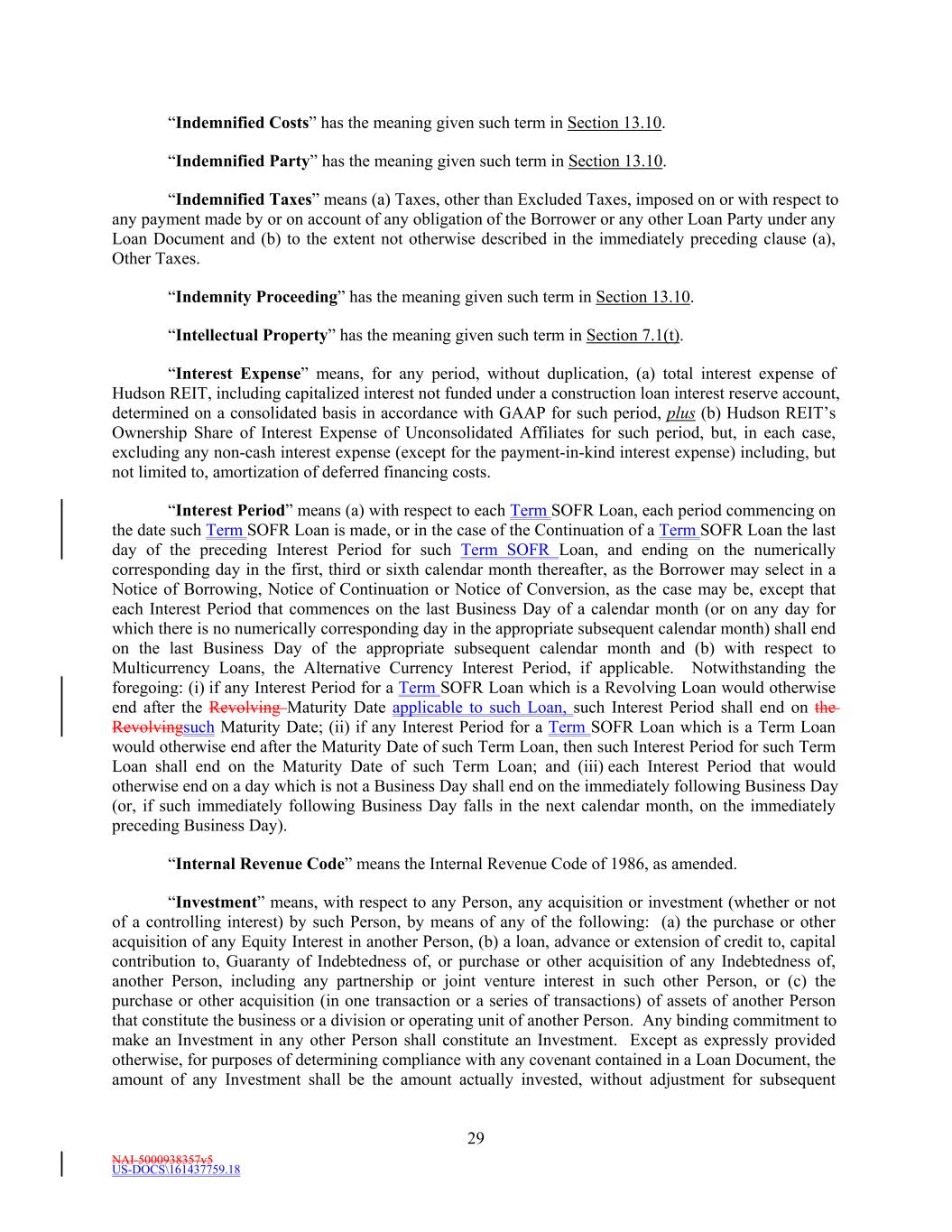 NAI-5000938357v5 US-DOCS\161437759.18 29 “Indemnified Costs” has the meaning given such term in Section 13.10. “Indemnified Party” has the meaning given such term in Section 13.10. “Indemnified Taxes” means (a) Taxes, other than Excluded Taxes, imposed on or with respect to any payment made by or on account of any obligation of the Borrower or any other Loan Party under any Loan Document and (b) to the extent not otherwise described in the immediately preceding clause (a), Other Taxes. “Indemnity Proceeding” has the meaning given such term in Section 13.10. “Intellectual Property” has the meaning given such term in Section 7.1(t). “Interest Expense” means, for any period, without duplication, (a) total interest expense of Hudson REIT, including capitalized interest not funded under a construction loan interest reserve account, determined on a consolidated basis in accordance with GAAP for such period, plus (b) Hudson REIT’s Ownership Share of Interest Expense of Unconsolidated Affiliates for such period, but, in each case, excluding any non-cash interest expense (except for the payment-in-kind interest expense) including, but not limited to, amortization of deferred financing costs. “Interest Period” means (a) with respect to each Term SOFR Loan, each period commencing on the date such Term SOFR Loan is made, or in the case of the Continuation of a Term SOFR Loan the last day of the preceding Interest Period for such Term SOFR Loan, and ending on the numerically corresponding day in the first, third or sixth calendar month thereafter, as the Borrower may select in a Notice of Borrowing, Notice of Continuation or Notice of Conversion, as the case may be, except that each Interest Period that commences on the last Business Day of a calendar month (or on any day for which there is no numerically corresponding day in the appropriate subsequent calendar month) shall end on the last Business Day of the appropriate subsequent calendar month and (b) with respect to Multicurrency Loans, the Alternative Currency Interest Period, if applicable. Notwithstanding the foregoing: (i) if any Interest Period for a Term SOFR Loan which is a Revolving Loan would otherwise end after the Revolving Maturity Date applicable to such Loan, such Interest Period shall end on the Revolvingsuch Maturity Date; (ii) if any Interest Period for a Term SOFR Loan which is a Term Loan would otherwise end after the Maturity Date of such Term Loan, then such Interest Period for such Term Loan shall end on the Maturity Date of such Term Loan; and (iii) each Interest Period that would otherwise end on a day which is not a Business Day shall end on the immediately following Business Day (or, if such immediately following Business Day falls in the next calendar month, on the immediately preceding Business Day). “Internal Revenue Code” means the Internal Revenue Code of 1986, as amended. “Investment” means, with respect to any Person, any acquisition or investment (whether or not of a controlling interest) by such Person, by means of any of the following: (a) the purchase or other acquisition of any Equity Interest in another Person, (b) a loan, advance or extension of credit to, capital contribution to, Guaranty of Indebtedness of, or purchase or other acquisition of any Indebtedness of, another Person, including any partnership or joint venture interest in such other Person, or (c) the purchase or other acquisition (in one transaction or a series of transactions) of assets of another Person that constitute the business or a division or operating unit of another Person. Any binding commitment to make an Investment in any other Person shall constitute an Investment. Except as expressly provided otherwise, for purposes of determining compliance with any covenant contained in a Loan Document, the amount of any Investment shall be the amount actually invested, without adjustment for subsequent