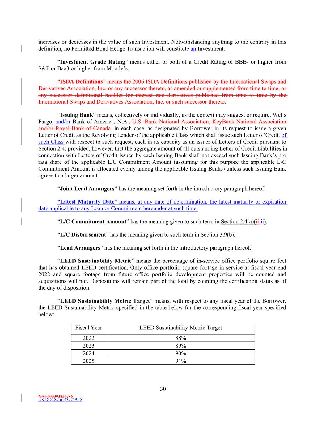 NAI-5000938357v5 30 US-DOCS\161437759.18 2024 90% 2022 2025 88% 91% Fiscal Year 2023 LEED Sustainability Metric Target 89% increases or decreases in the value of such Investment. Notwithstanding anything to the contrary in this definition, no Permitted Bond Hedge Transaction will constitute an Investment. “Investment Grade Rating” means either or both of a Credit Rating of BBB- or higher from S&P or Baa3 or higher from Moody’s. “ISDA Definitions” means the 2006 ISDA Definitions published by the International Swaps and Derivatives Association, Inc. or any successor thereto, as amended or supplemented from time to time, or any successor definitional booklet for interest rate derivatives published from time to time by the International Swaps and Derivatives Association, Inc. or such successor thereto. “Issuing Bank” means, collectively or individually, as the context may suggest or require, Wells Fargo, and/or Bank of America, N.A., U.S. Bank National Association, KeyBank National Association and/or Royal Bank of Canada, in each case, as designated by Borrower in its request to issue a given Letter of Credit as the Revolving Lender of the applicable Class which shall issue such Letter of Credit of such Class with respect to such request, each in its capacity as an issuer of Letters of Credit pursuant to Section 2.4; provided, however, that the aggregate amount of all outstanding Letter of Credit Liabilities in connection with Letters of Credit issued by each Issuing Bank shall not exceed such Issuing Bank’s pro rata share of the applicable L/C Commitment Amount (assuming for this purpose the applicable L/C Commitment Amount is allocated evenly among the applicable Issuing Banks) unless such Issuing Bank agrees to a larger amount. “Joint Lead Arrangers” has the meaning set forth in the introductory paragraph hereof. “Latest Maturity Date” means, at any date of determination, the latest maturity or expiration date applicable to any Loan or Commitment hereunder at such time. “L/C Commitment Amount” has the meaning given to such term in Section 2.4(a)(iiiii). “L/C Disbursement” has the meaning given to such term in Section 3.9(b). “Lead Arrangers” has the meaning set forth in the introductory paragraph hereof. “LEED Sustainability Metric” means the percentage of in-service office portfolio square feet that has obtained LEED certification. Only office portfolio square footage in service at fiscal year-end 2022 and square footage from future office portfolio development properties will be counted and acquisitions will not. Dispositions will remain part of the total by counting the certification status as of the day of disposition. “LEED Sustainability Metric Target” means, with respect to any fiscal year of the Borrower, the LEED Sustainability Metric specified in the table below for the corresponding fiscal year specified below: